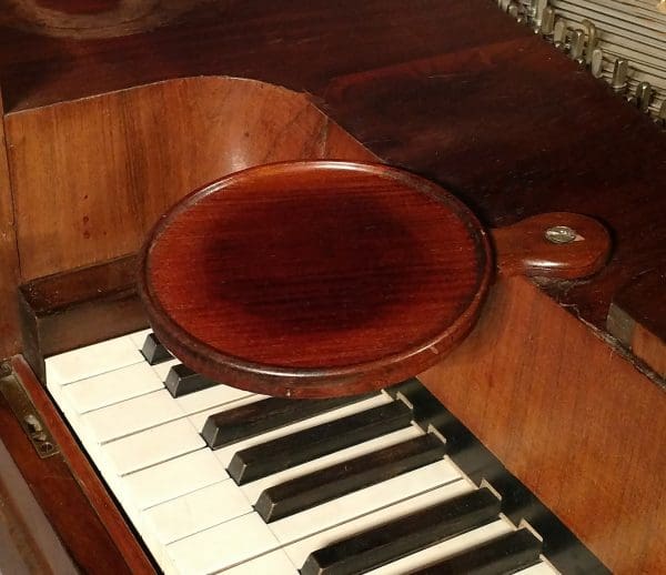 This lovely piano is made of exotic vertical-grain rosewood and is of the Empire Revival style. Note the lovely candle holders on either side of the music rack which would illuminate the sheet music for the pianist. This instrument has a soft “harp-like” tone quality that is often reflected in period movies like “Pride & Prejudice” and “Little Women”. Instruments by Andre’ Stein are very rare here in the United States.