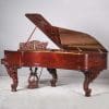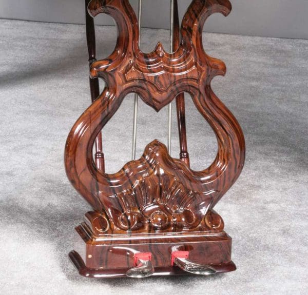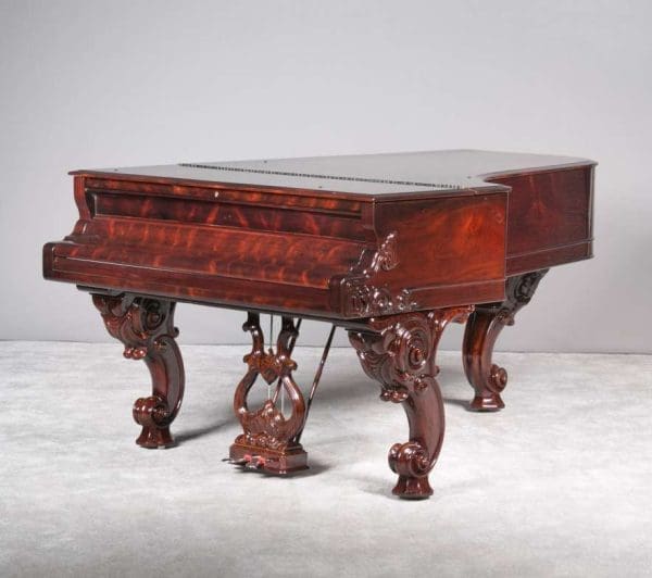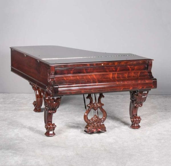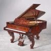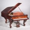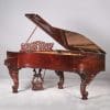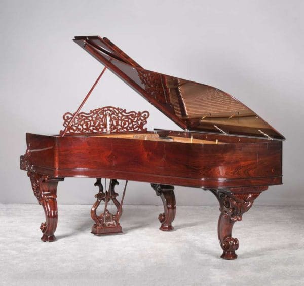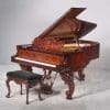 This instrument is made of the desirable cabriole leg style with carved music rack and pedal lyre. It is beautifully executed in highly polished Brazilian Rosewood with exotic burl wood accents and inlay.