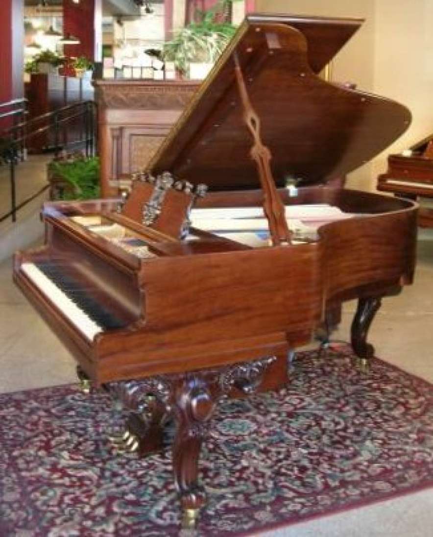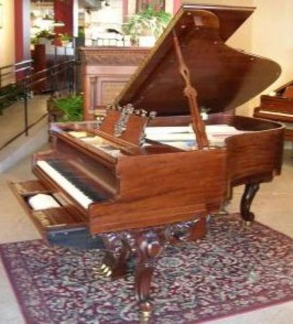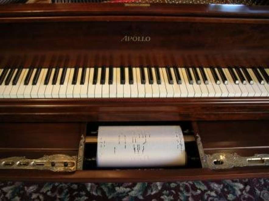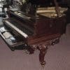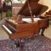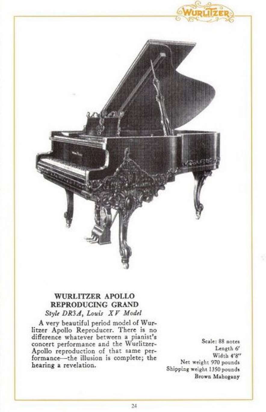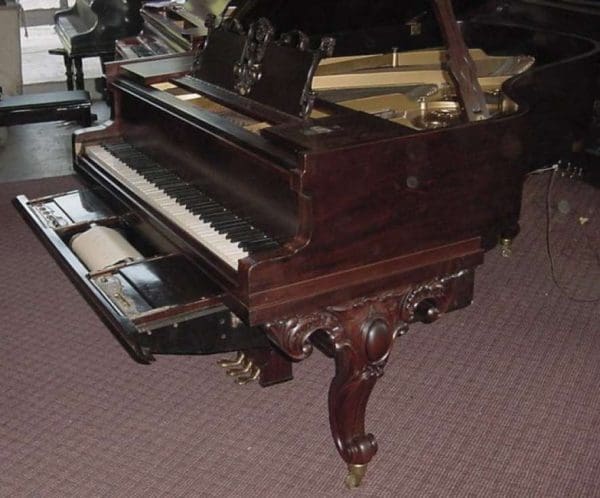 Very ornate reproducing player grand piano by the Apollo Piano Company. This piano was built after Wurlitzer had assumed control of the Apollo name. It is very unusual for a reproducing grand piano because it has single carved cabriole legs instead of the more common double legged feature of most player grand pianos.