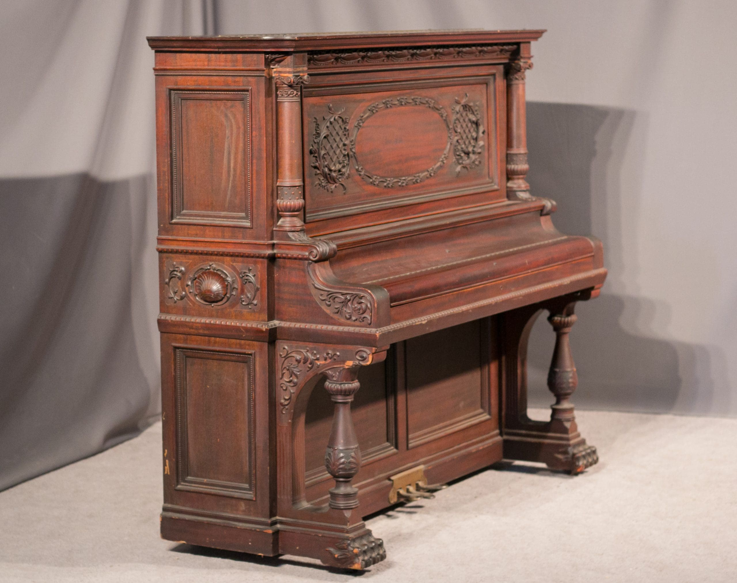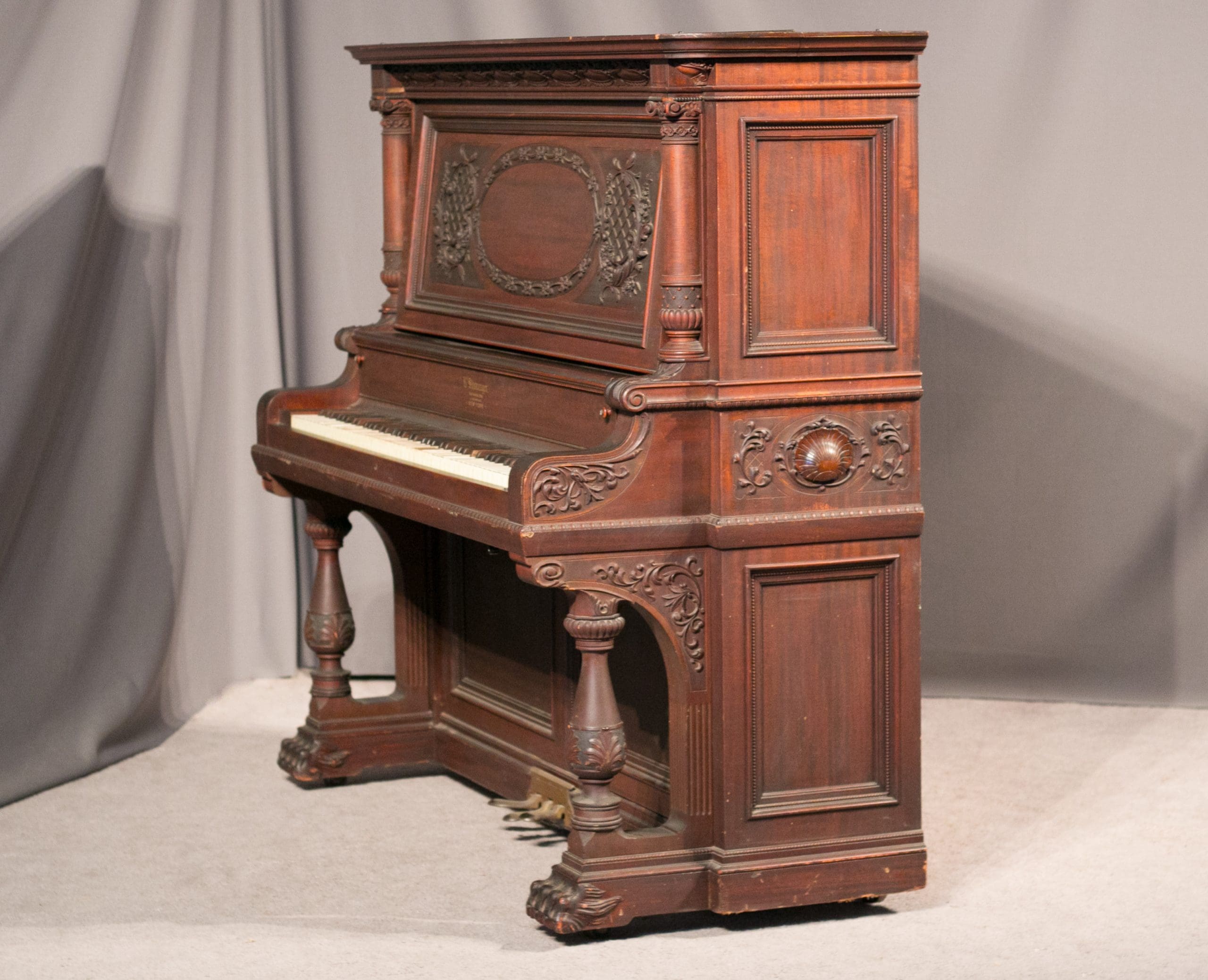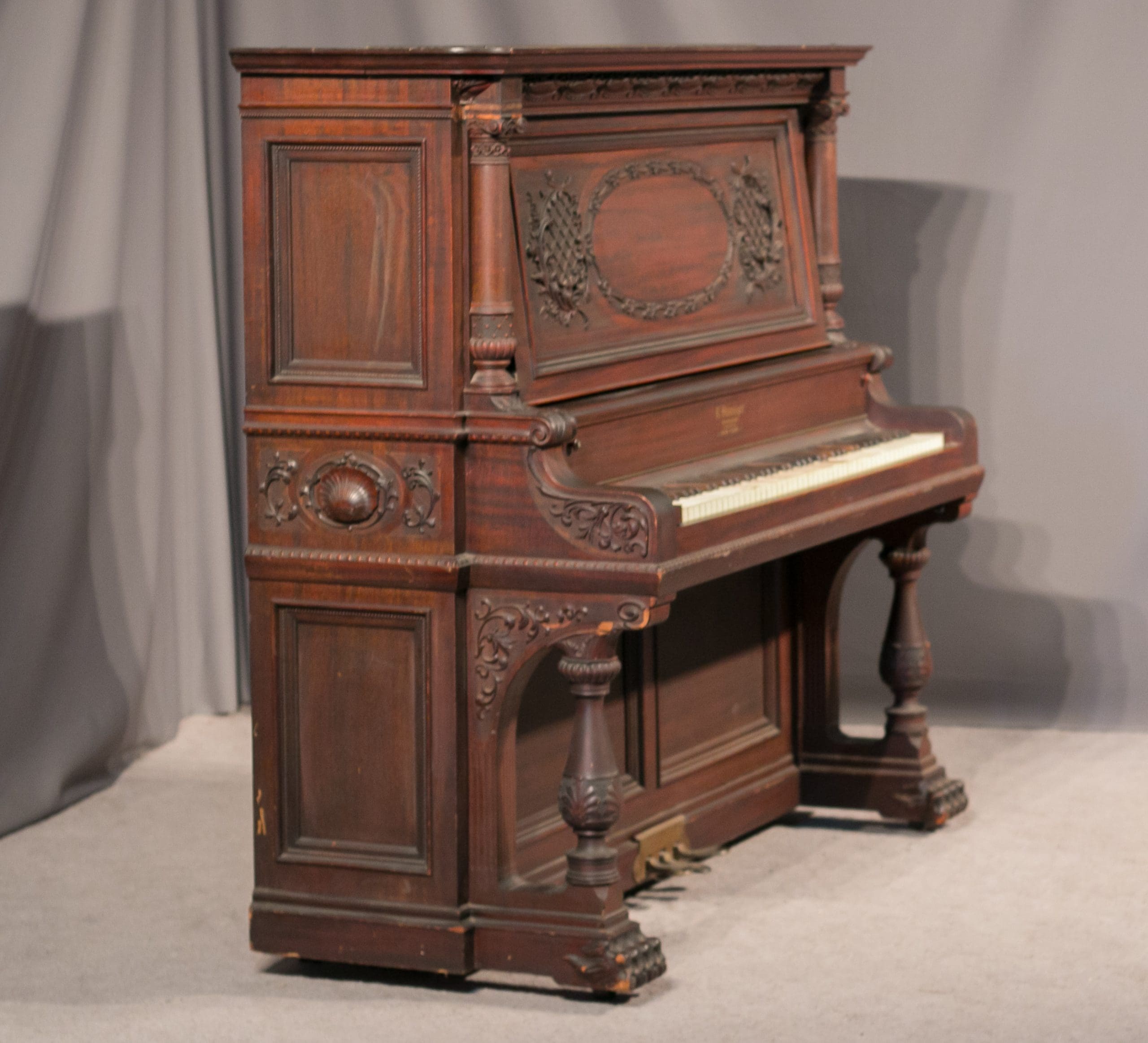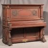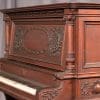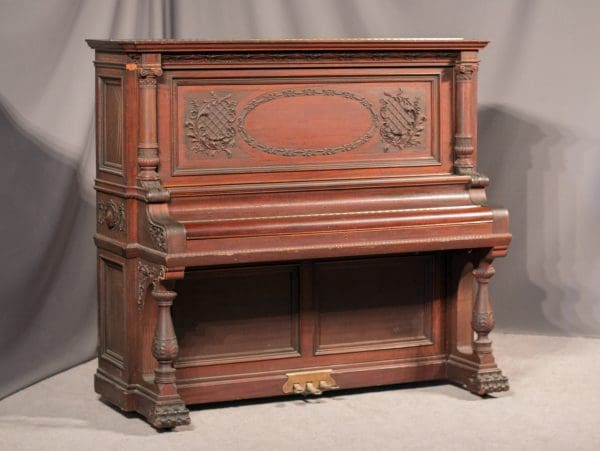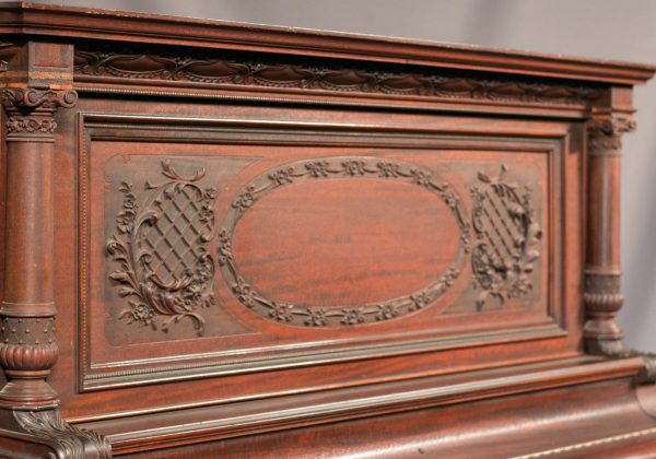 This piano is made of beautiful imported Honduran Mahogany wood with exquisitely carved panels, moldings and trusses. One can only imagine how beautiful this piano will be after professional restoration! The instrument is quite large and handsome in person, yet it maintains a formal and elegant overall appearance. Not only is this instrument a beautiful piece of furniture, but it is a quality musical instrument. This piano is a large, full size “upright grand” with string length and soundboard size larger than a baby grand! The tone quality of the instrument is rich and powerful, making it suitable for a discriminating pianist.