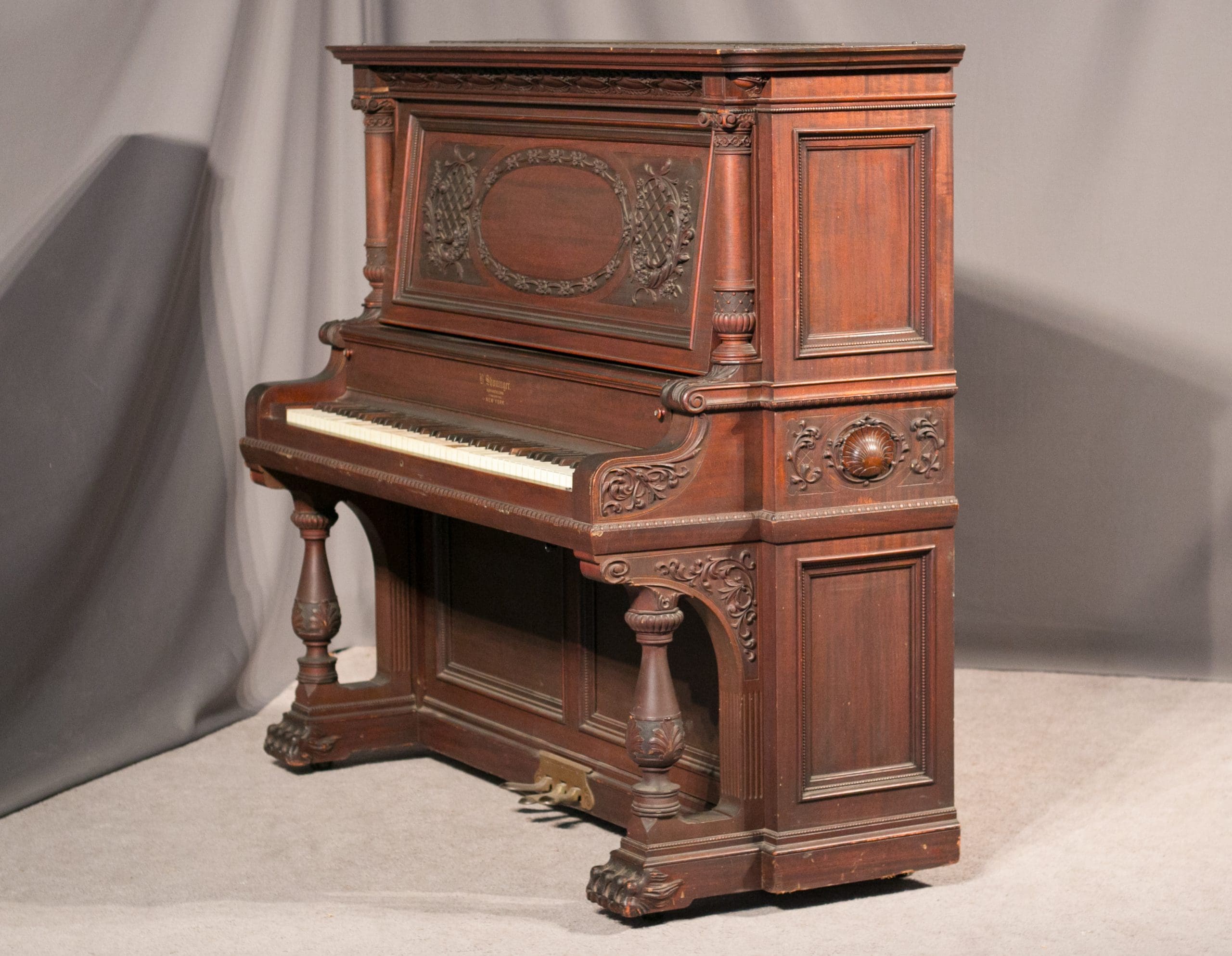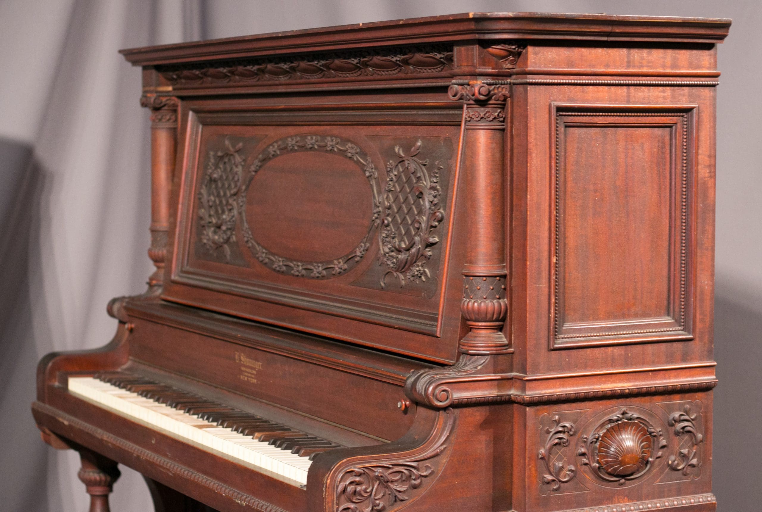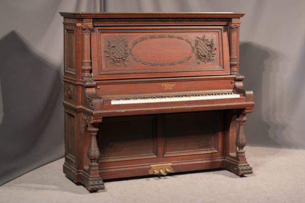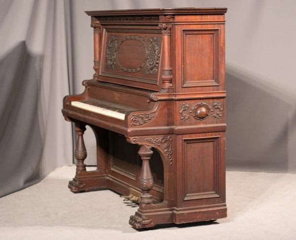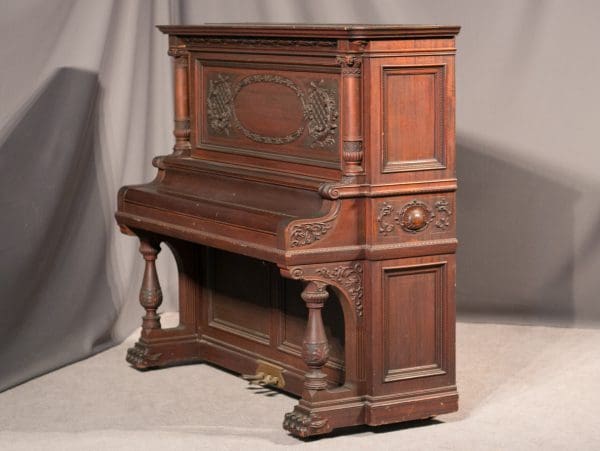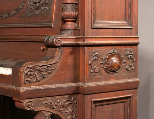 The Shoninger Louis XV “Salon” Upright Piano is one of the most elaborate and beautifully carved American upright piano model ever produced. Bernard Shoninger built high quality, expensive pianos from 1850-1929, and the quality and tone of their instruments are known to rival some of the finest brand names ever produced. Shoninger’s Louis XV “Salon” Upright Piano was the highest-grade, most expensive upright piano in the Shoninger product line with a cost at several hundred dollars when new – the cost of a small house!