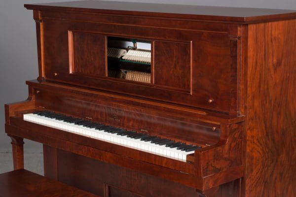 This is a classic Becker Brothers upright player piano from the 1920’s period. It is made of beautiful book-matched walnut wood and is of the Mission style. The use of walnut in these player pianos was less common than mahogany and oak, and walnut was generally used in higher-end, more expensive instruments.