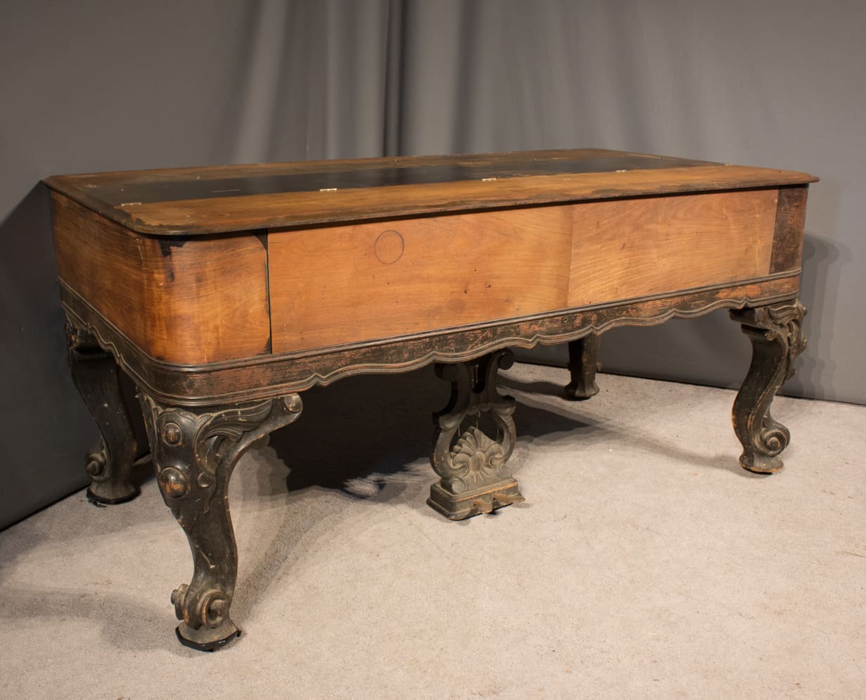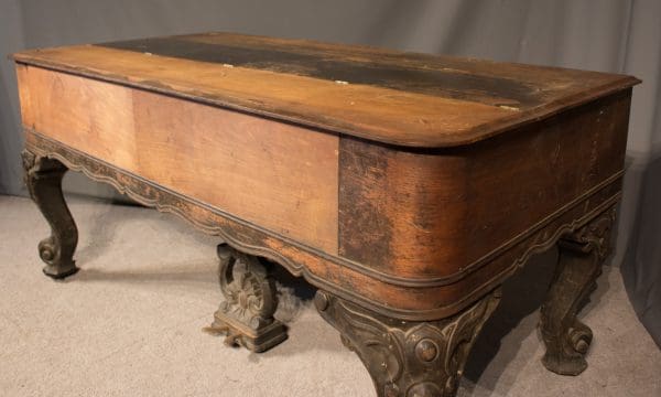 This Behining square grand piano is made of exotic-grain Brazilian Rosewood and is made in the carved Rococo Victorian style. The instrument boasts a full 88-note keyboard which was a costly option available on these later square grand pianos.