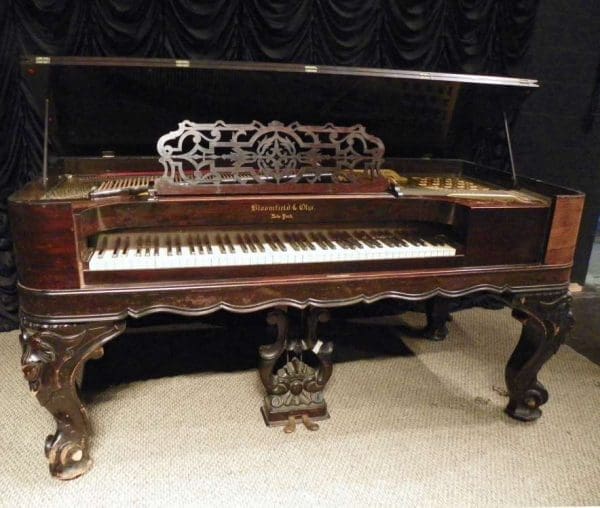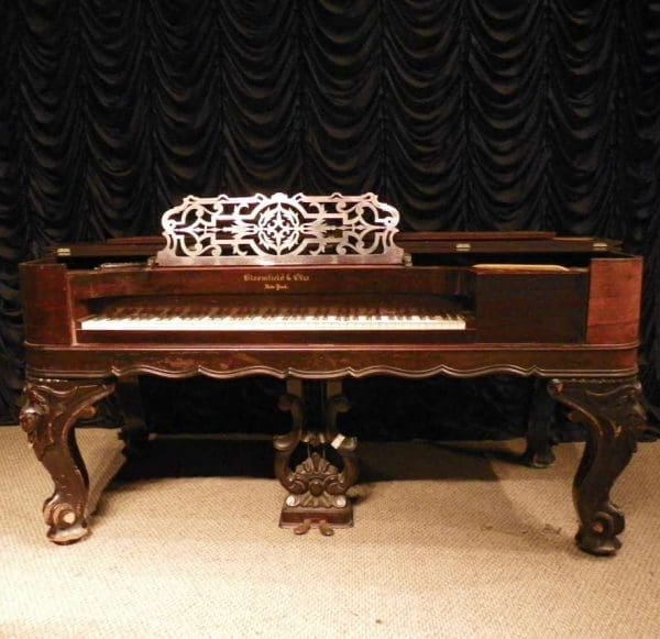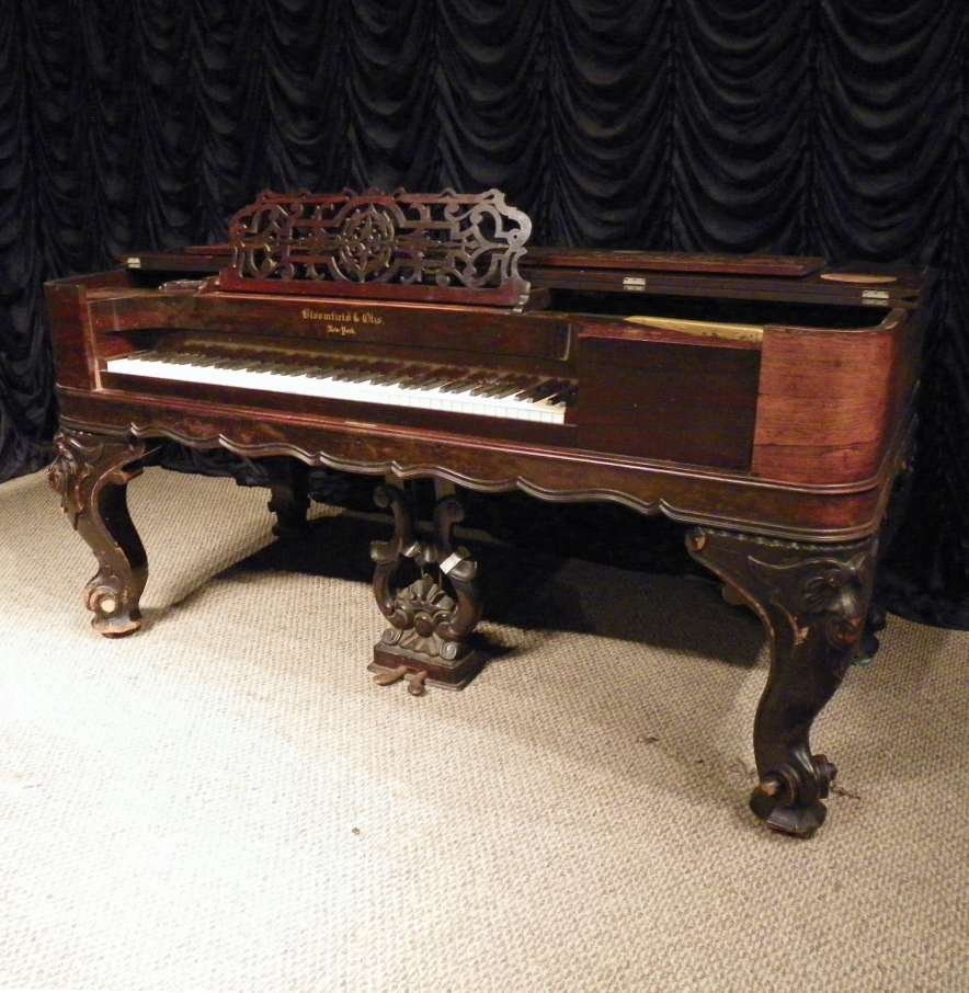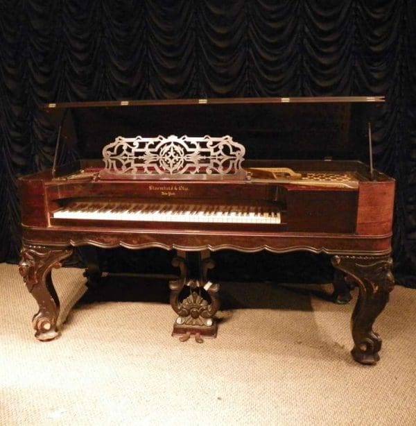 Although Bloomfield & Otis built pianos of very high quality, their instruments were never built in large numbers so they are very rare today. This instrument is a beautiful example of a classic Bloomfield & Otis Square Grand from the post-Civil War era. This piano is made of lovely Brazilian Rosewood and is in the elegantly carved Rococo Victorian style. The instrument is being restored back to it’s “factory new” condition, including the lovely Brazilian Rosewood finish.An authentic period piano stool is included.
