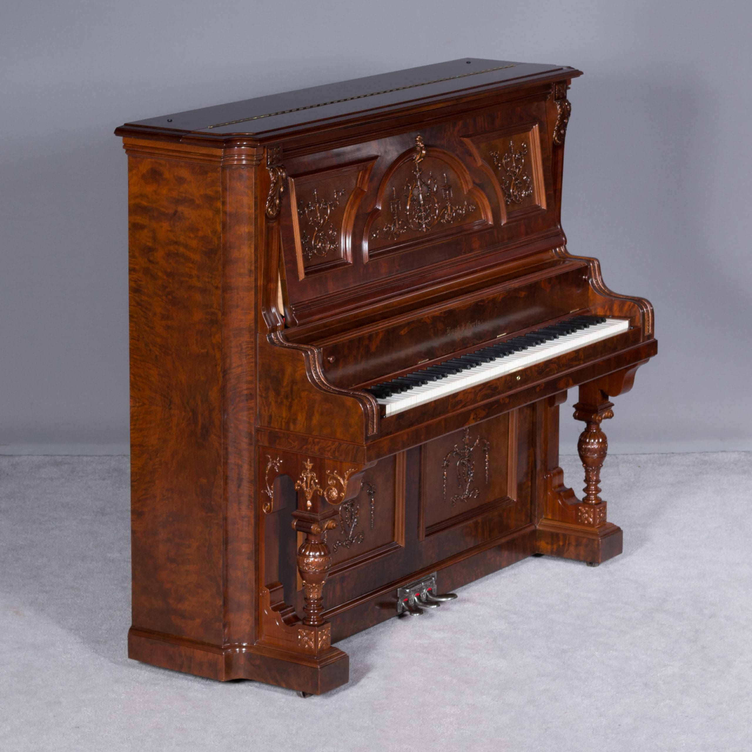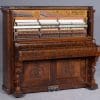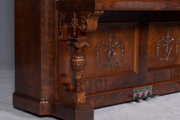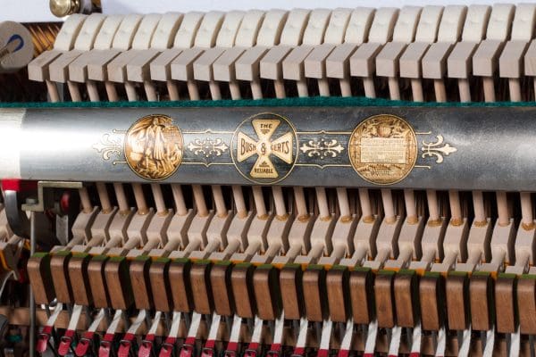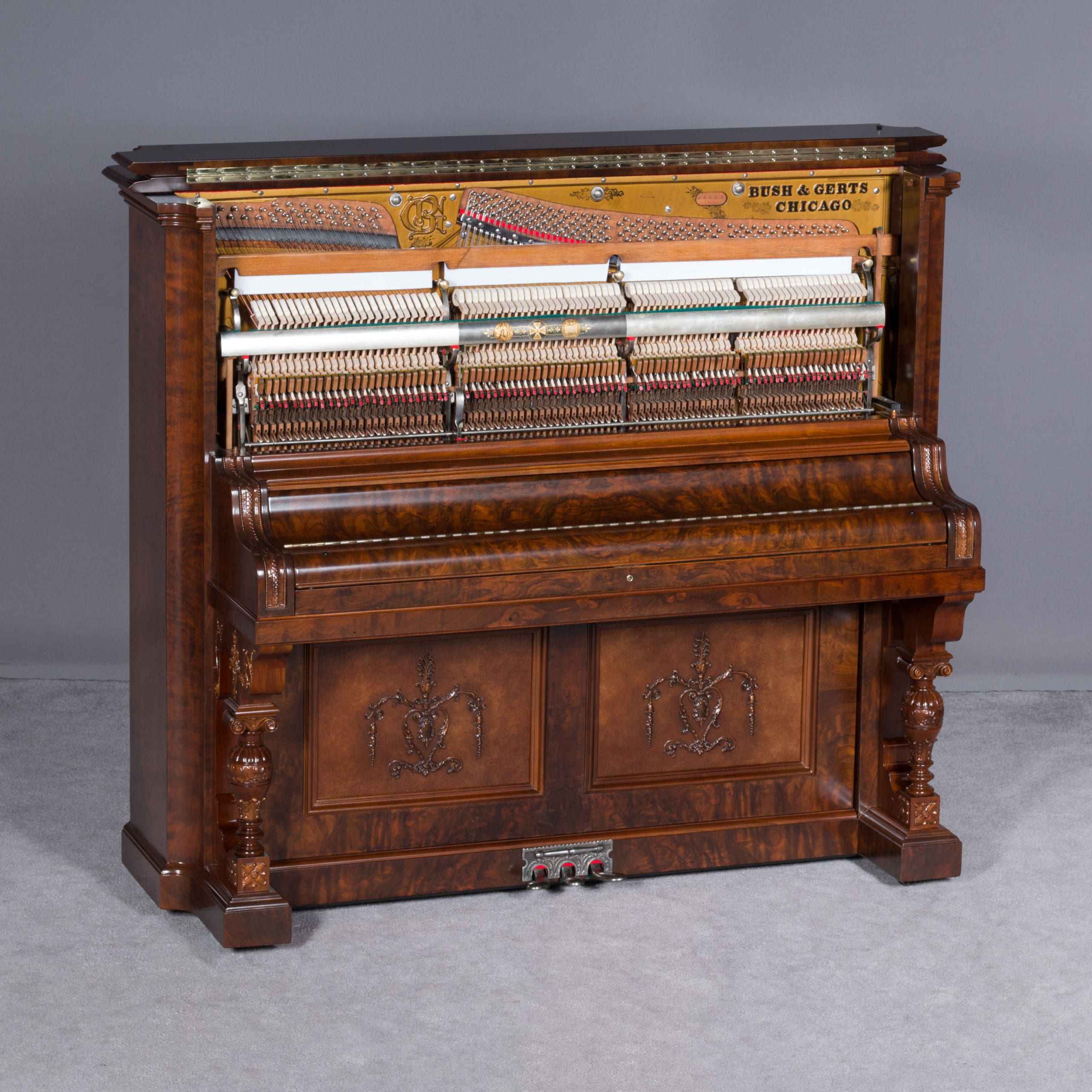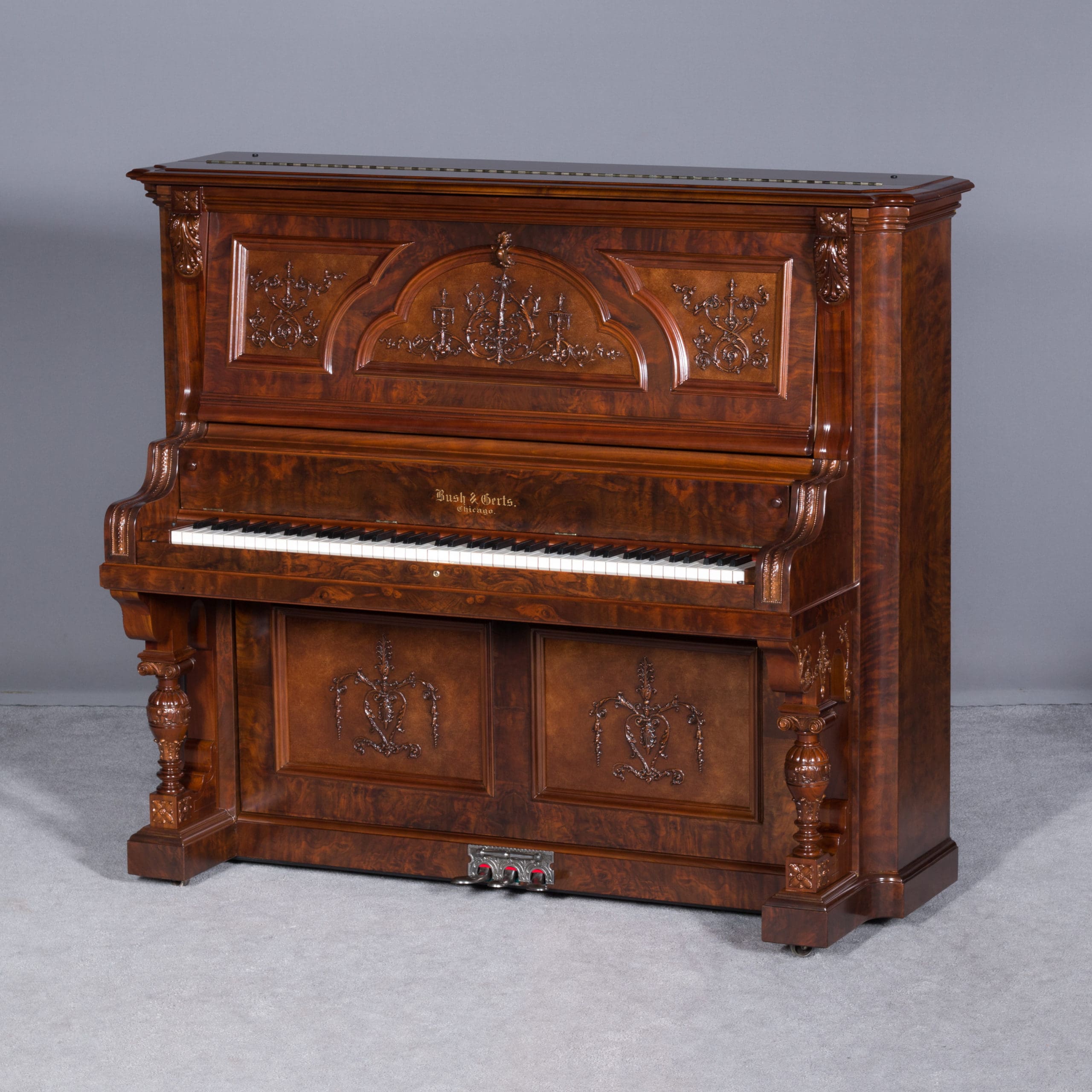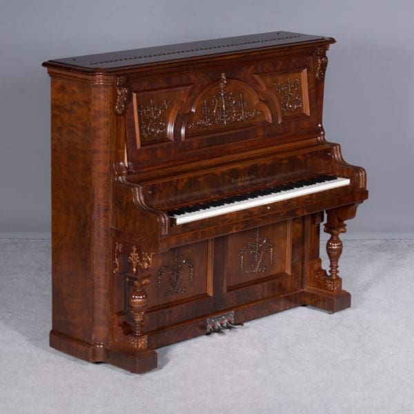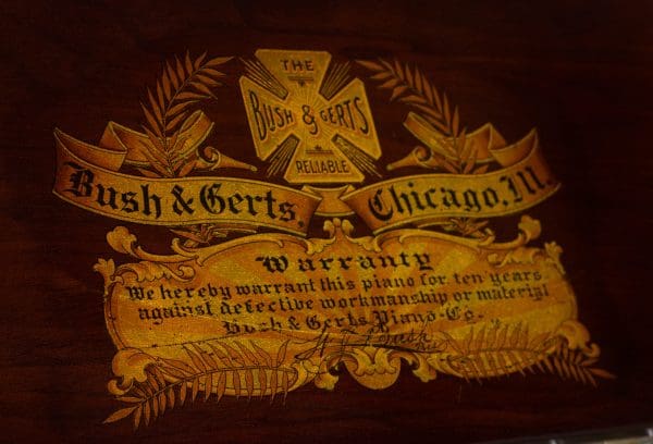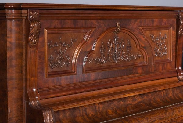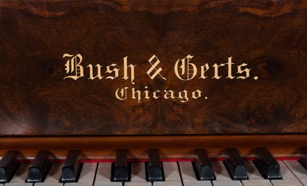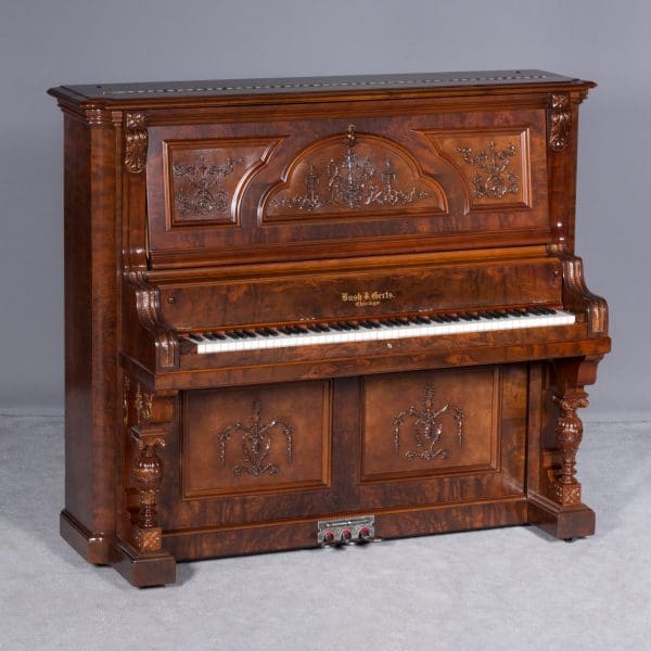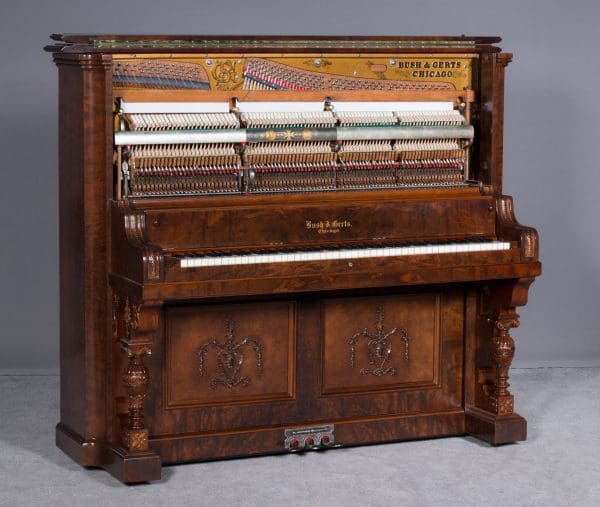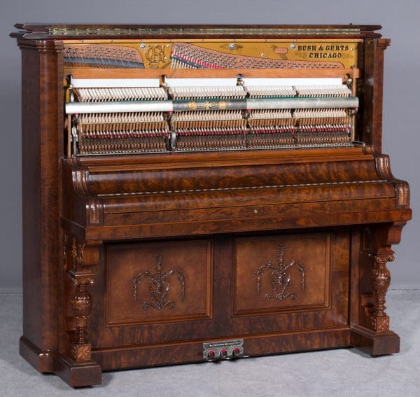 This beautiful piano was built by the prominent Bush & Gerts Piano Company of Chicago in 1902. Bush & Gerts built very expensive, high quality pianos from 1885 until 1942. This piano is one of the most elaborate upright piano models built by Bush & Gerts – it was considered the highest grade and would have been very expensive when new. Pianos like this would have cost the equivalent of a small house of the era! It boasts beautifully carved inset panels and elaborate moldings around the case, all made in the finest mottled burl walnut wood. The tone quality of this piano is tremendous, which isn’t surprising for a Bush & Gerts instrument. An original matching stool is included. This piano can be fitted with a computerized player mechanism if desired.