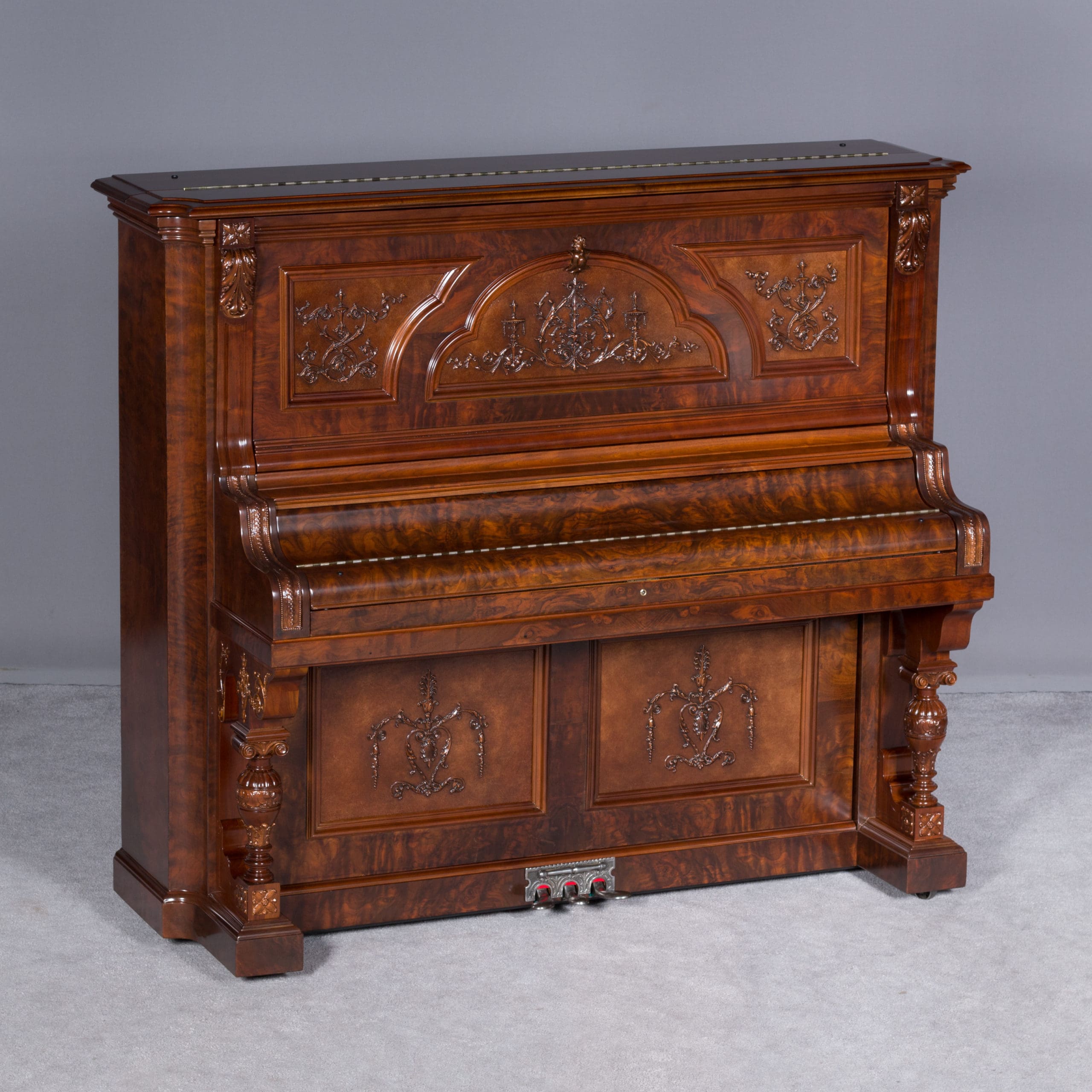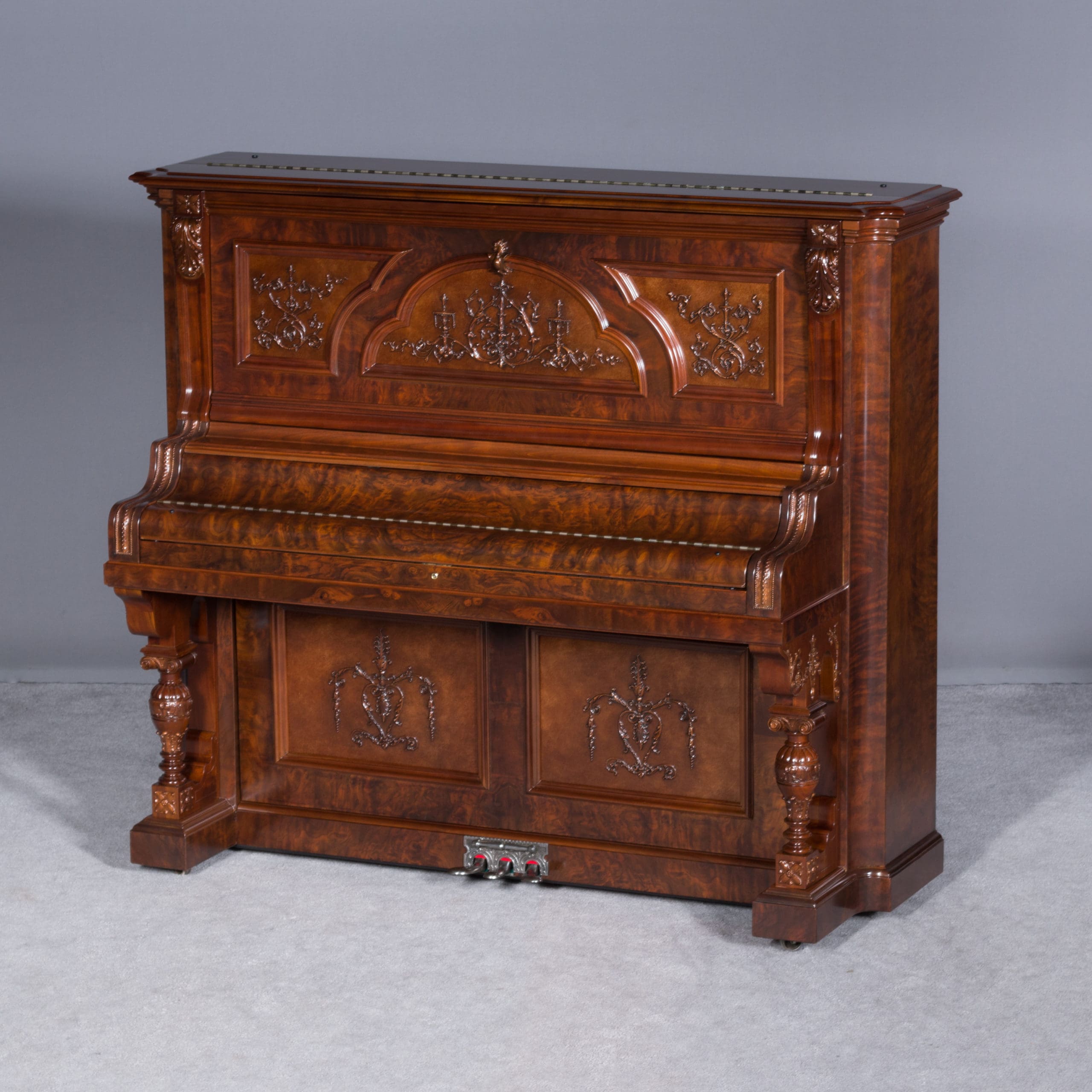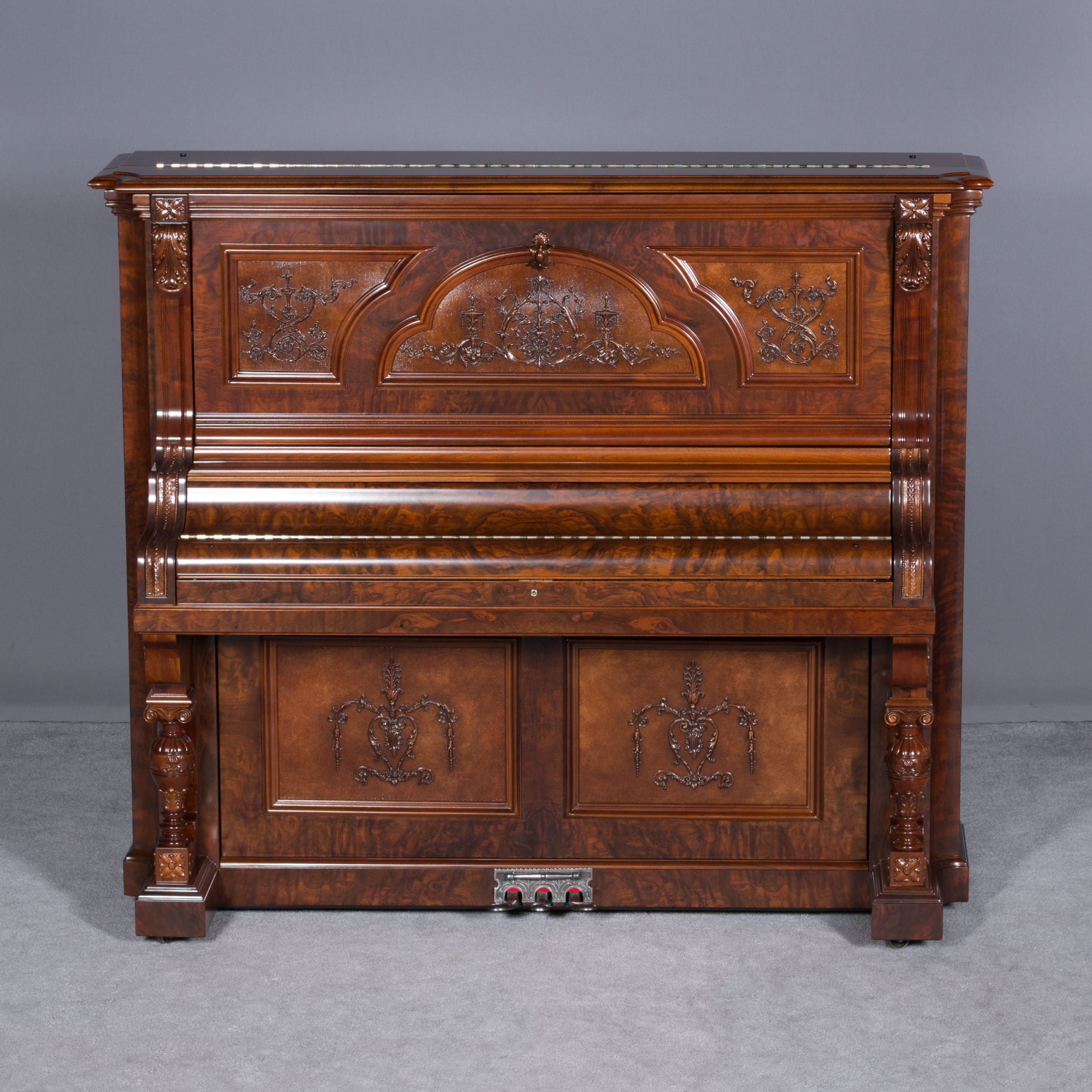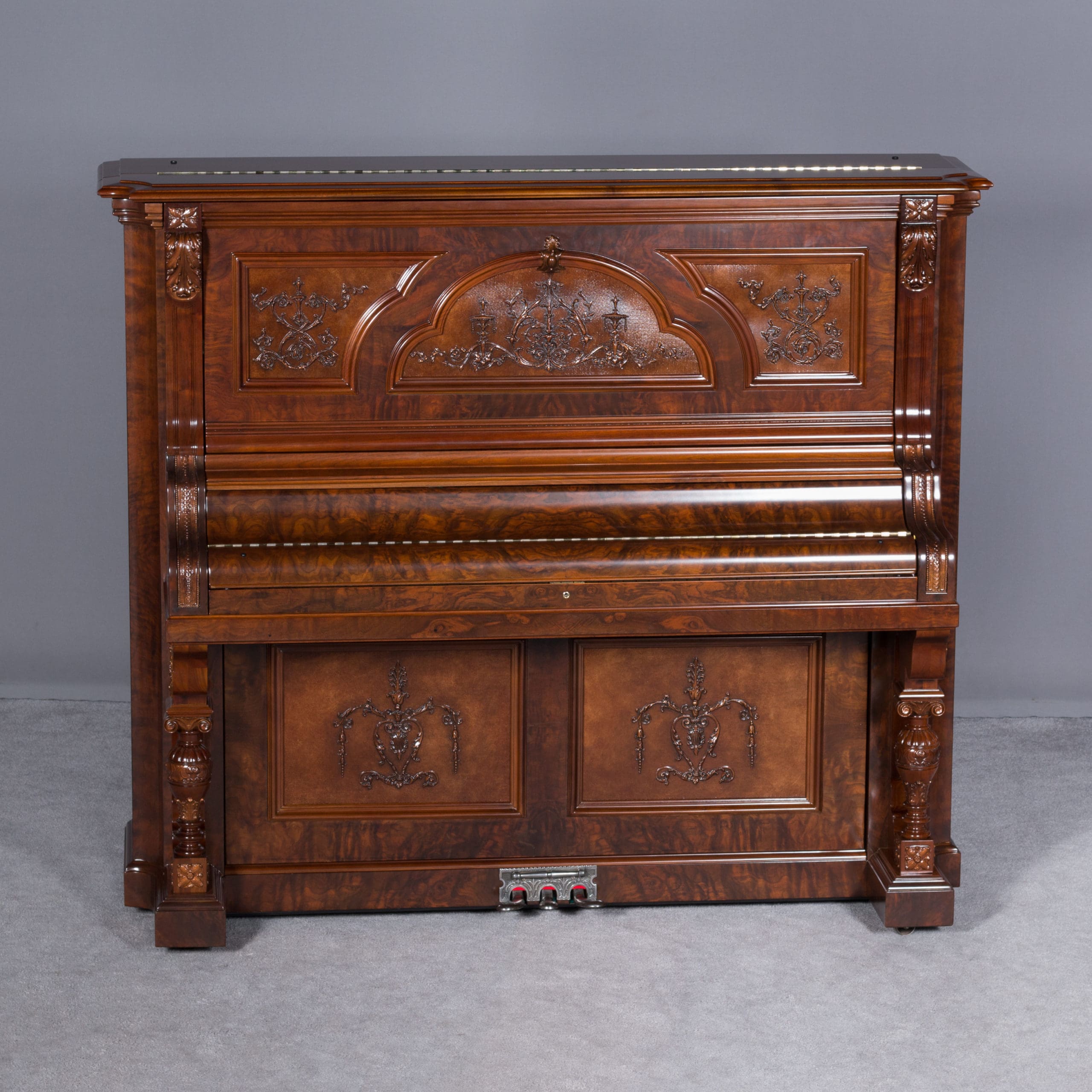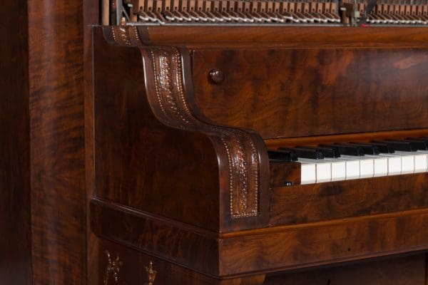 This beautiful piano was built by the prominent Bush & Gerts Piano Company of Chicago in 1902. Bush & Gerts built very expensive, high quality pianos from 1885 until 1942. This piano is one of the most elaborate upright piano models built by Bush & Gerts – it was considered the highest grade and would have been very expensive when new. Pianos like this would have cost the equivalent of a small house of the era! It boasts beautifully carved inset panels and elaborate moldings around the case, all made in the finest mottled burl walnut wood. The tone quality of this piano is tremendous, which isn’t surprising for a Bush & Gerts instrument. An original matching stool is included. This piano can be fitted with a computerized player mechanism if desired.