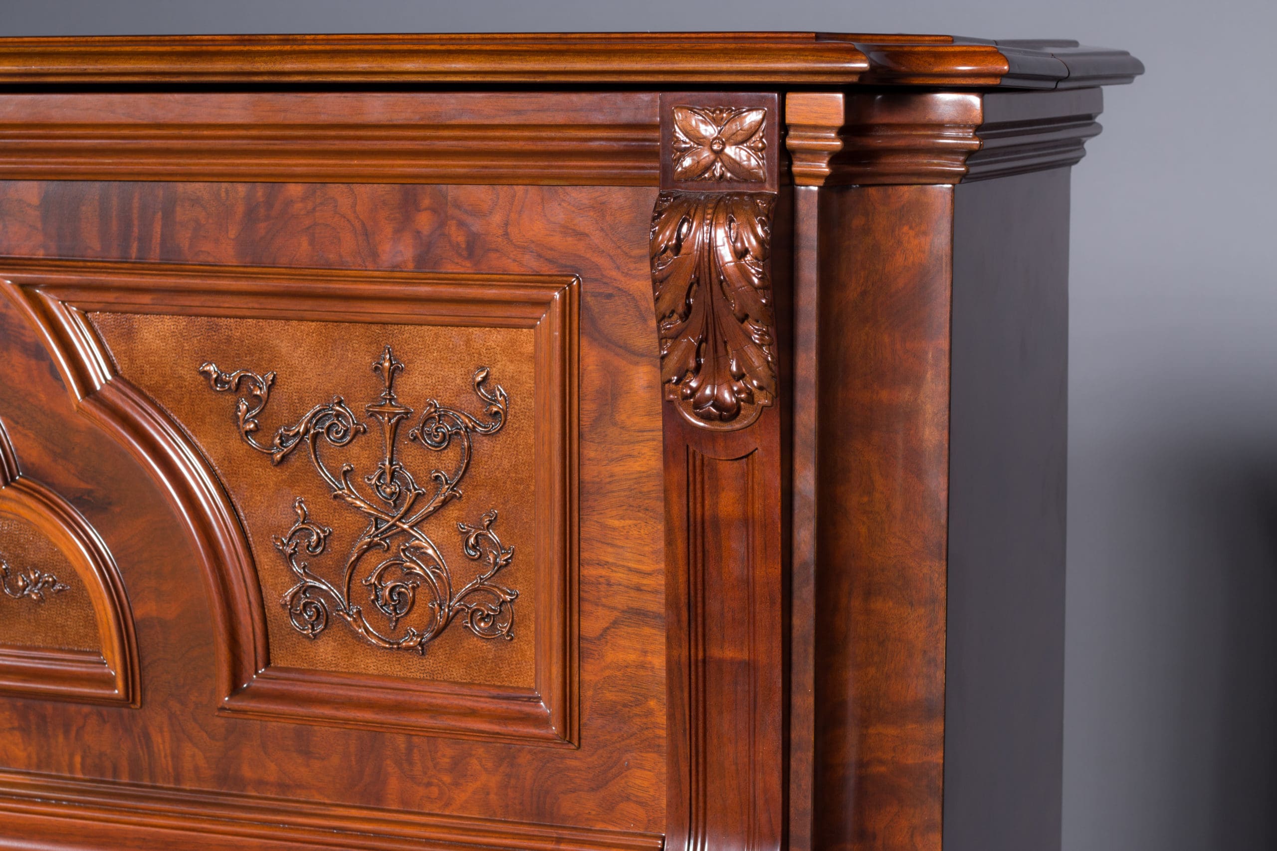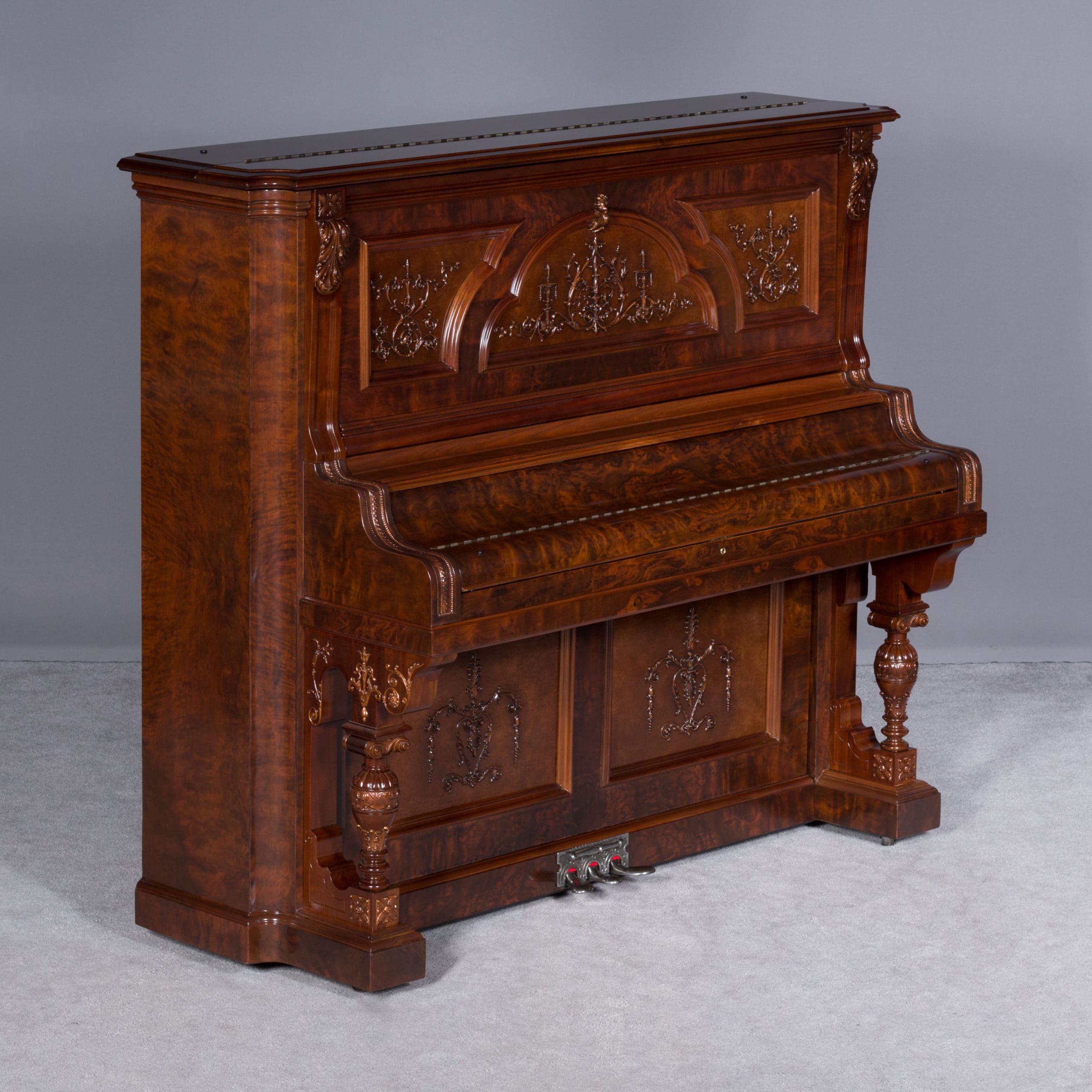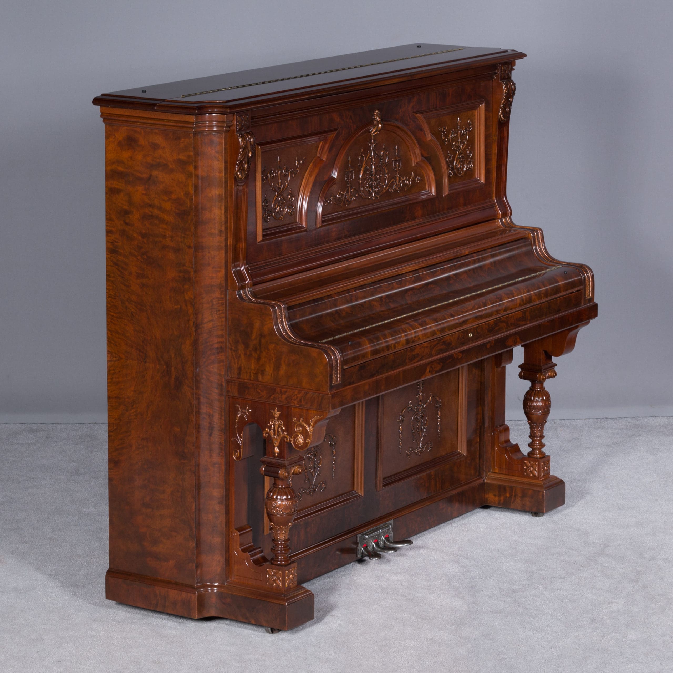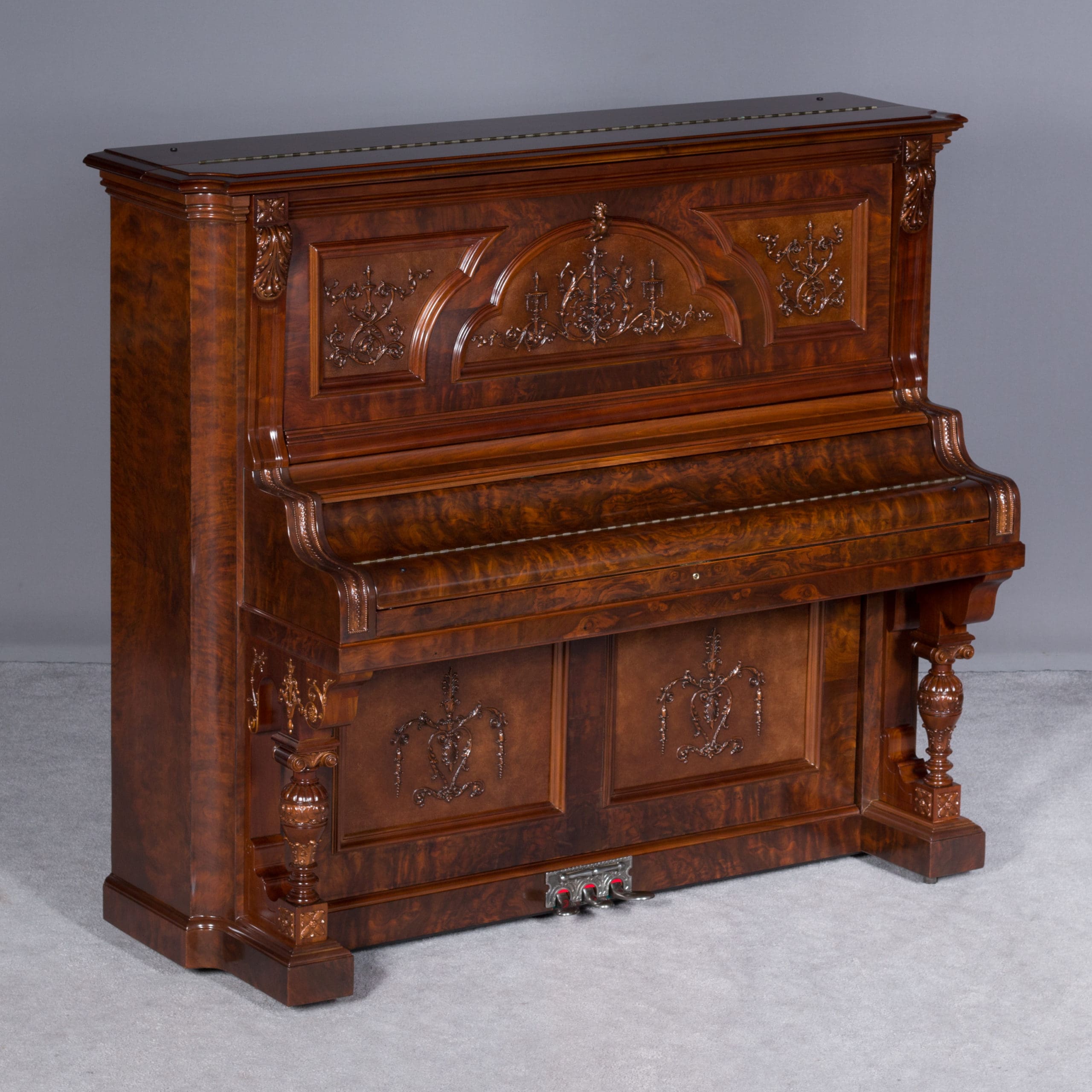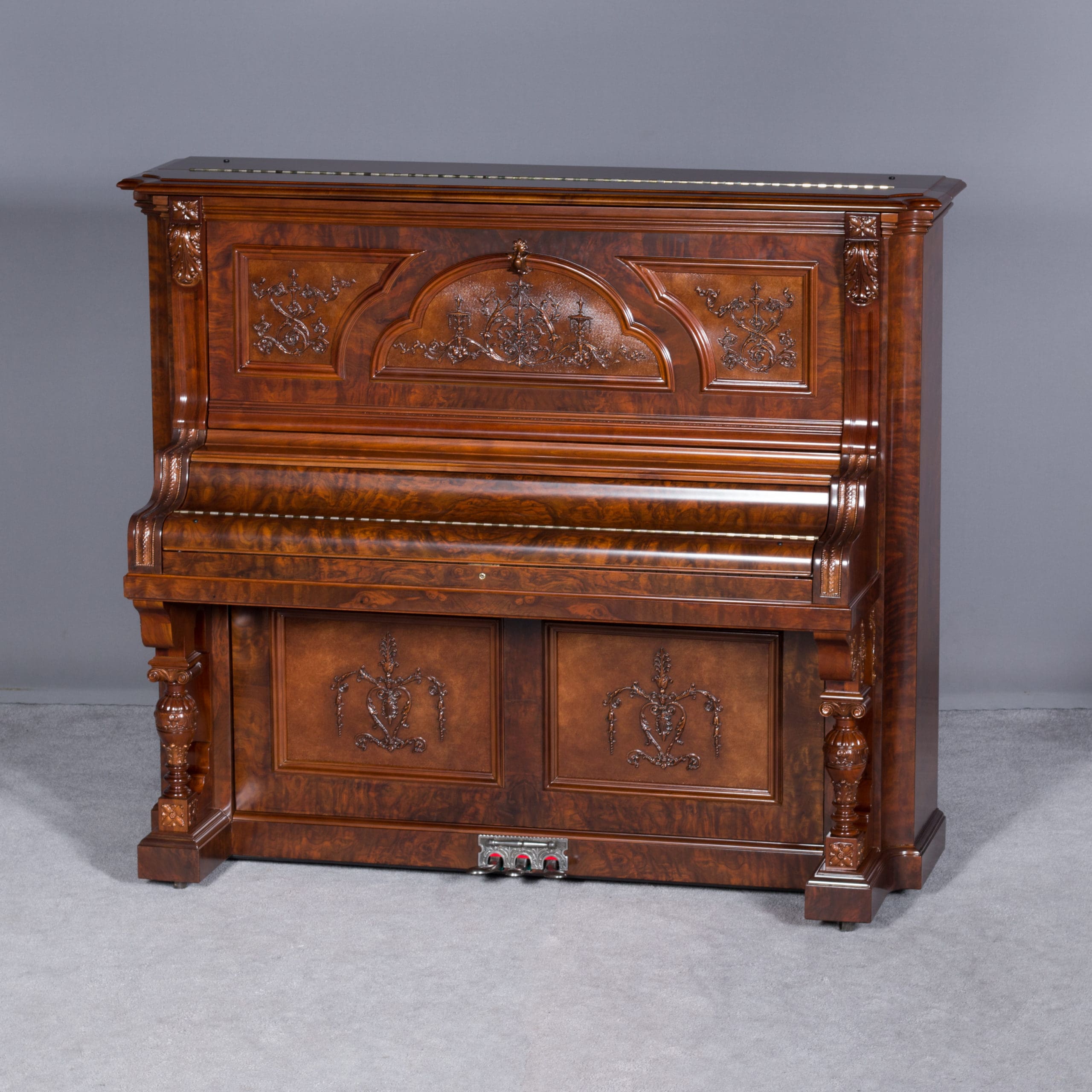 This beautiful piano was built by the prominent Bush & Gerts Piano Company of Chicago in 1902. Bush & Gerts built very expensive, high quality pianos from 1885 until 1942. This piano is one of the most elaborate upright piano models built by Bush & Gerts – it was considered the highest grade and would have been very expensive when new. Pianos like this would have cost the equivalent of a small house of the era! It boasts beautifully carved inset panels and elaborate moldings around the case, all made in the finest mottled burl walnut wood. The tone quality of this piano is tremendous, which isn’t surprising for a Bush & Gerts instrument. An original matching stool is included. This piano can be fitted with a computerized player mechanism if desired.