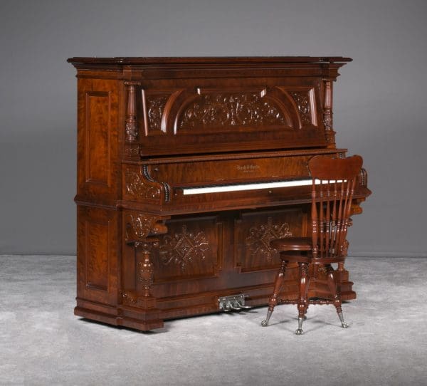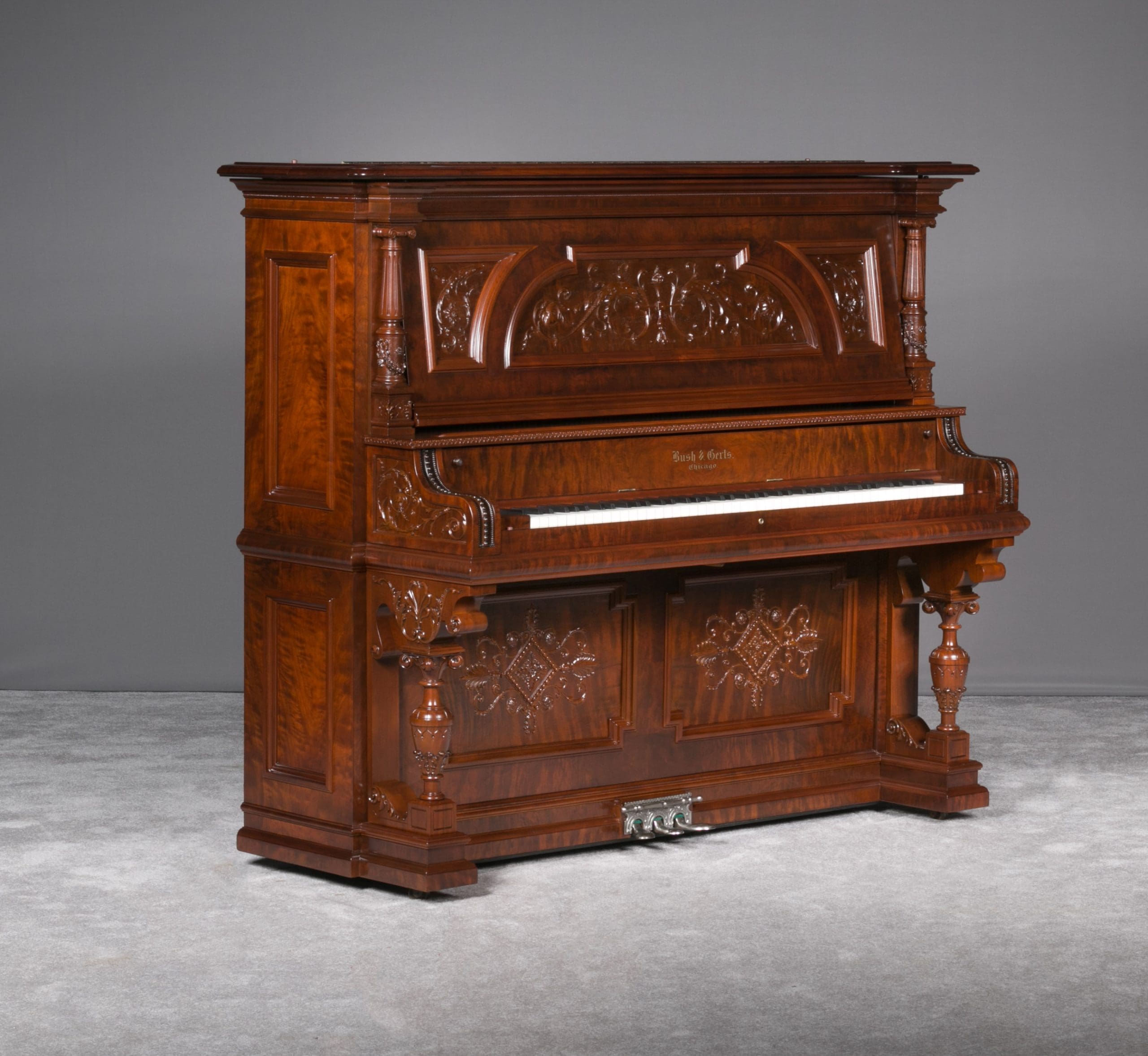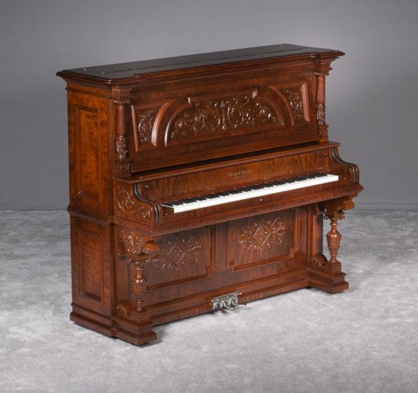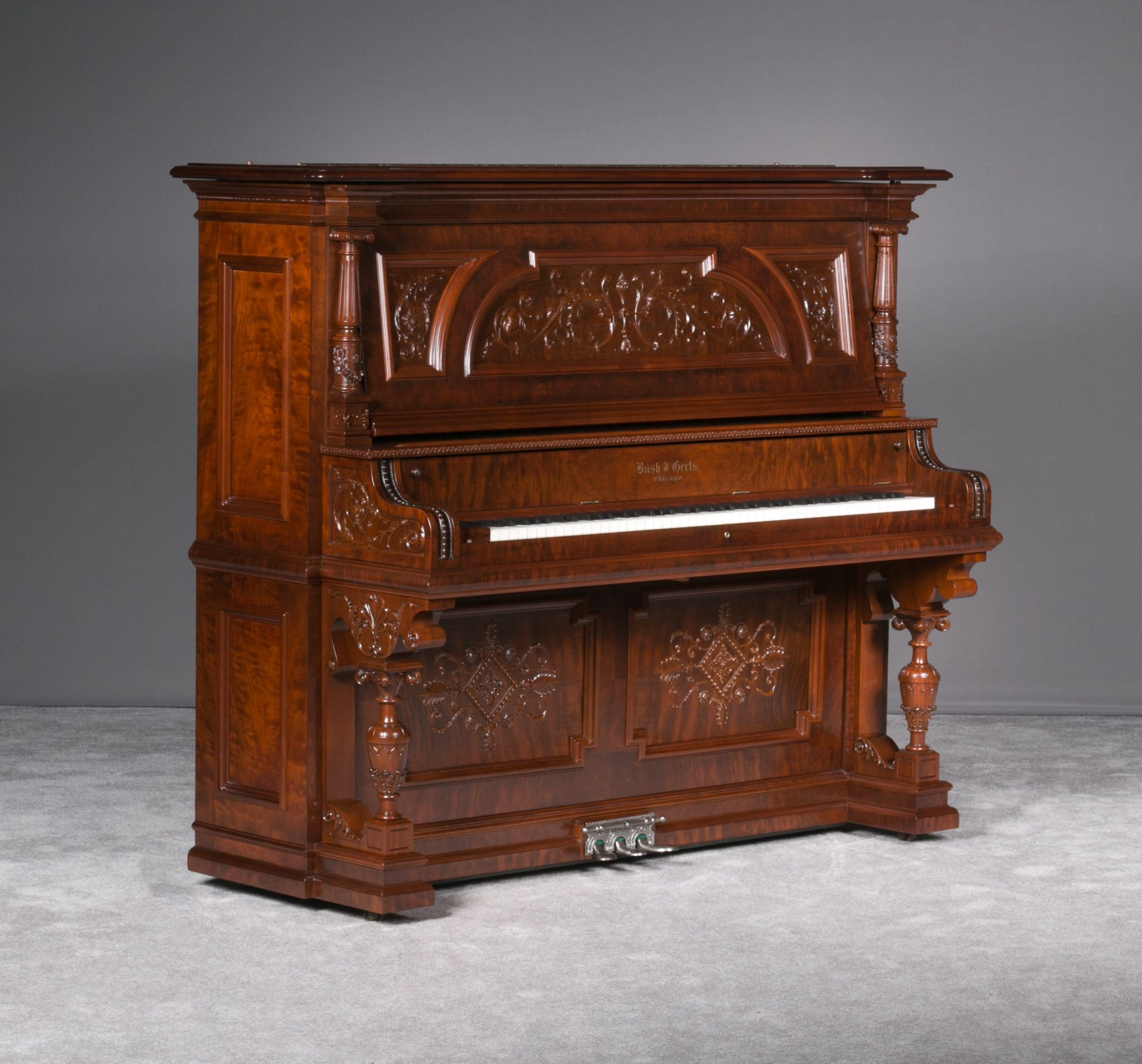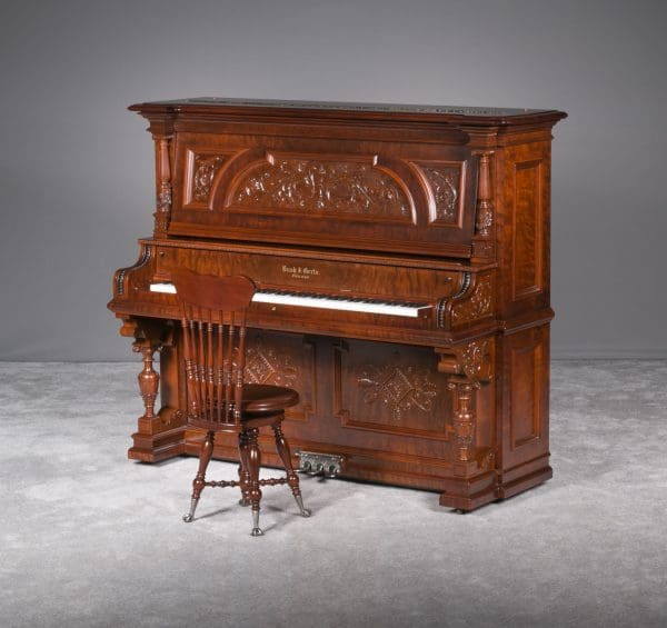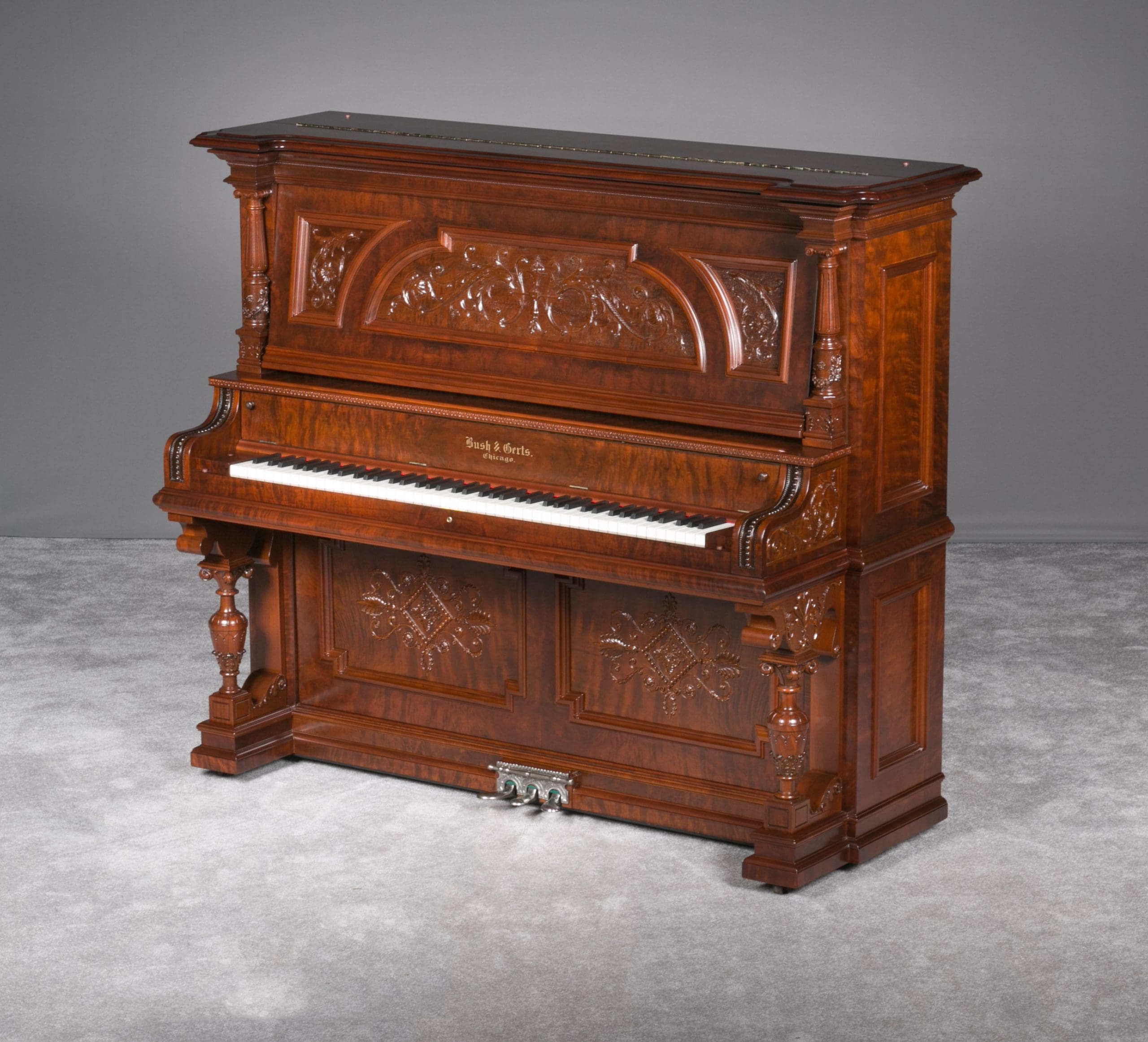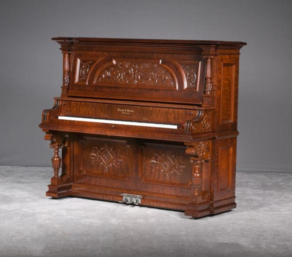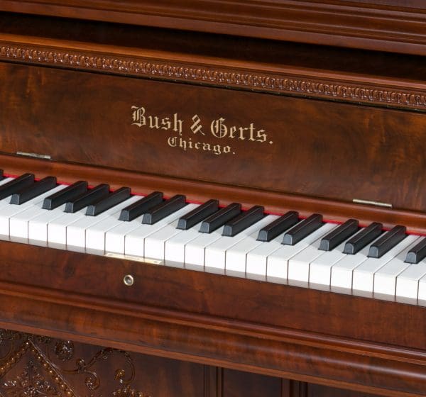 This beautiful piano was the highest grade, most expensive upright piano model offered by the Bush & Gerts Piano Company.