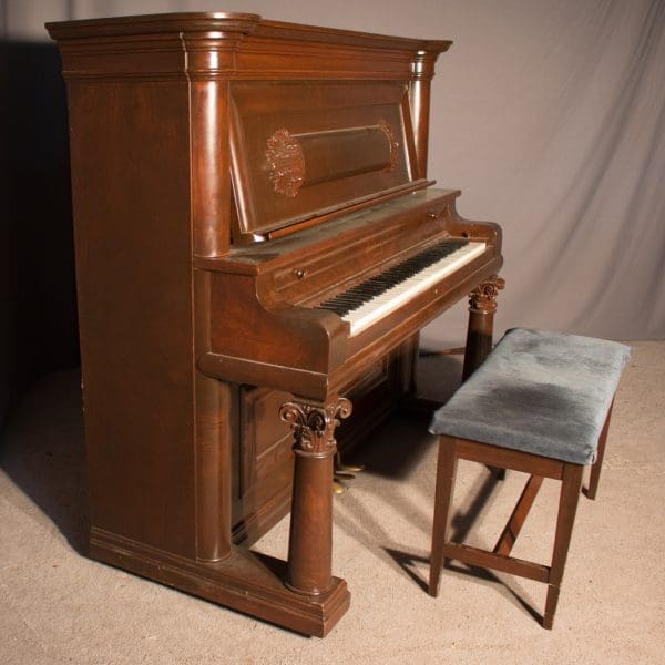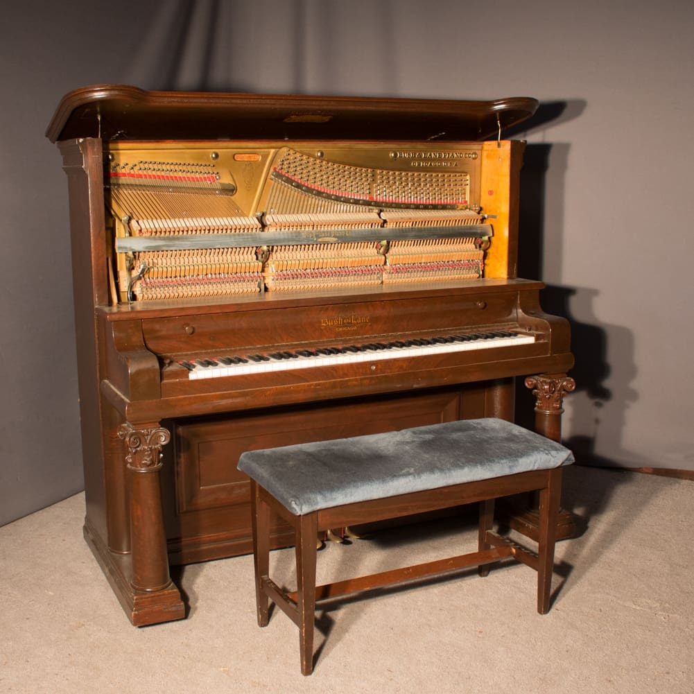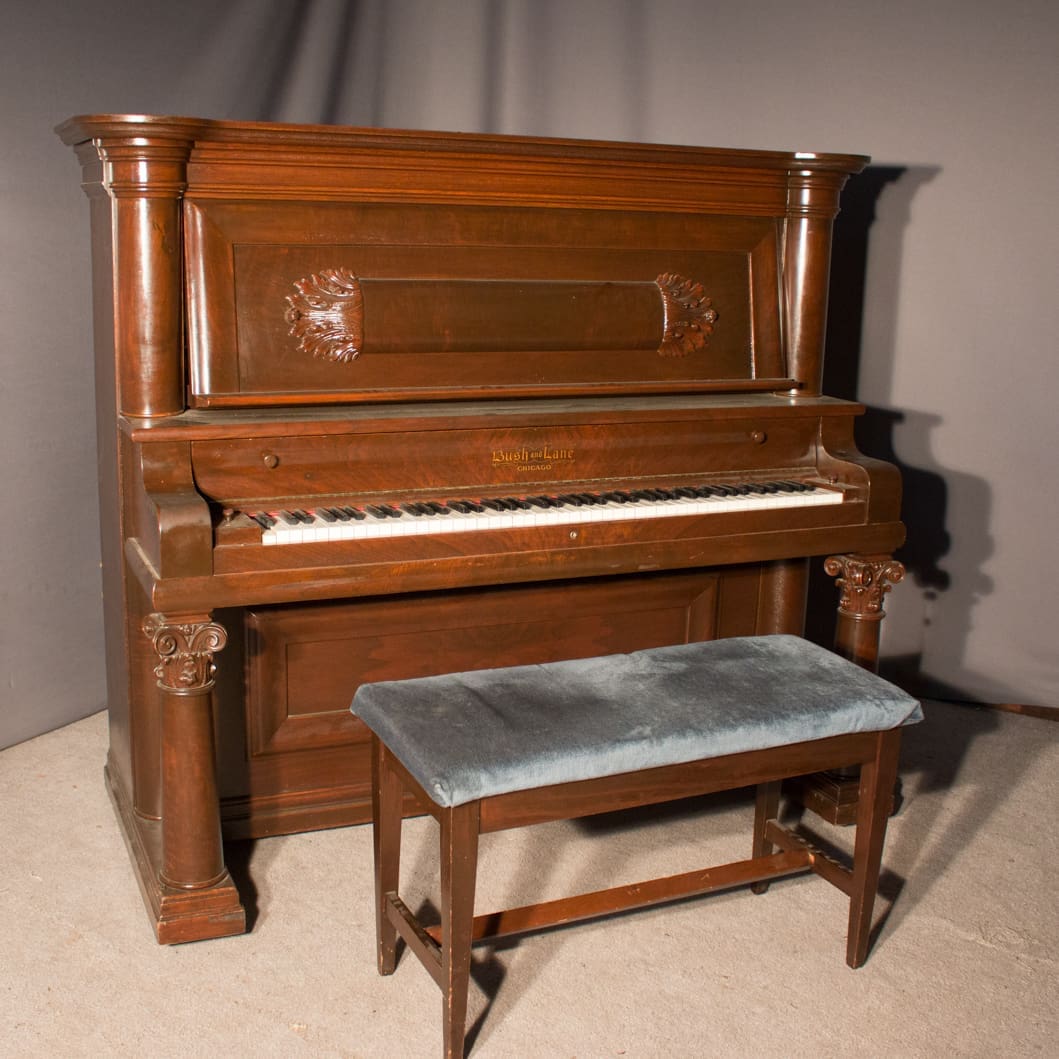 This is a beautiful example of an Empire Revival style full size upright piano. Built by the prominent Bush & Lane Piano Company in 1904, this piano has a large, grand tone quality with about the longest string length available in an upright piano. It is made of stunning Burl Walnut wood with massive columns and elegant moldings. This is a large, powerful instrument with an awesome presence.