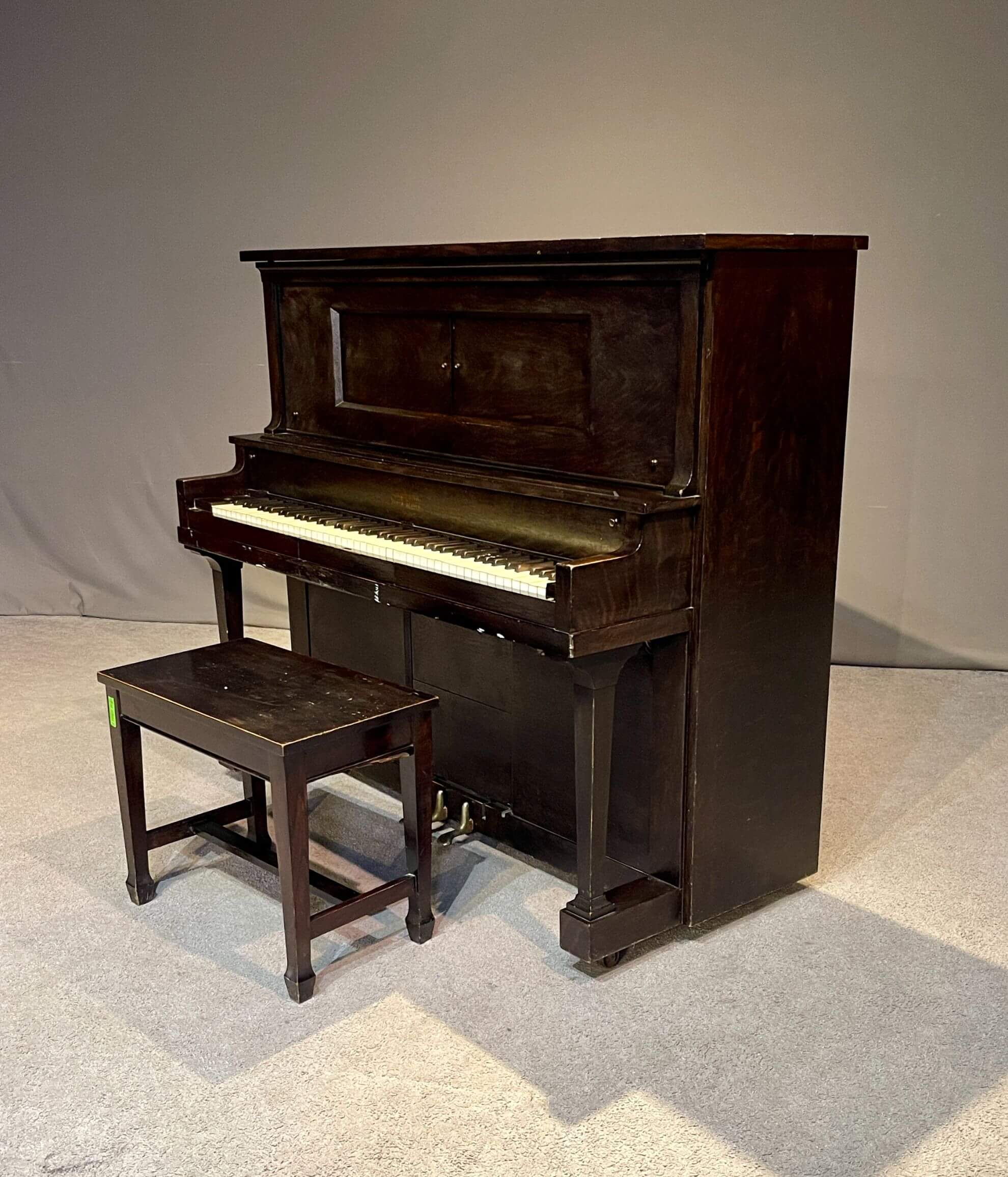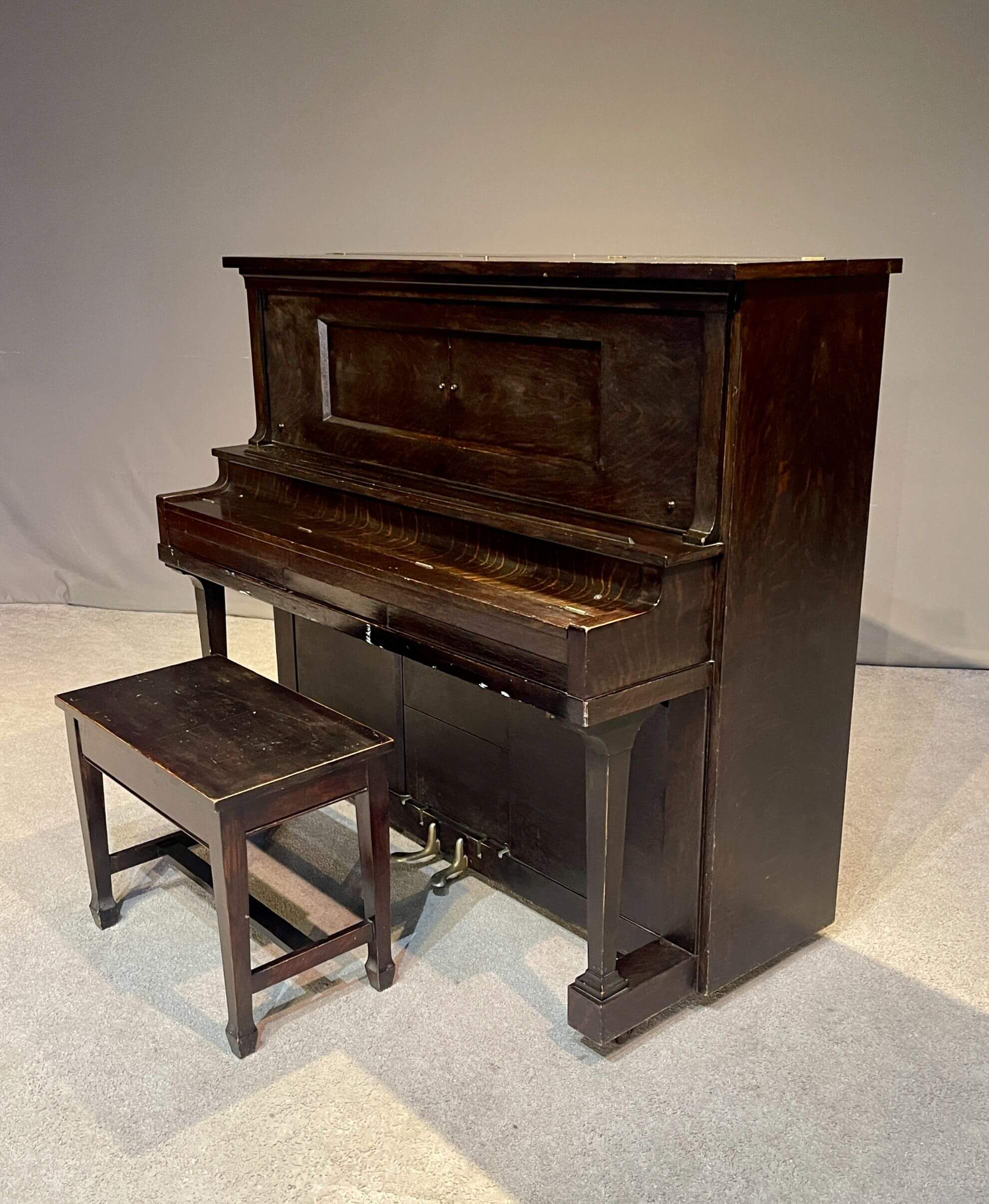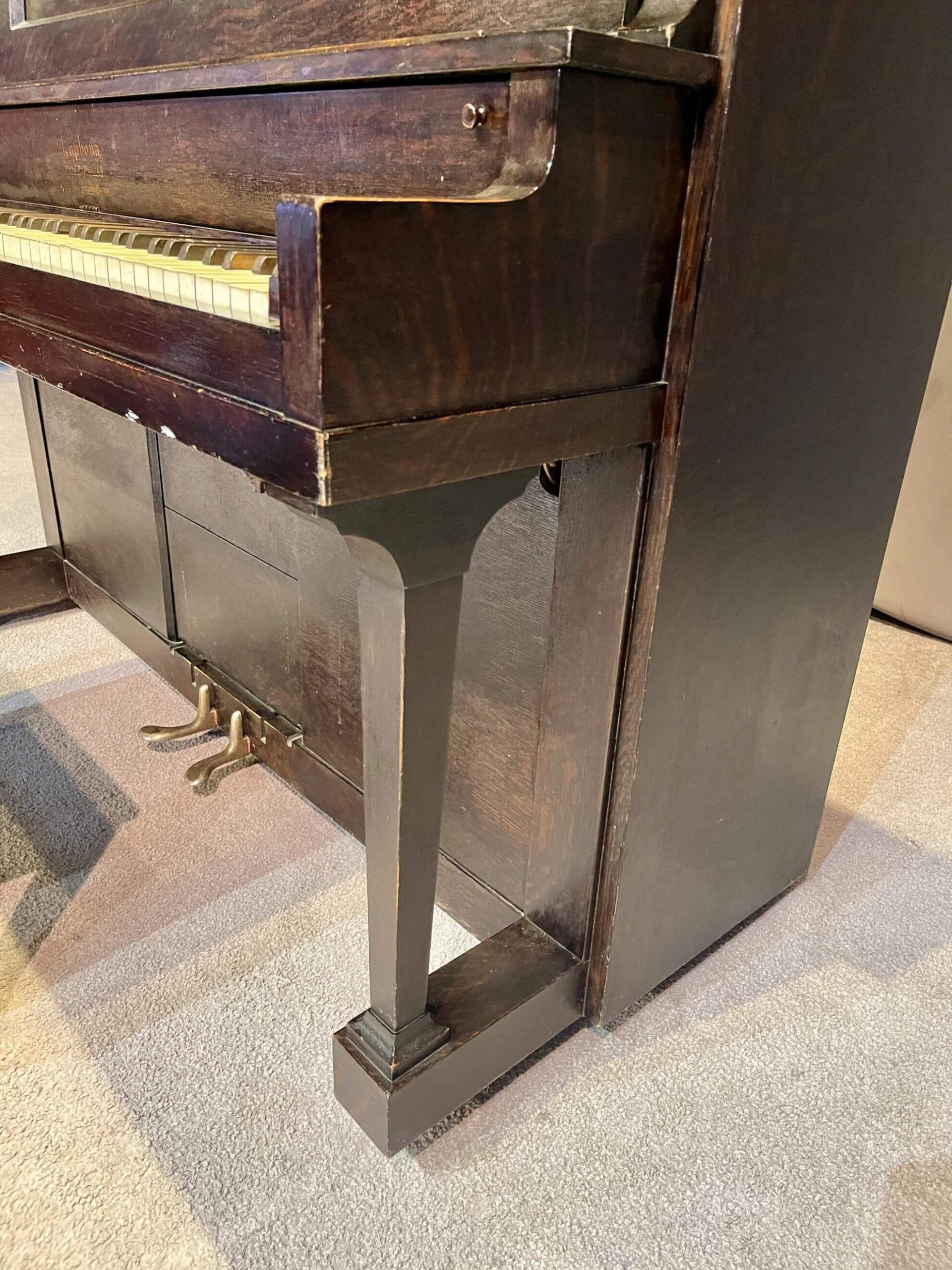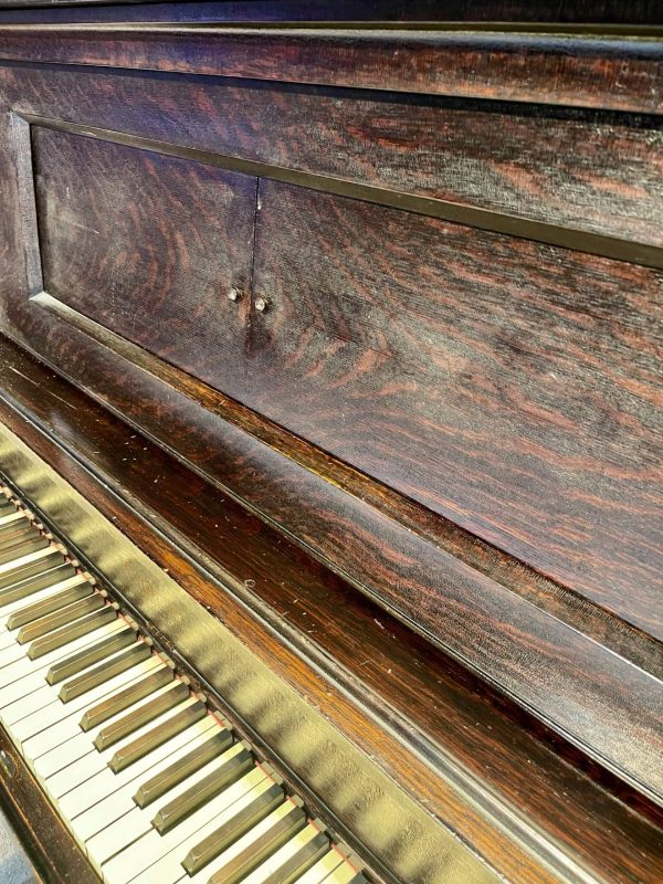 This particular piano is crafted from beautiful quarter-sawn oak—commonly referred to as “Tiger Oak” due to its striking grain pattern. Though currently hidden beneath an aged finish, the wood’s natural beauty will be fully revealed through professional restoration, transforming it into a stunning showpiece.