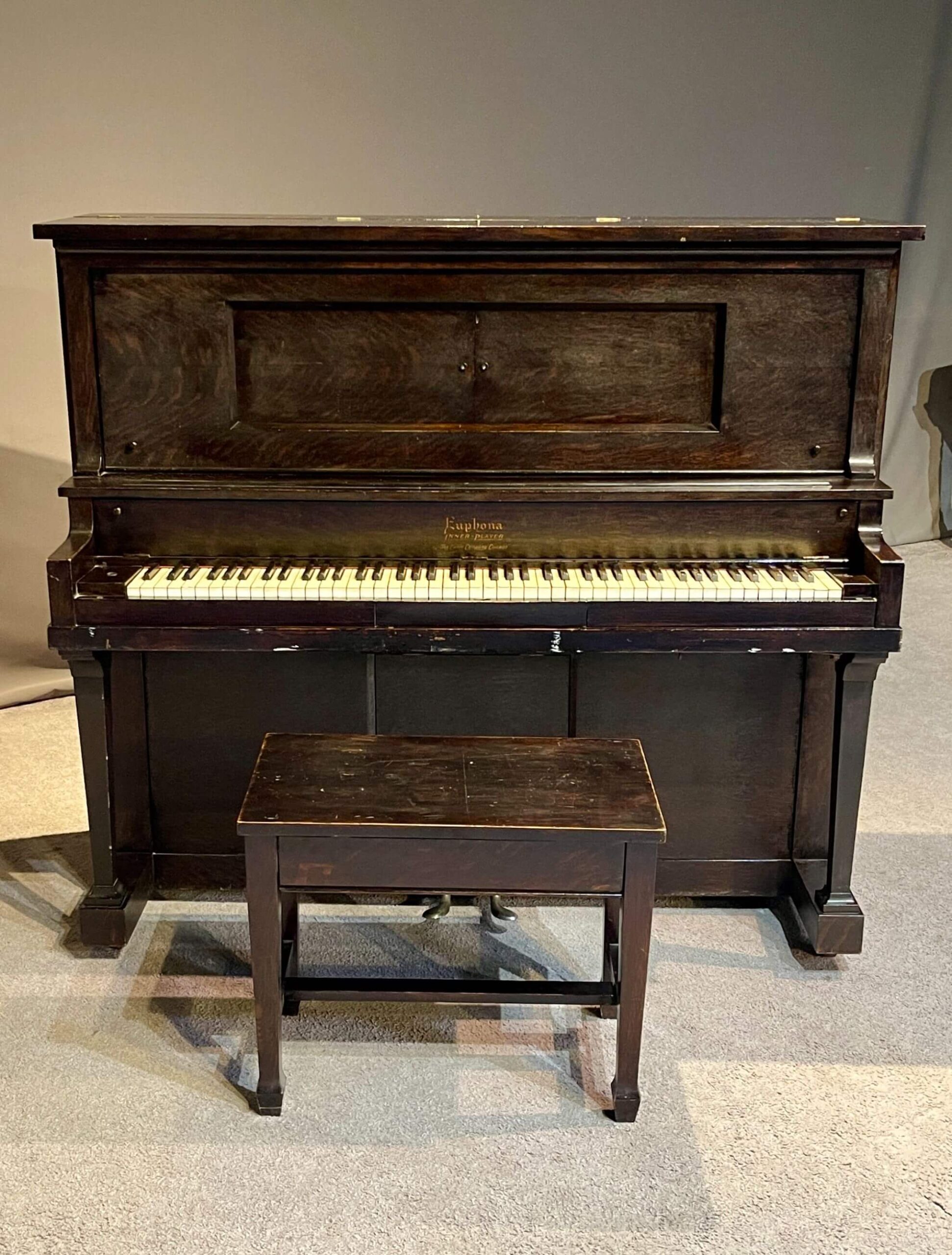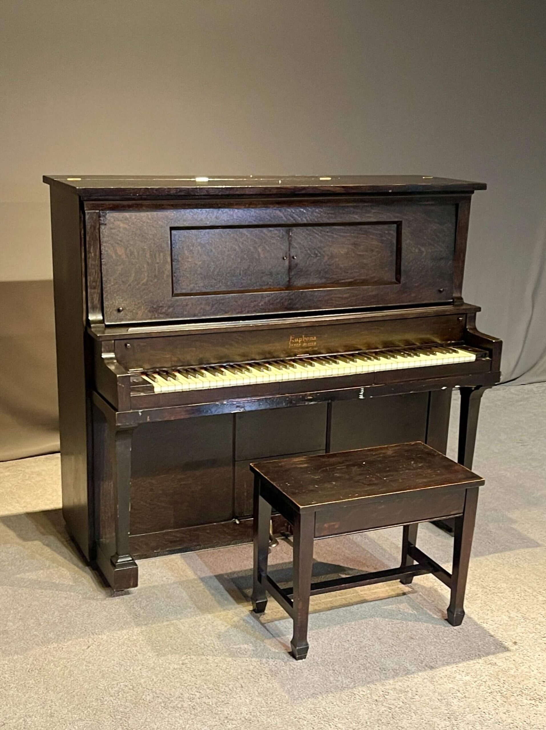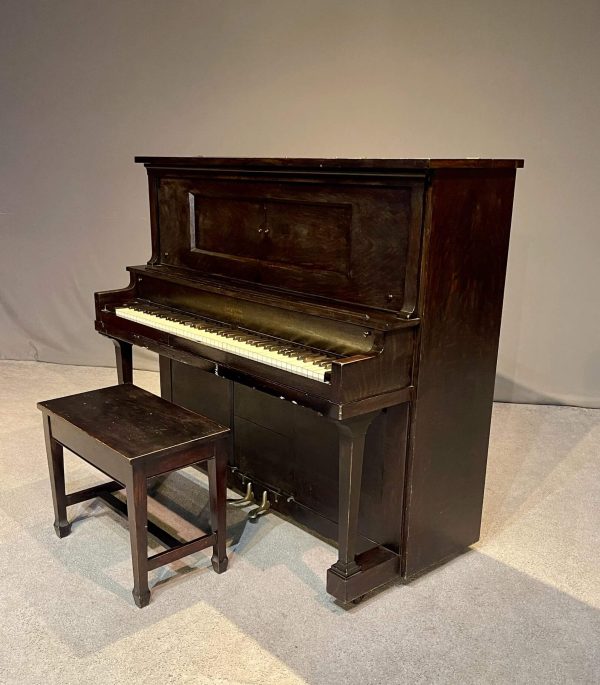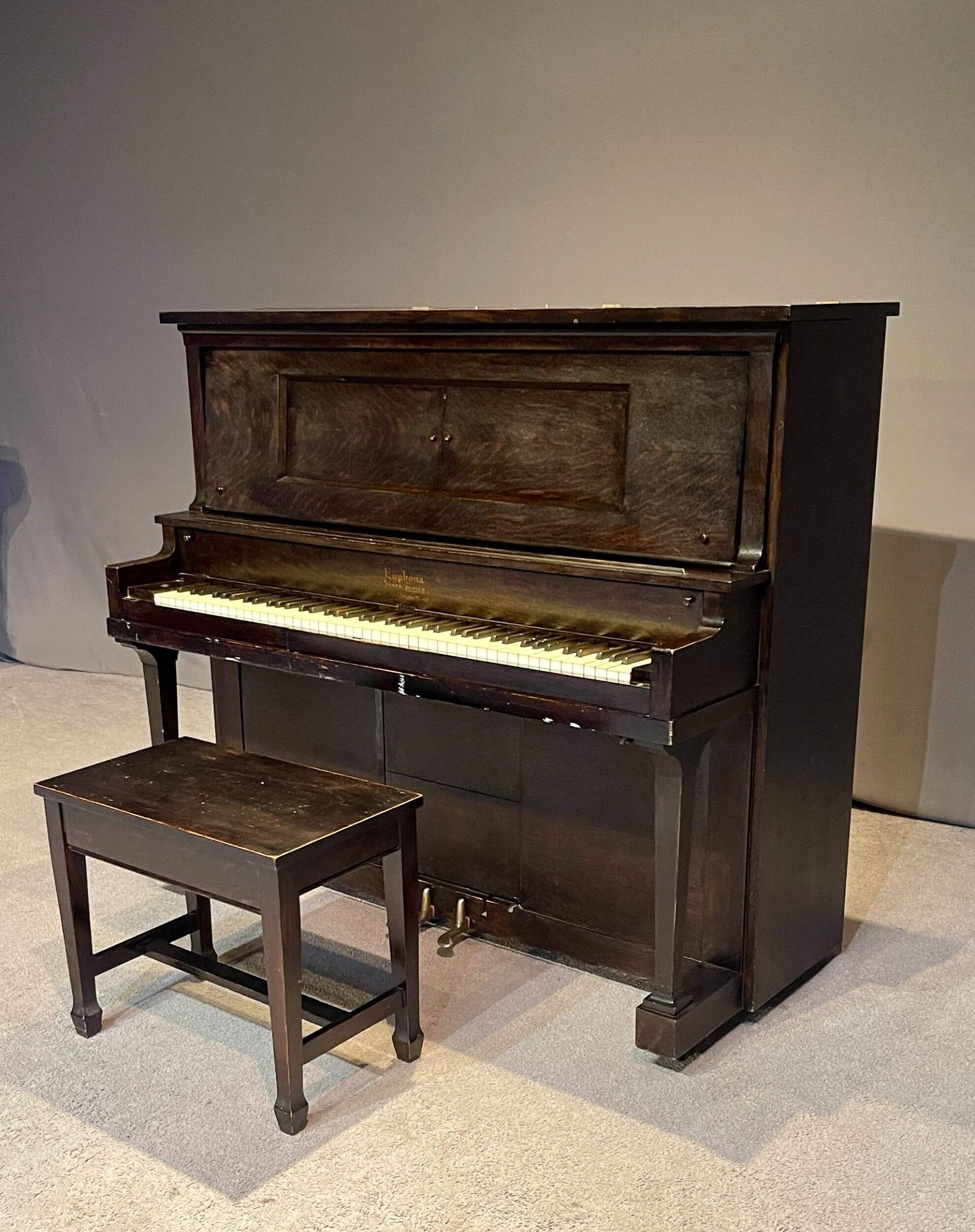 This particular piano is crafted from beautiful quarter-sawn oak—commonly referred to as “Tiger Oak” due to its striking grain pattern. Though currently hidden beneath an aged finish, the wood’s natural beauty will be fully revealed through professional restoration, transforming it into a stunning showpiece.