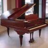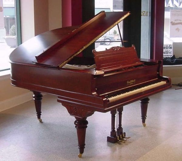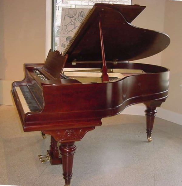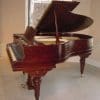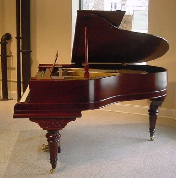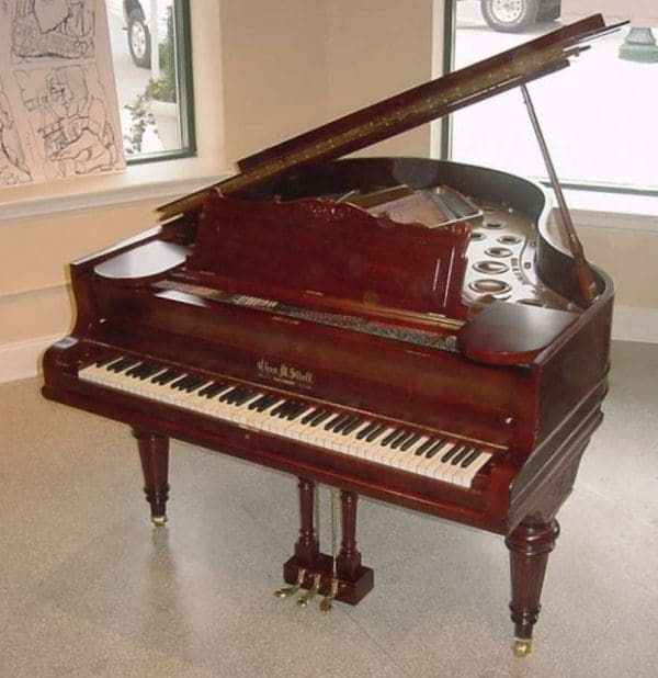 This beautiful grand piano was made by the Charles M. Stieff Piano Company of Baltimore, MD. Stieff built exceptional pianos from about 1842-1942. Stieff has often been referred to as “The Poor Man’s Steinway” by piano rebuilders and tuners. This is due to the fact that Stieff built amazing pianos that were often praised by Steinway as being a leading competitor at the turn of the century. This piano is made of a beautiful cherry wood, and has a stunning woodgrain. It has beautifully carved and fluted legs, and a very elegant carved music rack. This piano has an original ivory keyboard, and is sold with a matching stool This piano can be equipped with computerized player mechanims if desired.