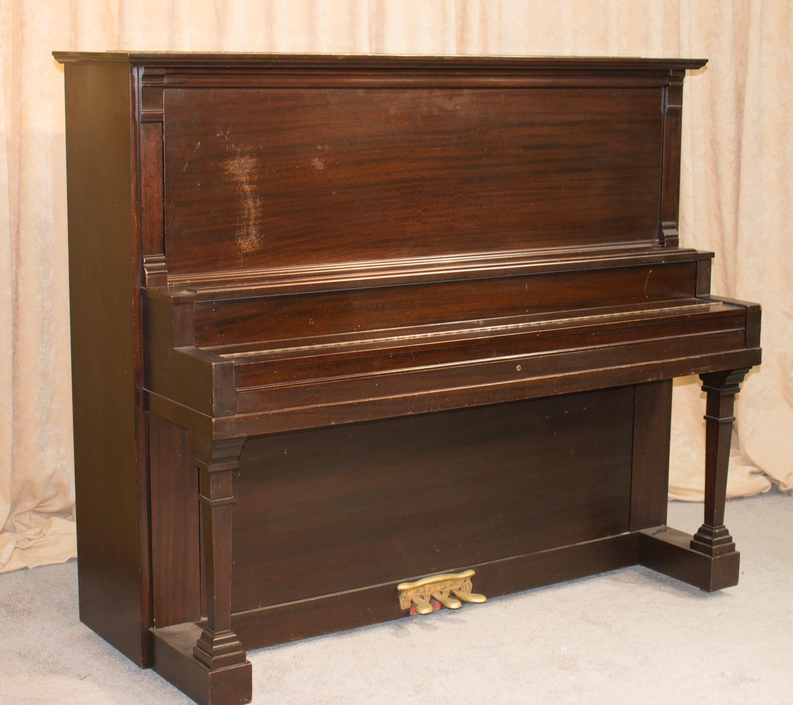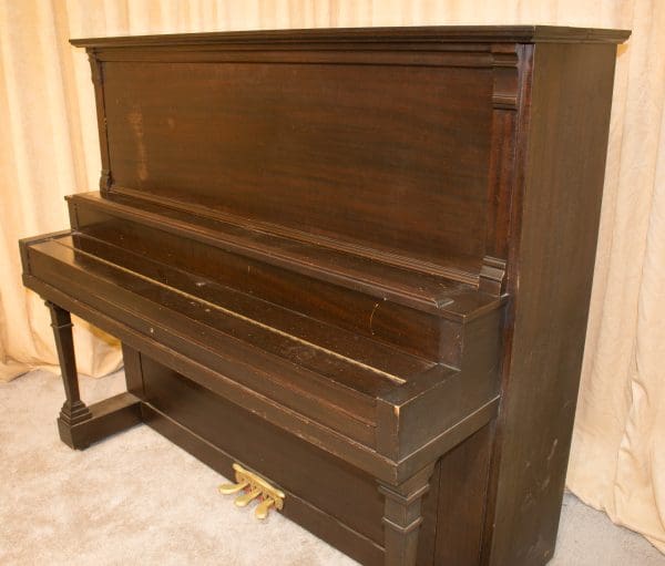 DEPOSITS: The restoration of this instrument has not been completed. A 30% deposit is required on instruments pending restoration. This deposit holds the instrument and keeps it from being offered to other clients, and it also makes that piano’s restoration a priority. Once we complete the restoration, we invite the client to visit our shop to see and hear the piano. If the client is unable to visit our shop, we will send professional photos and videos of the piano for review. The client then has the option of paying the balance and purchasing the piano, transferring their balance to another piano in our shop, or getting a full refund for their deposit. The client is never at risk.