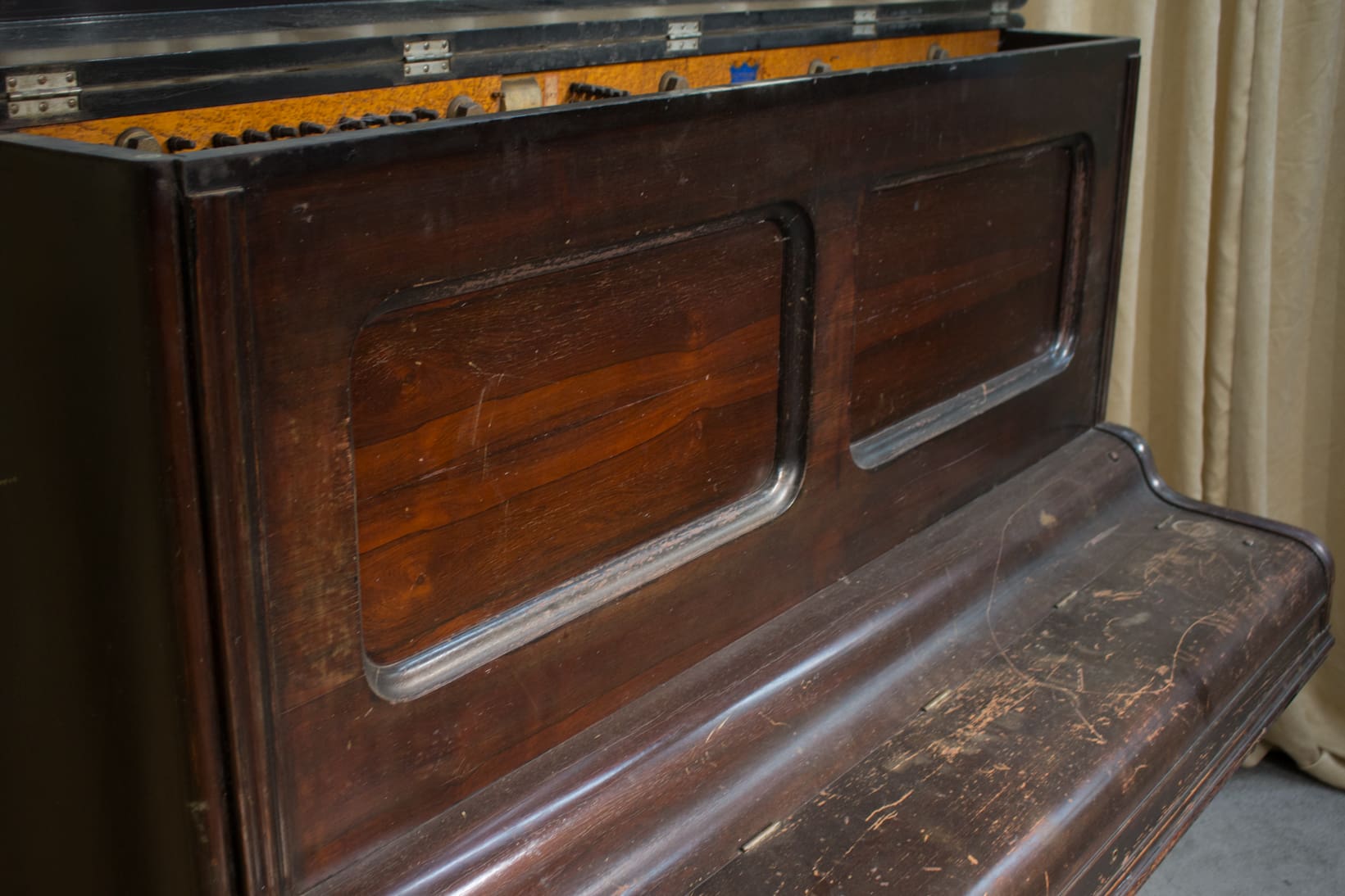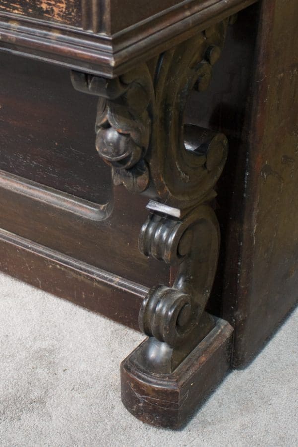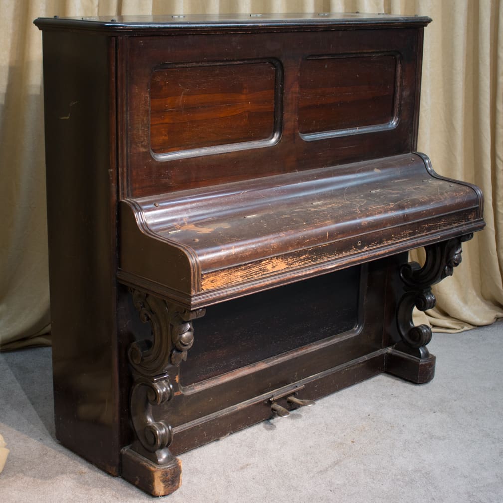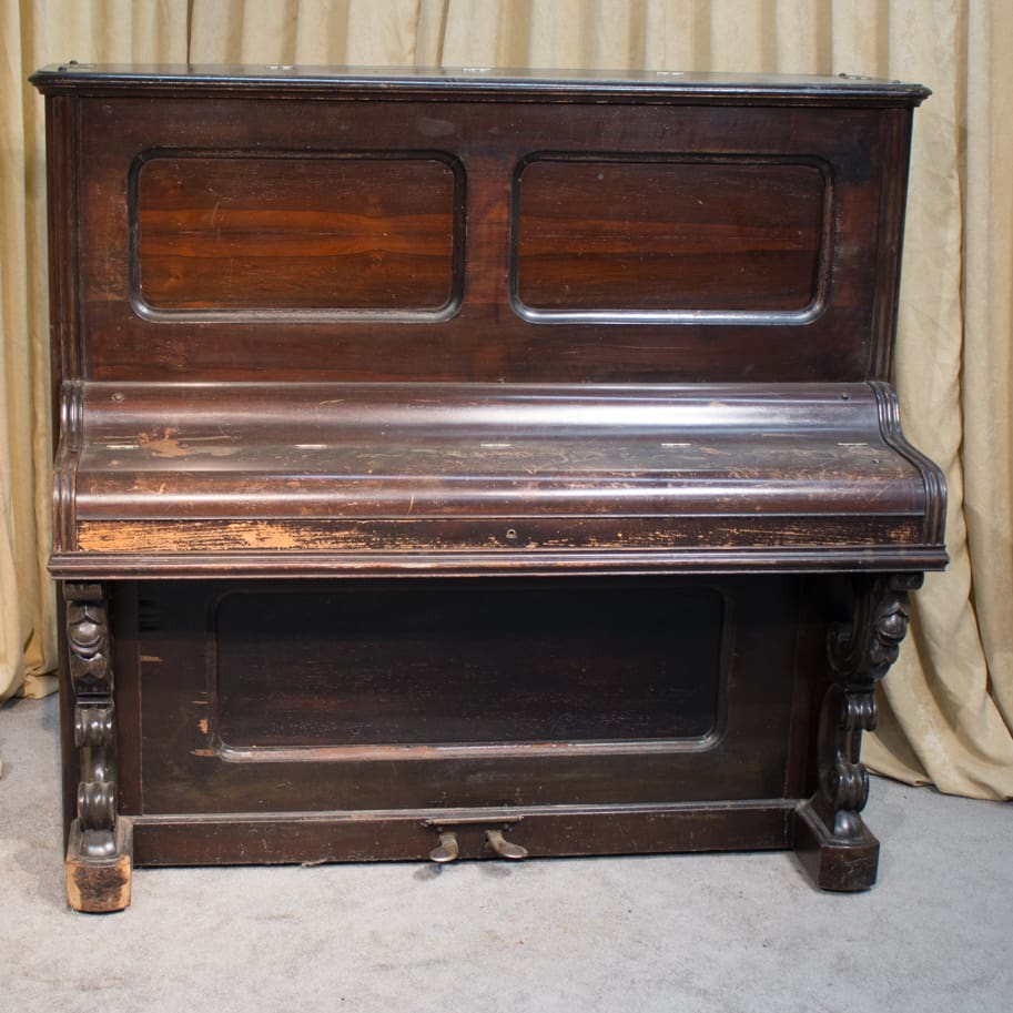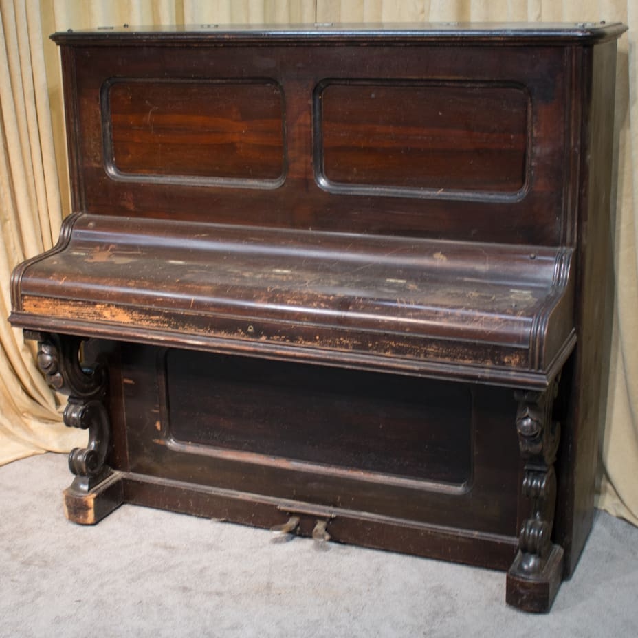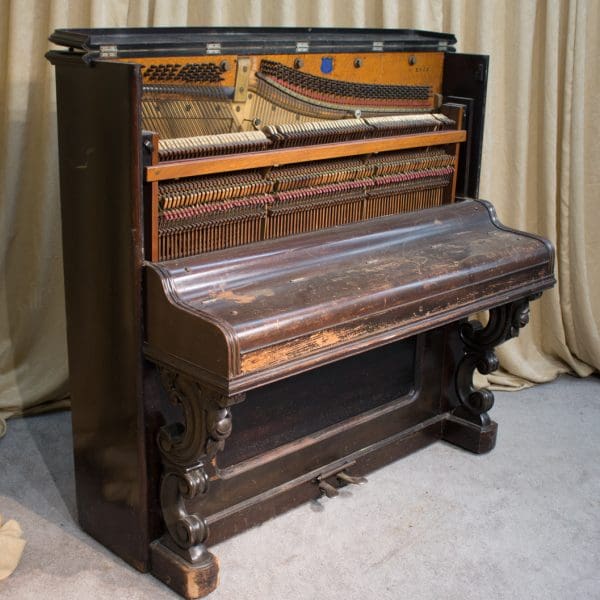 This piano is a large, full size upright with the string length and soundboard area of a full grand piano! This piano is made of Brazilian Rosewood and is of the Victorian style. Note the exquisitely hand carved Rococo style legs, a feature rarely found on upright pianos.