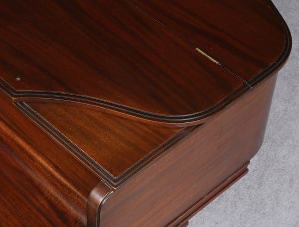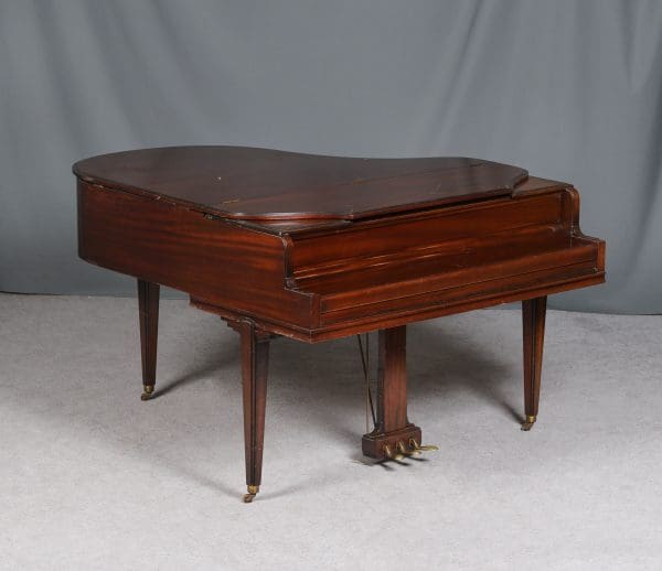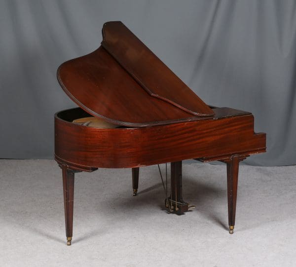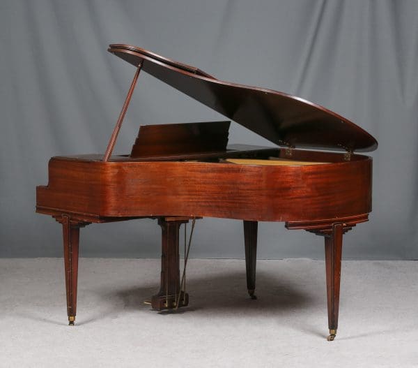 This is an unusual Art-Deco style baby piano built by the famous Chickering & Sons Piano Company of Boston. Note the beautiful mid-century design of the lid, legs and moldings. Built in 1941, this beautiful piano would have been one of the last models produced just before World War 2. The instrument is made of imported Honduran Mahogany wood and has been remarkably well preserved over the years.