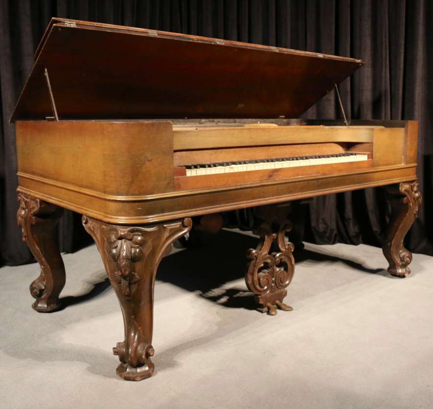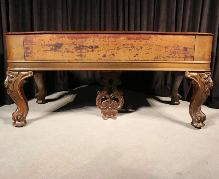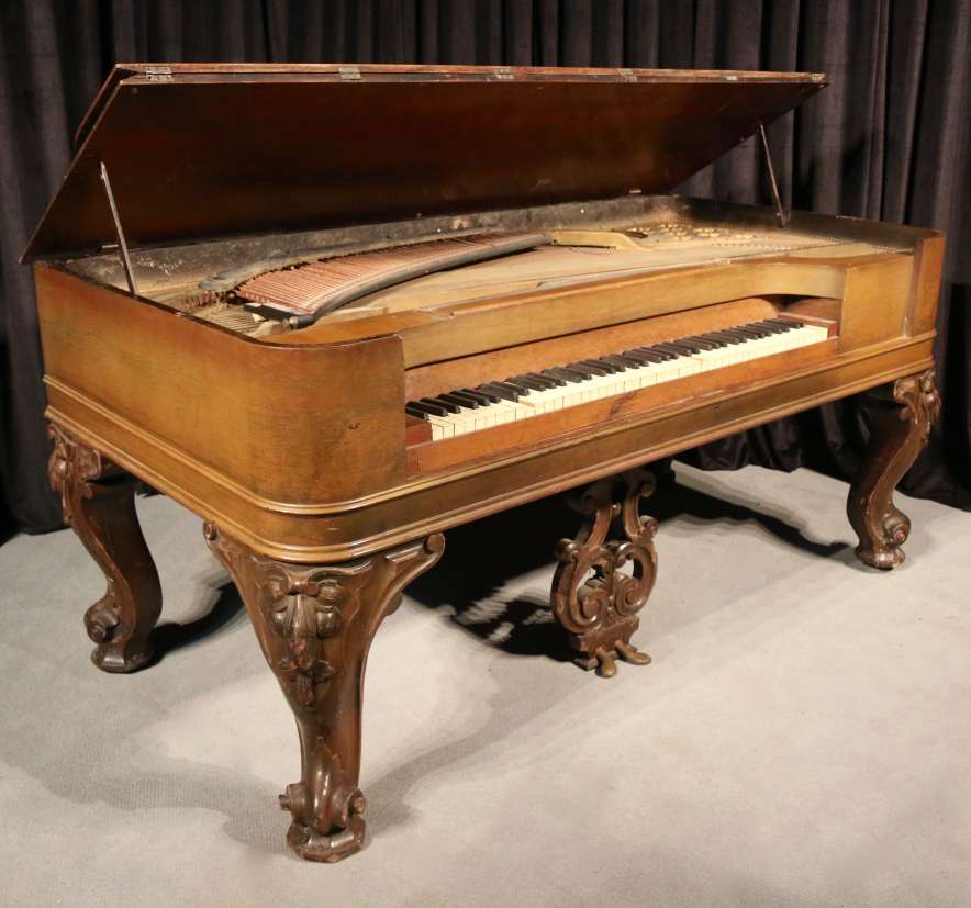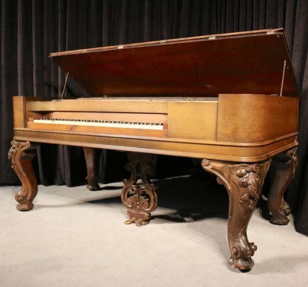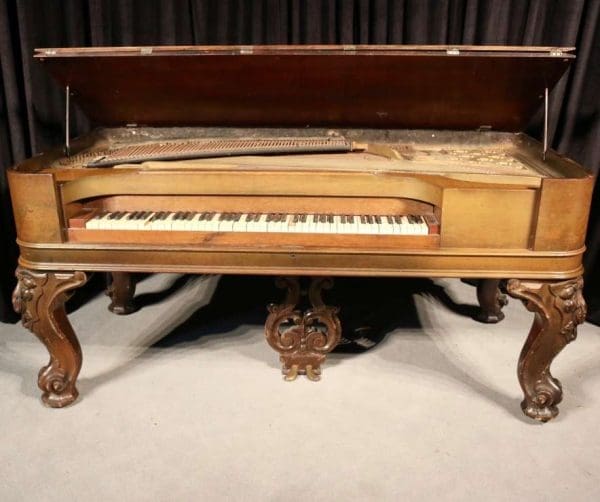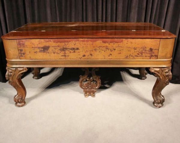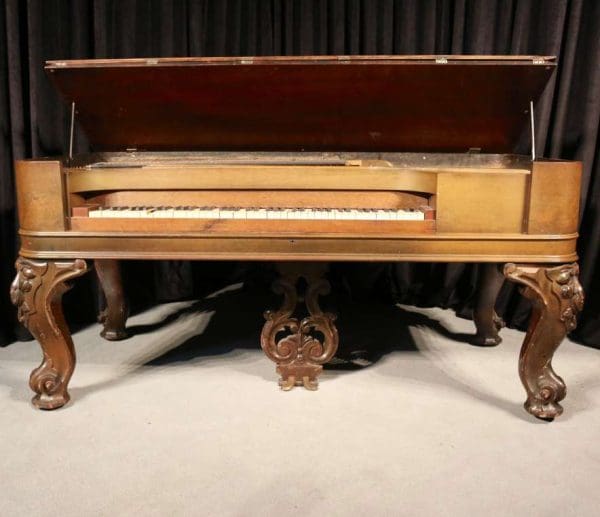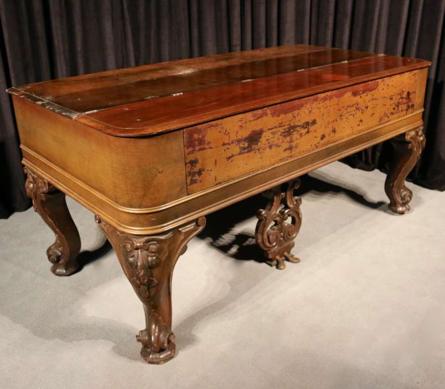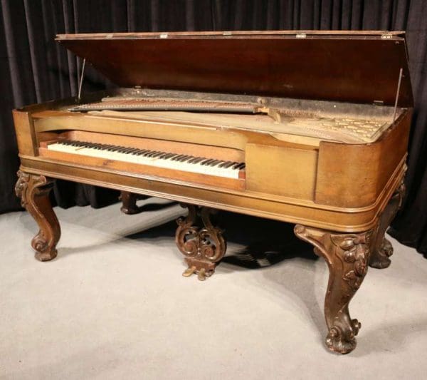 This piano is one of Chickering’s later model square grand pianos. This instrument is made of Brazilian Rosewood, now an endangered species, and is elaborately carved in the Rococo Victorian style. Note the elaborate carvings on the legs and music rack. This piano is being restored to like new condition, inside and out.