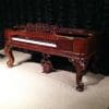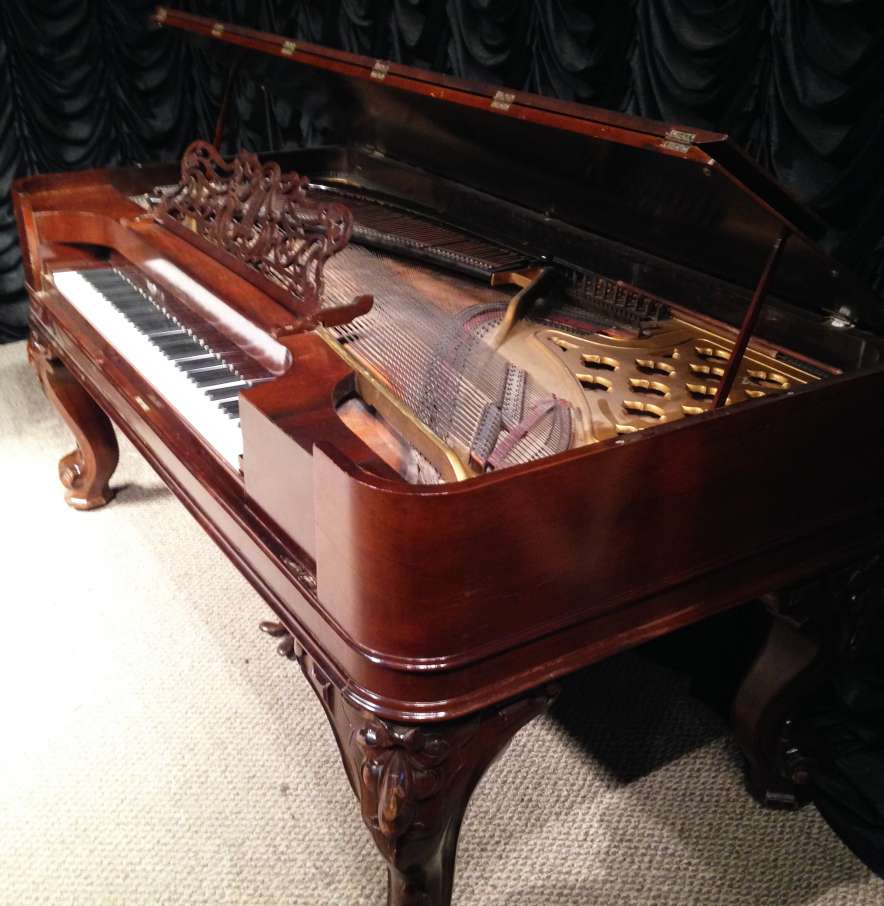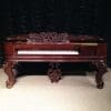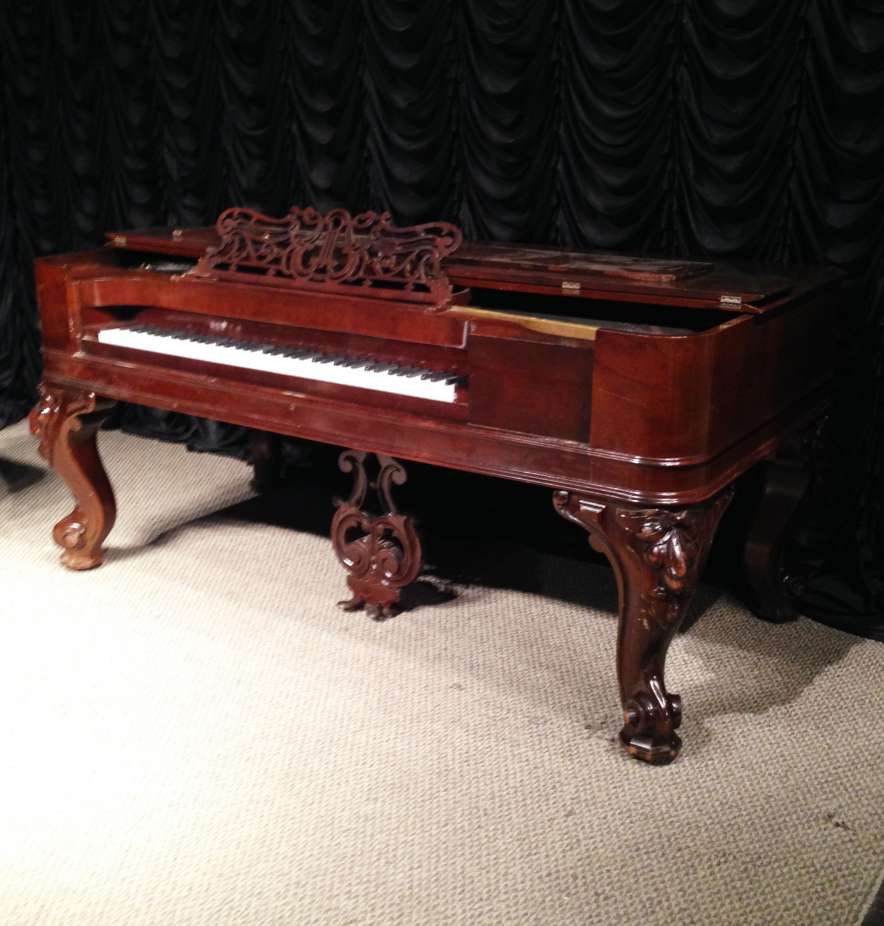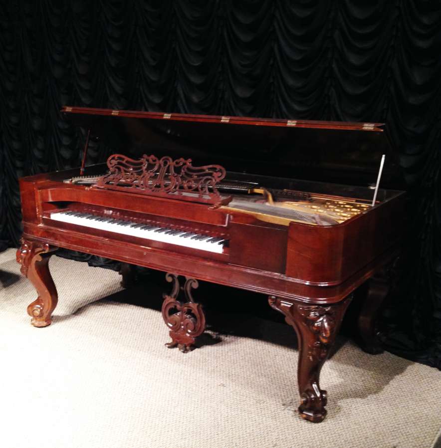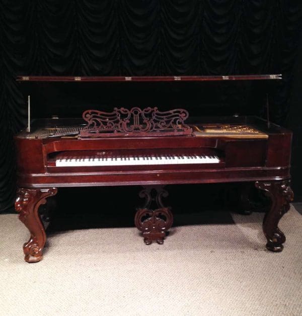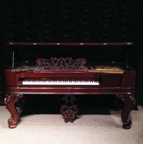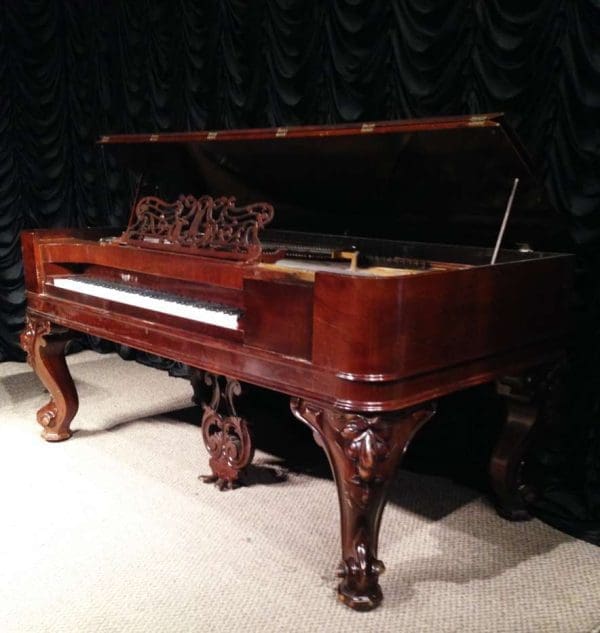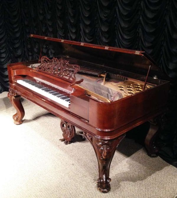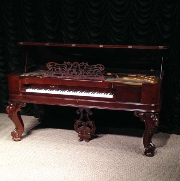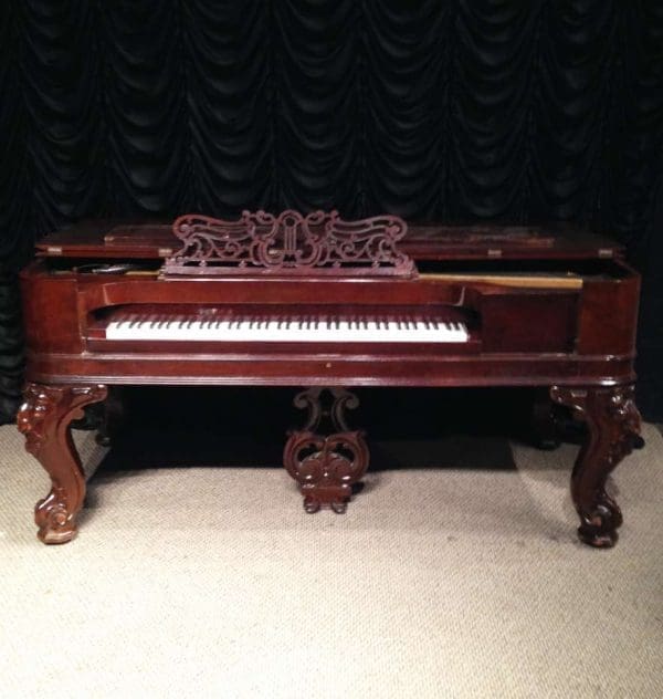 This wonderful square piano was built by Chickering of Boston during the Civil War. Chickering was the first piano manufacturer in America, established in 1823 and is said to have built the finest pianos in the world. Long before names such as Steinway, etc., Chickering held top awards world wide for piano design and manufacturing. This piano is one of Chickering’s classic Cabriole Leg style square grand pianos. Once the most popular style of piano built in America, these instruments are nearly extinct today. This instrument is made of Brazilian Rosewood, now an endangered species, and is elaborately carved in the Rococo Victorian style. Note the elaborate carvings on the legs and music rack, as well as the ornate casting in the metal harp inside. The delicate “harp like” tone of these square pianos is quite lovely to hear. An original matching stool is included.