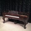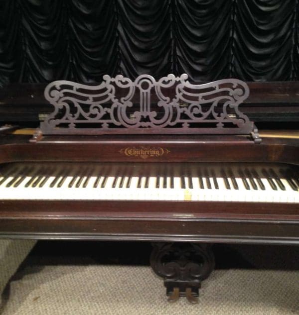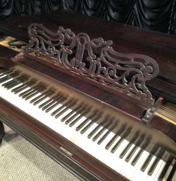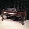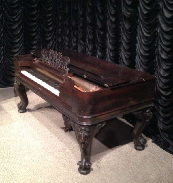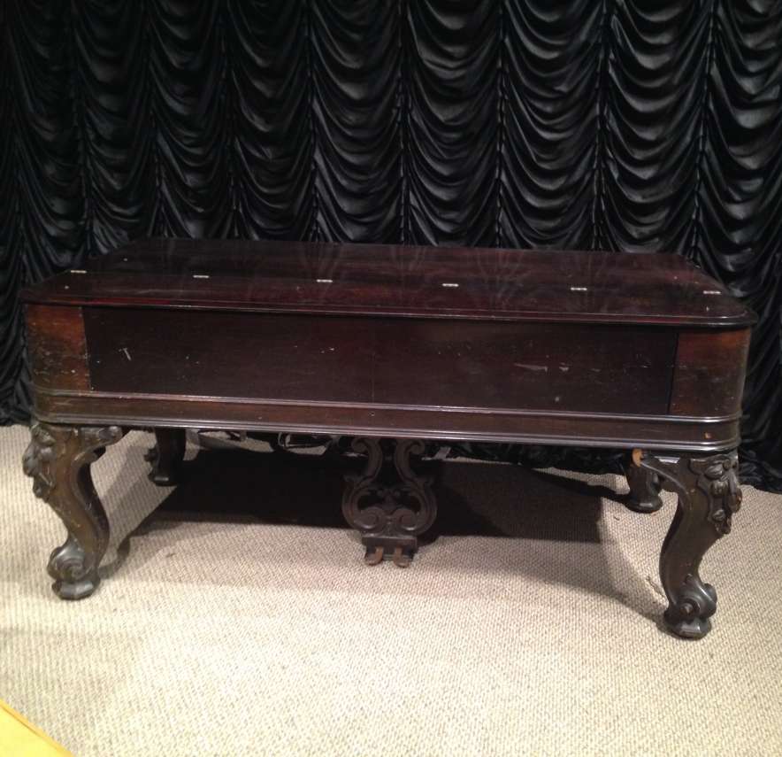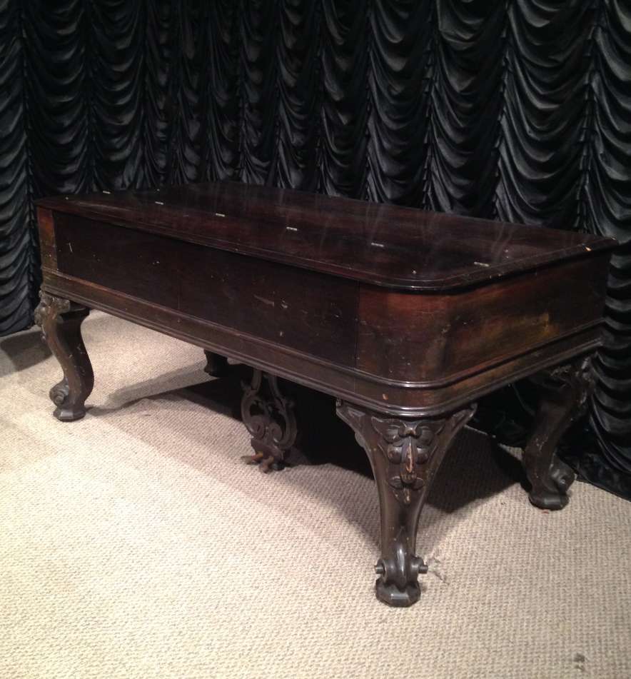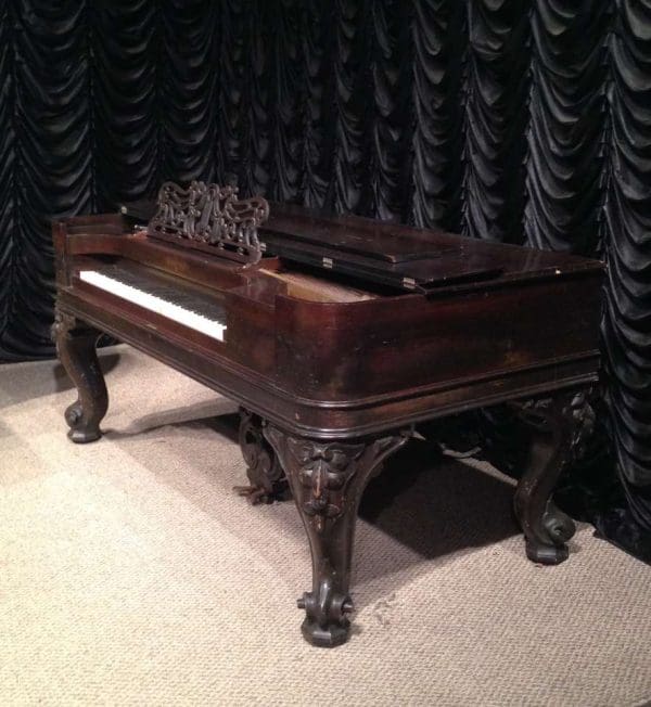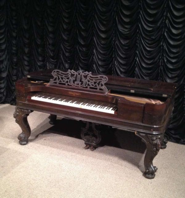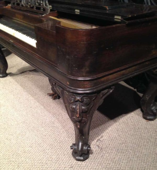This wonderful square piano was built by Chickering of Boston in 1881, shortly before the large square piano was discontiued in favor of the smaller upright piano. Chickering was the first piano manufacturer in America, established in 1823 and is said to have built the finest pianos in the world. Long before names such as Steinway, etc., Chickering held top awards world wide for piano design and manufacturing. This piano is one of Chickering’s classic Cabriole Leg style square grand pianos. Once the most popular style of piano built in America, these instruments are nearly extinct today. This instrument is made of Brazilian Rosewood, now an endangered species, and is elaborately carved in the Rococo Victorian style. Note the elaborate carvings on the legs and music rack, as well as the ornate casting in the metal harp inside. This piano is one of Chickering’s later models, making it one of their larger and more impressive models.This piano is being restored to like-new condition, inside and out. An original matching stool is included.