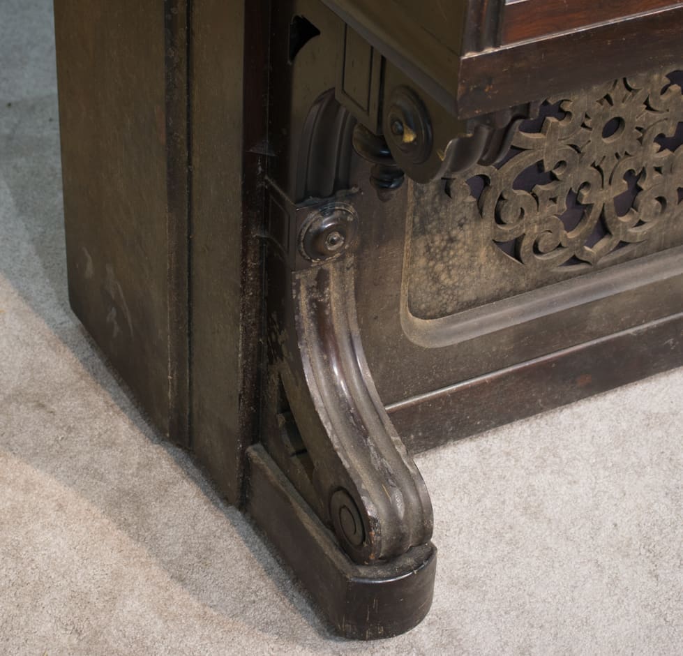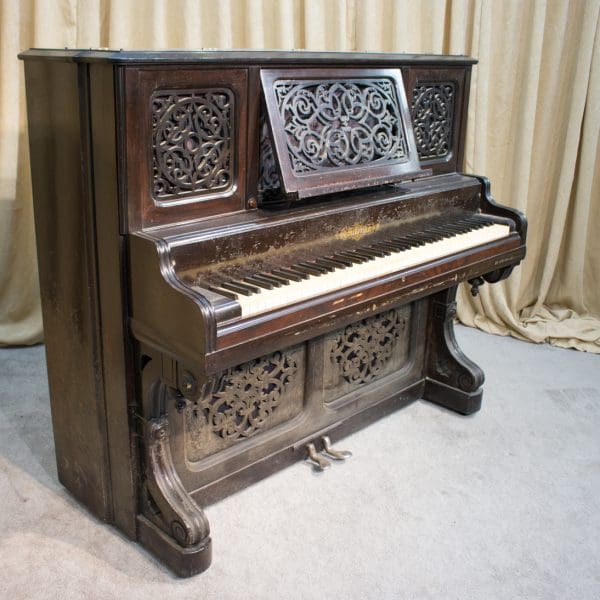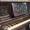 This is a classic full-size Victorian upright piano built by Chickering & Sons in 1881. This piano is made of beautifully carved Brazilian Rosewood. Note that the ornately carved legs, grills and moldings.