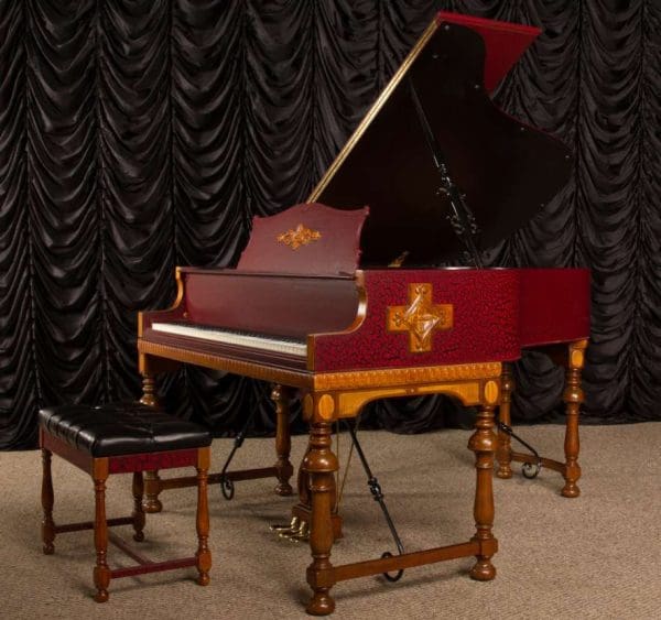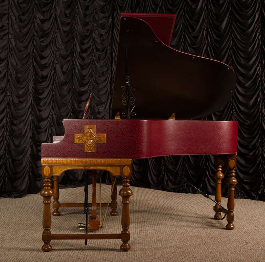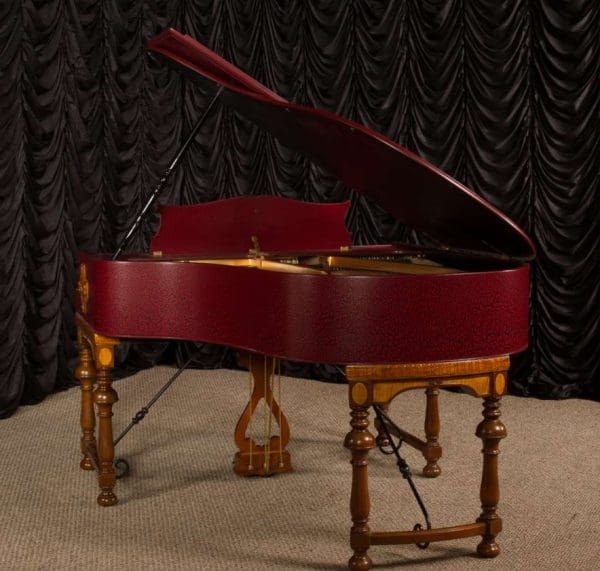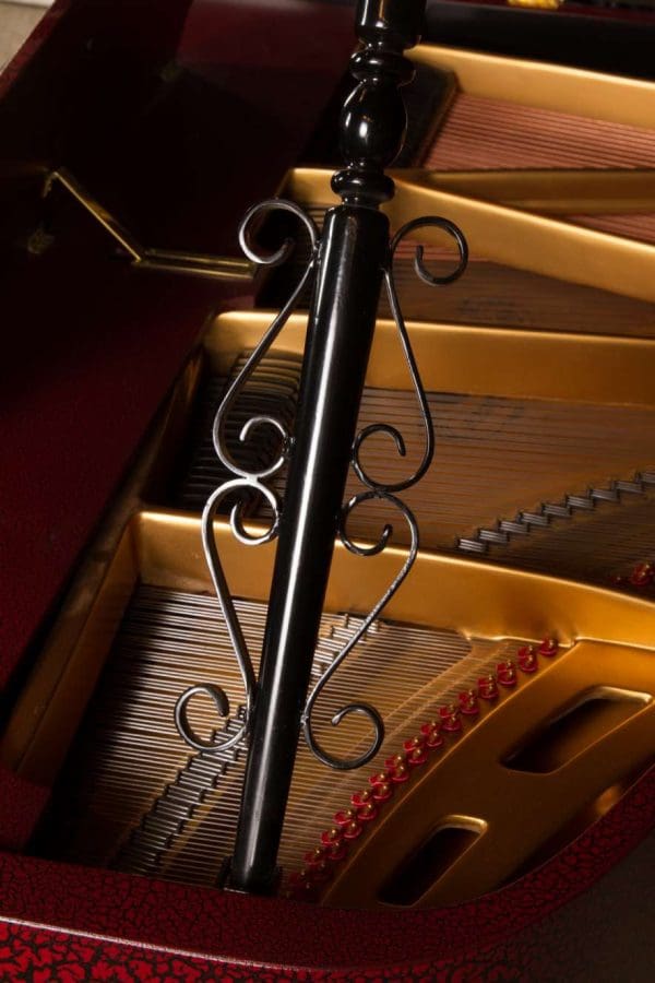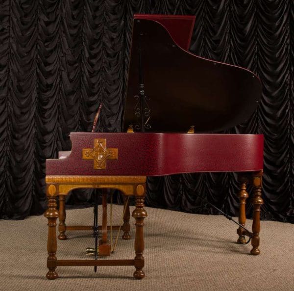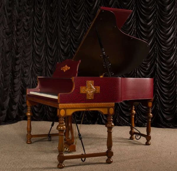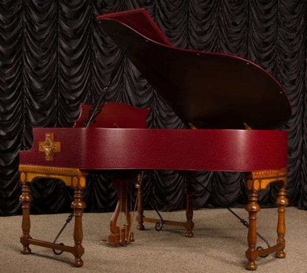This piano is made of beautiful mahogany wood and is finished in a distressed red crackle finish with natural mahogany, black lacquer and gold accents. Note the intricately carved legs which are supported by beautiful wrought ironwork. One can only imagine what palatial period-inspired estate was originally home to this beautiful piano. This piano has been restored to historically correct standards, and is like new in every detail. This beautiful piano has a smooth, even tone which would best be described as “warm and mellow”. This is an instrument which is a joy to play!