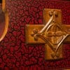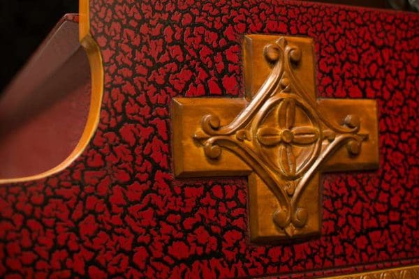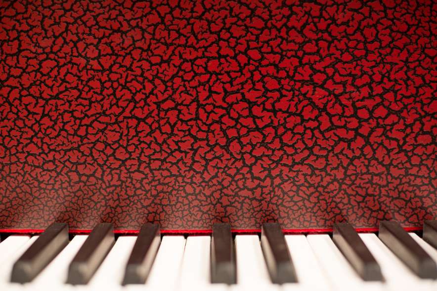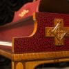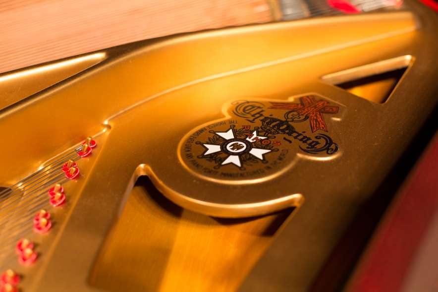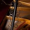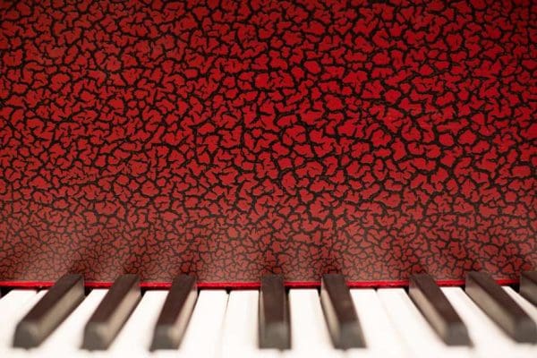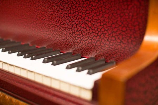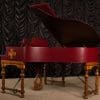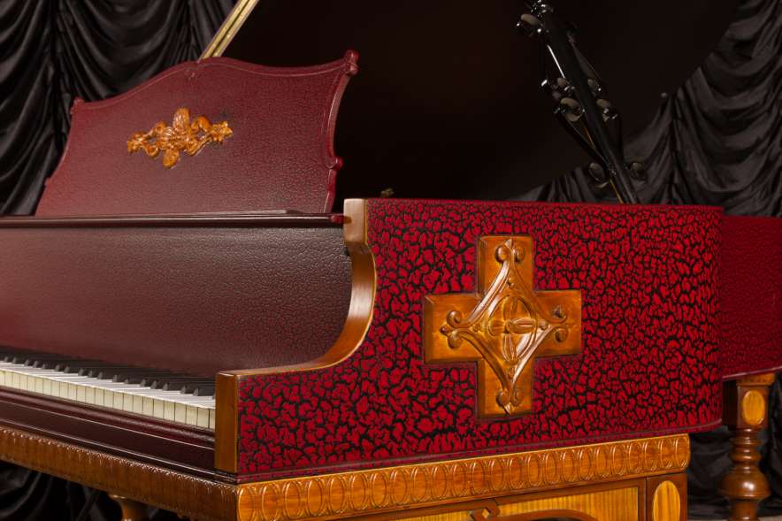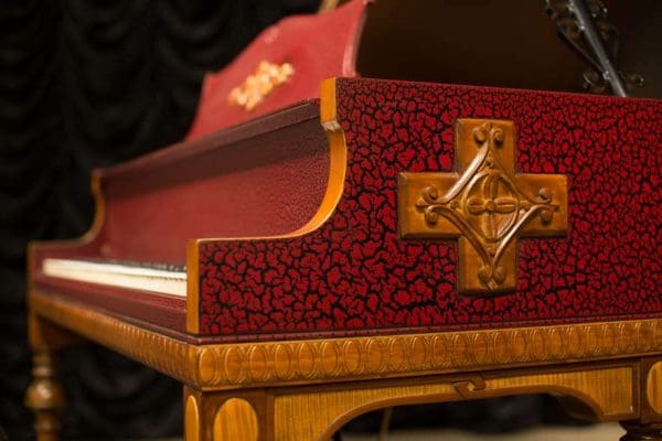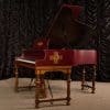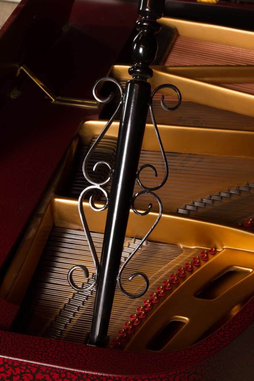This piano is made of beautiful mahogany wood and is finished in a distressed red crackle finish with natural mahogany, black lacquer and gold accents. Note the intricately carved legs which are supported by beautiful wrought ironwork. One can only imagine what palatial period-inspired estate was originally home to this beautiful piano. This piano has been restored to historically correct standards, and is like new in every detail. This beautiful piano has a smooth, even tone which would best be described as “warm and mellow”. This is an instrument which is a joy to play!