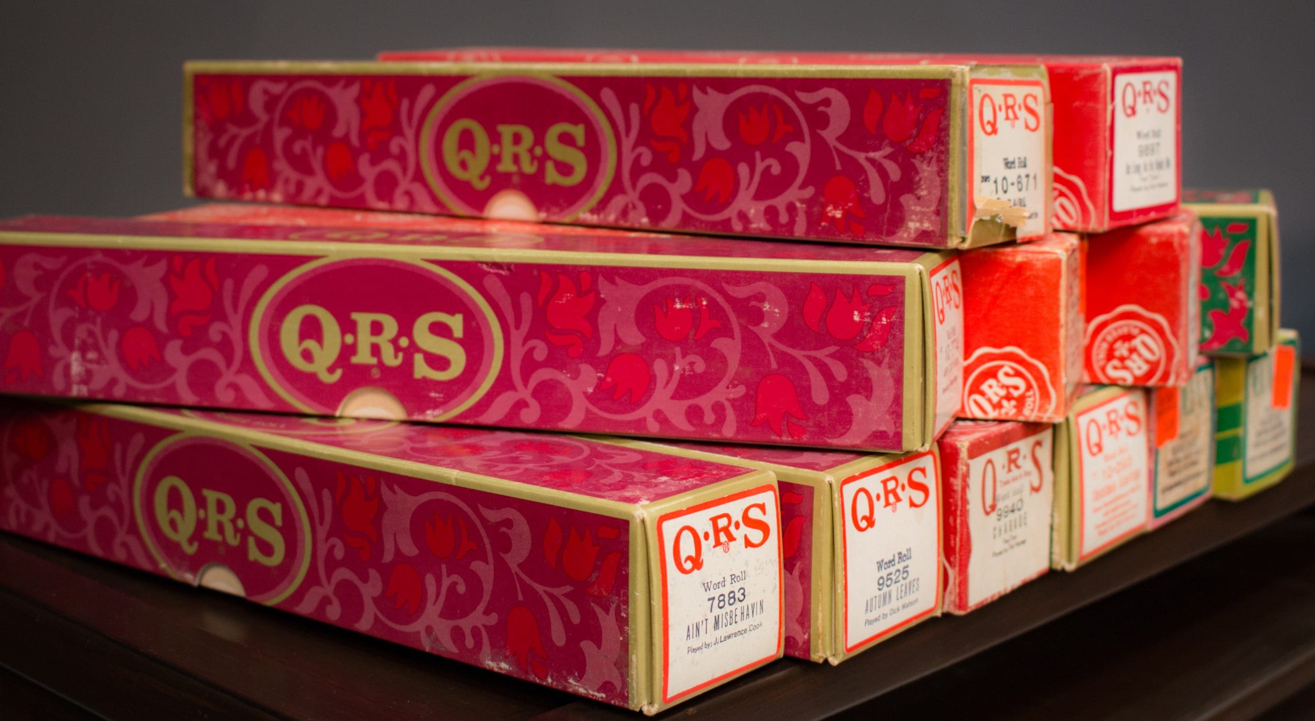 A collection of over 250 original QRS pneumatic player piano rolls is included with this piano.