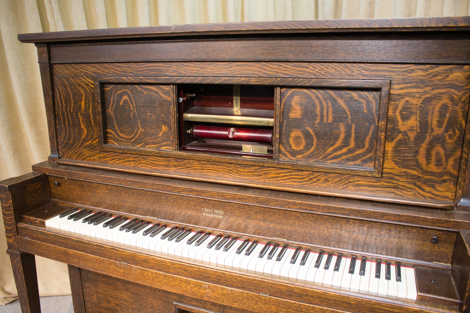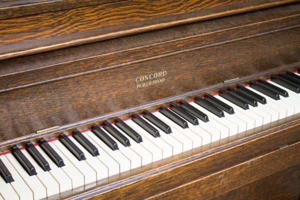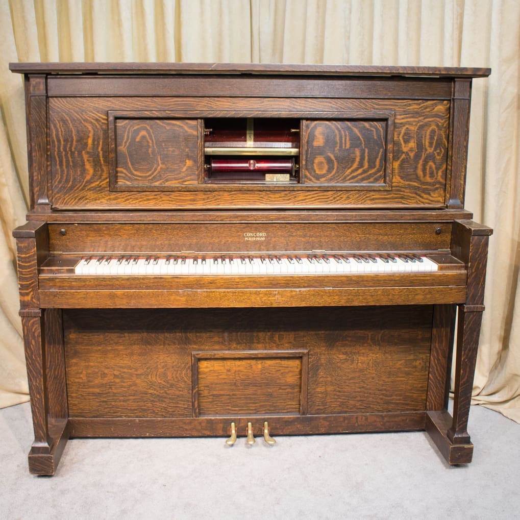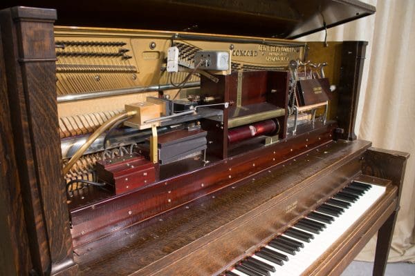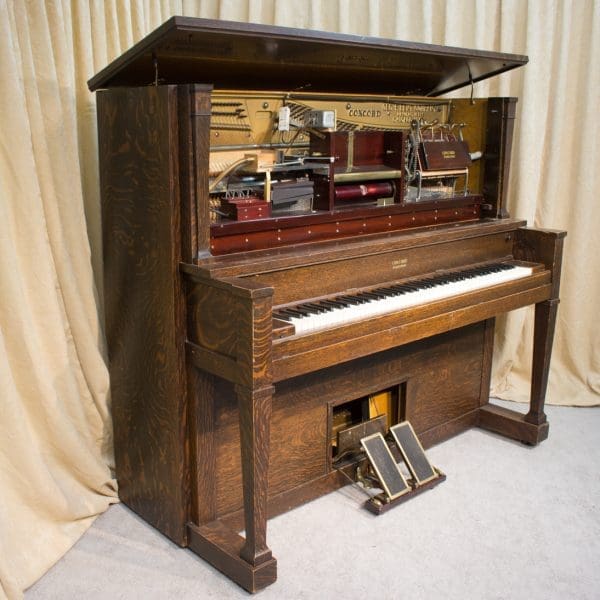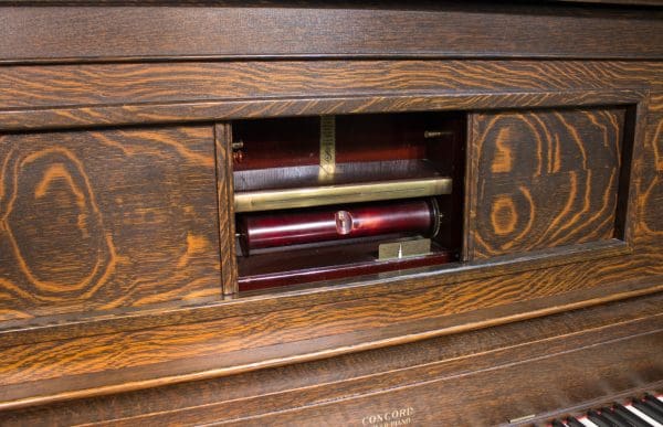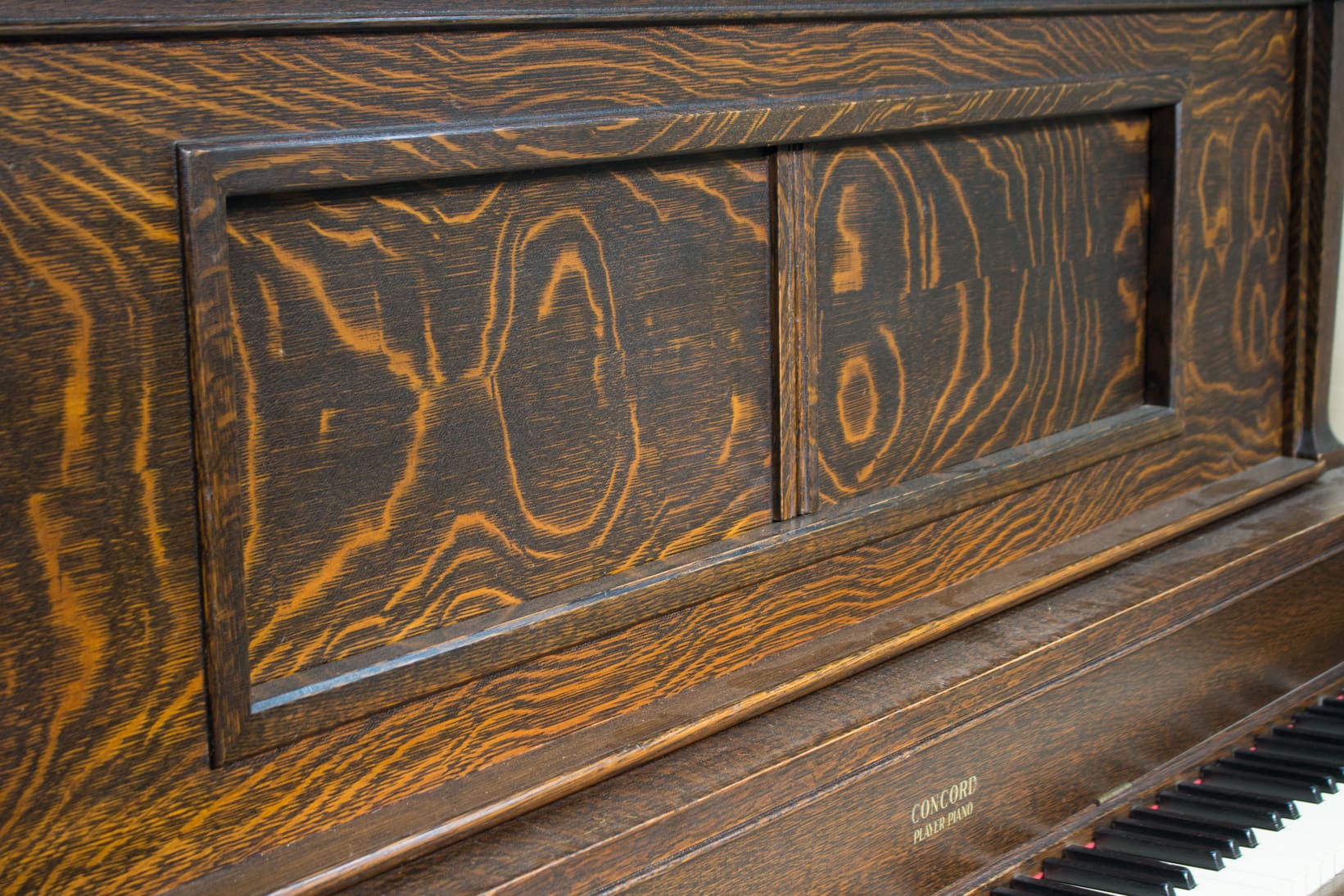 This beautiful player piano was built by the Concord Piano Company in 1909. Concord was part of the famous George P. Bent Piano Company of Chicago. This piano is made of especially beautiful quarter sawn oak wood (also known as “Tiger Oak”) and is of the Mission style.