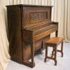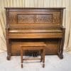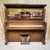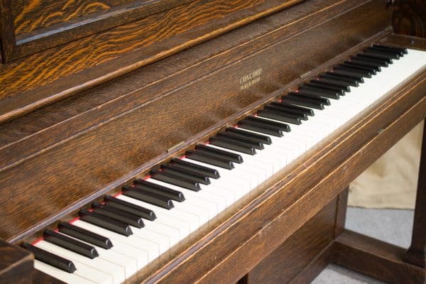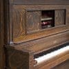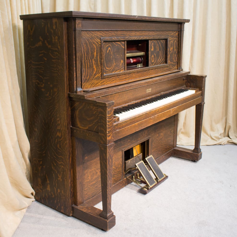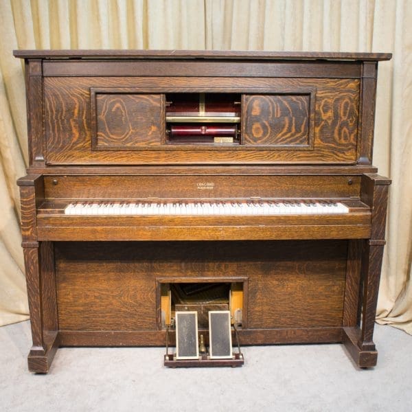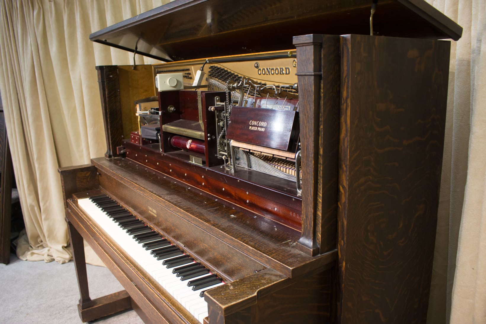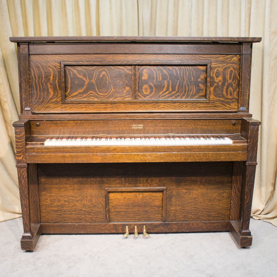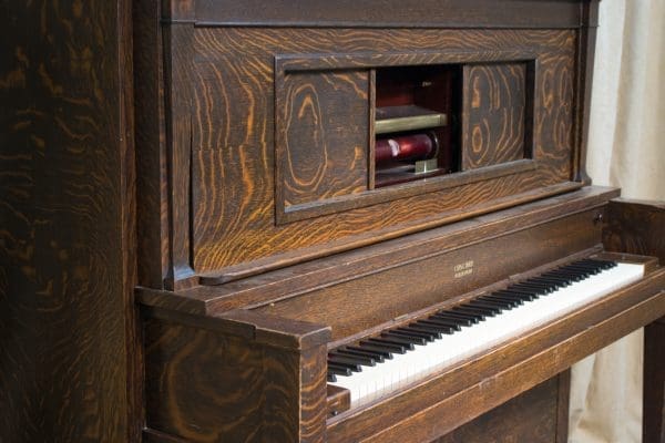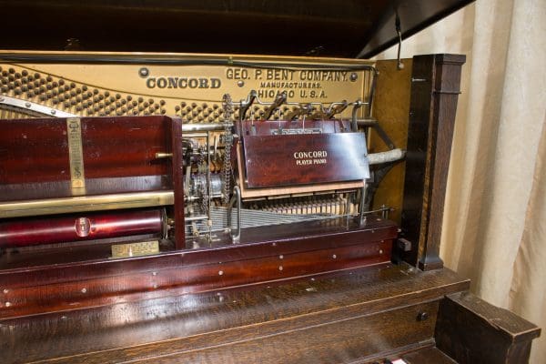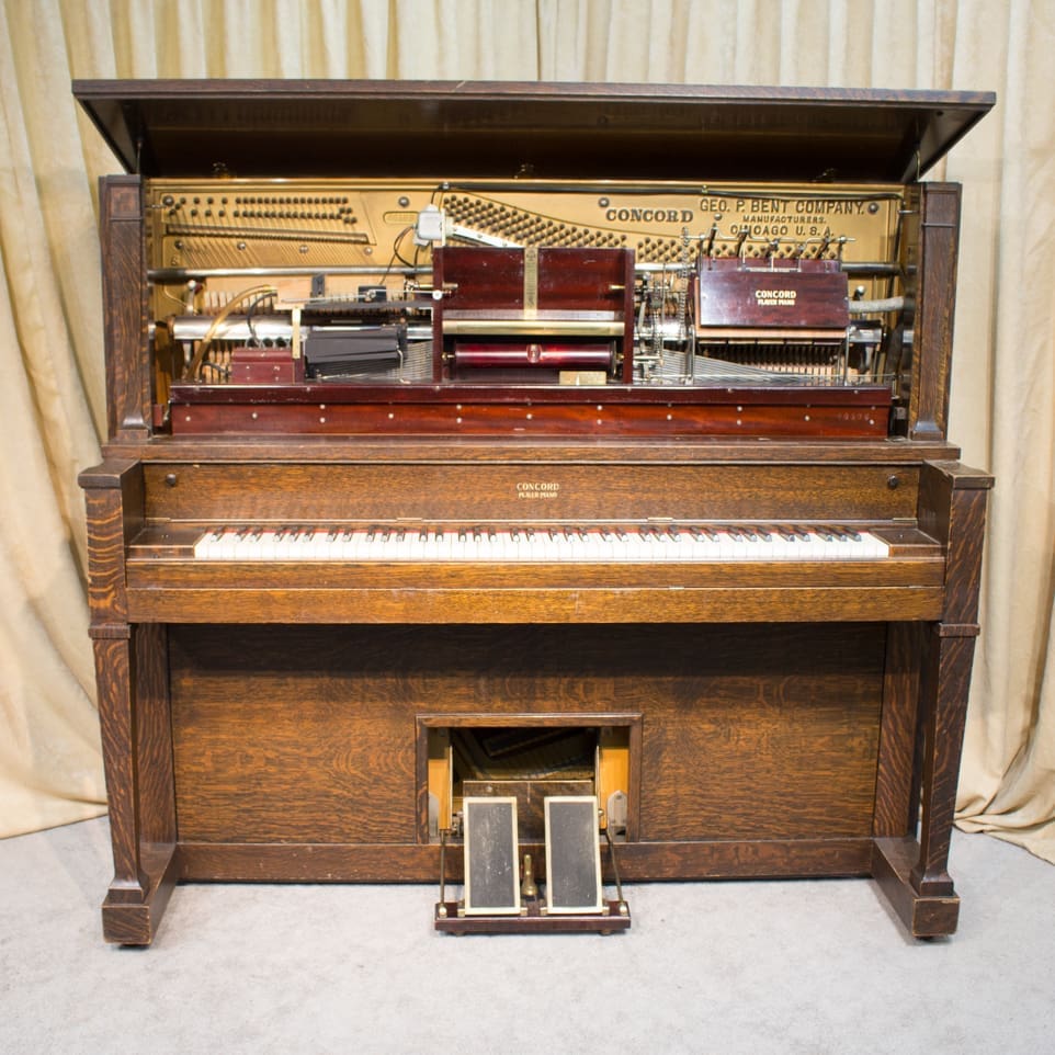 This beautiful player piano was built by the Concord Piano Company in 1909. Concord was part of the famous George P. Bent Piano Company of Chicago. This piano is made of especially beautiful quarter sawn oak wood (also known as “Tiger Oak”) and is of the Mission style.