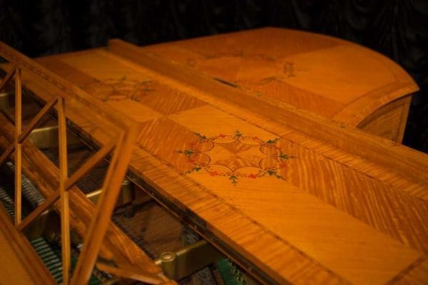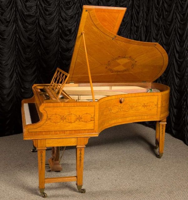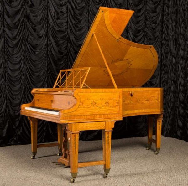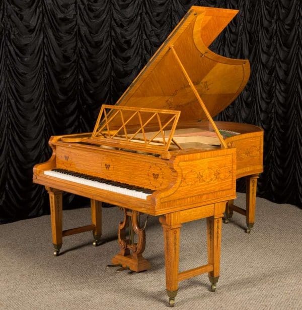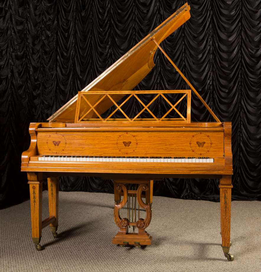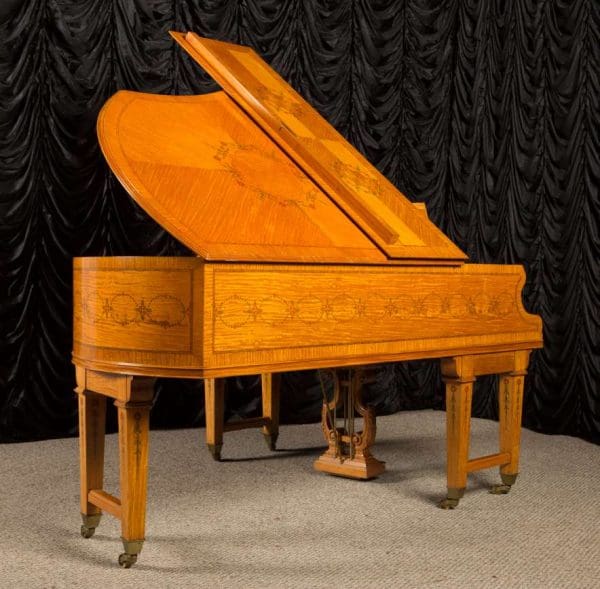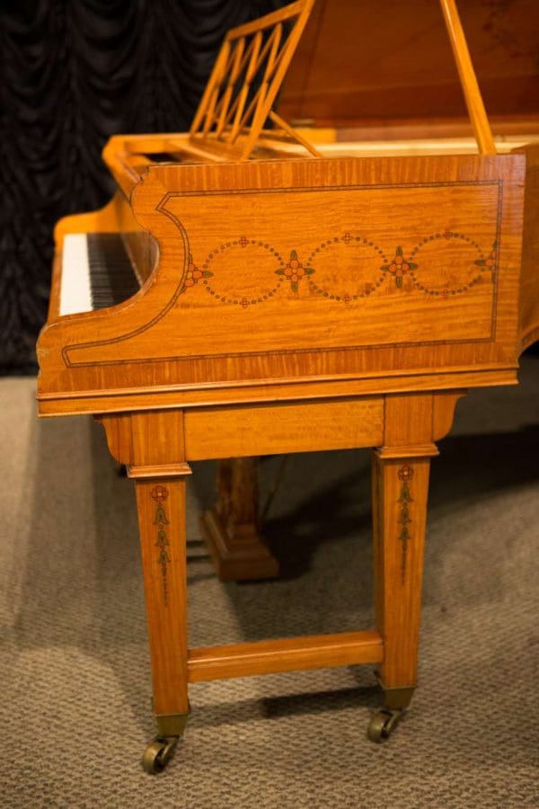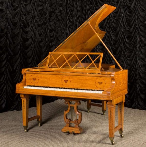 This piano is a rare, custom made piano built by the famous Bechstein Piano Company of Germany in 1876. This instrument is especially rare because it is made of beautiful golden satinwood with extensive marquetry and hand-painted detail. Most pianos built during the late 19th Century were made in of very dark woods or even black finishes to match dark and heavy Victorian era décor. They were rarely made in blonde or golden wood tones like this unique instrument. The custom designed cabinet has extensive inlay and marquetry depicting flowers, sea shells, butterflies, and ivy. The inlay and marquetry is also accented with delicately hand-painted detail, making this one of the most unusual and beautiful Victorian era pianos we’ve ever seen. Note the beautifully carved pedal lyre and elaborate use of marquetry inlay on the music stand even the smallest details have been executed with extraordinary precision.