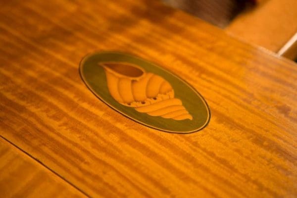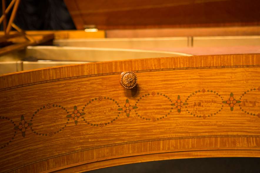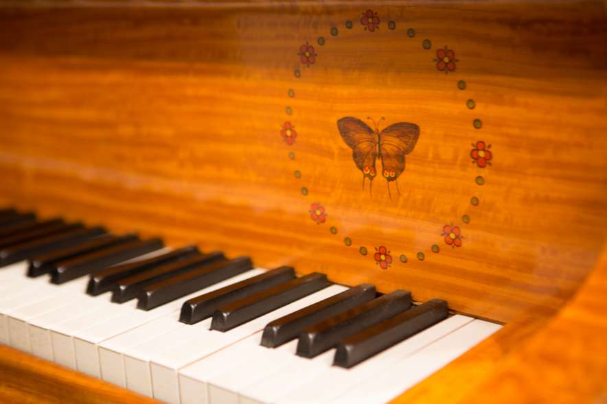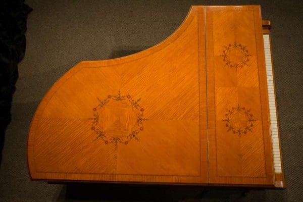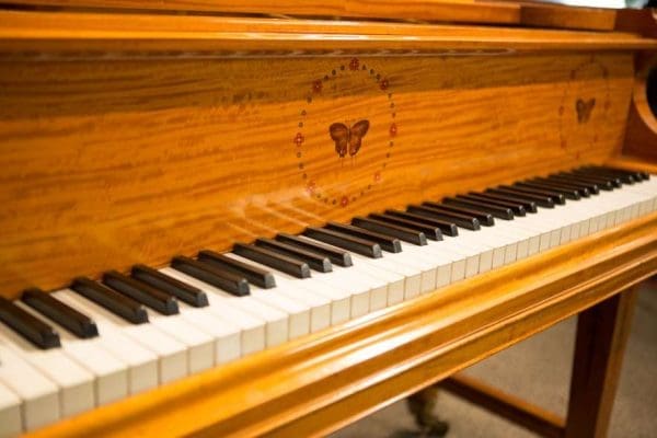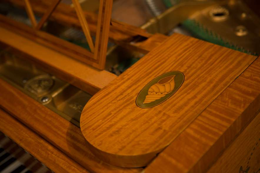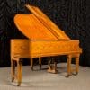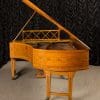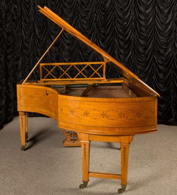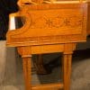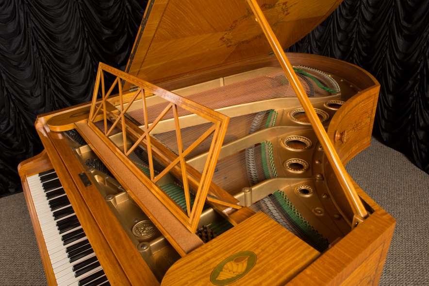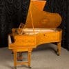 This piano is a rare, custom made piano built by the famous Bechstein Piano Company of Germany in 1876. This instrument is especially rare because it is made of beautiful golden satinwood with extensive marquetry and hand-painted detail. Most pianos built during the late 19th Century were made in of very dark woods or even black finishes to match dark and heavy Victorian era décor. They were rarely made in blonde or golden wood tones like this unique instrument. The custom designed cabinet has extensive inlay and marquetry depicting flowers, sea shells, butterflies, and ivy. The inlay and marquetry is also accented with delicately hand-painted detail, making this one of the most unusual and beautiful Victorian era pianos we’ve ever seen. Note the beautifully carved pedal lyre and elaborate use of marquetry inlay on the music stand even the smallest details have been executed with extraordinary precision.