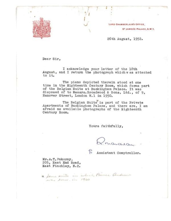 Recently found paperwork also explains this piano was once inside the private apartments of Buckingham Palace in London, England. An official letter from the Lord Chamberlain’s Office of The Palace dated August 26th, 1952, says this piano stood at one time in the Eighteenth Century Room, which forms part of the Belgian Suite at Buckingham Palace.