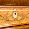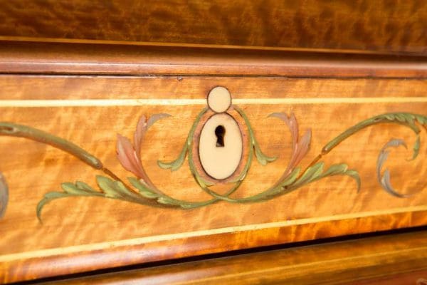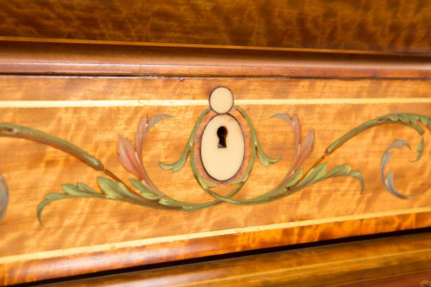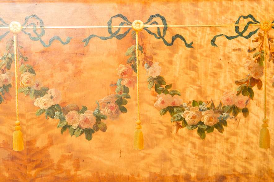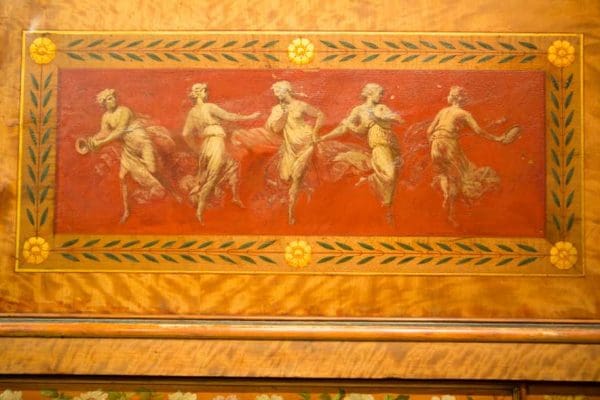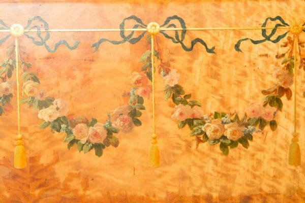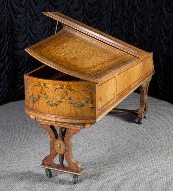 Broadwoods own records tell us that this piano left the Broadwood factory July 12th, 1877. It was sent to a small firm of artists known as “Monblond & Coiffier” of 27 Castle Street East at Oxford St., London. The artists of Monblond & Coiffier carried out the decorative painted work of floral garlands and dancing figurines on the satinwood case. The newly decorated piano was then returned to Broadwoods showrooms on September 22, 1877.