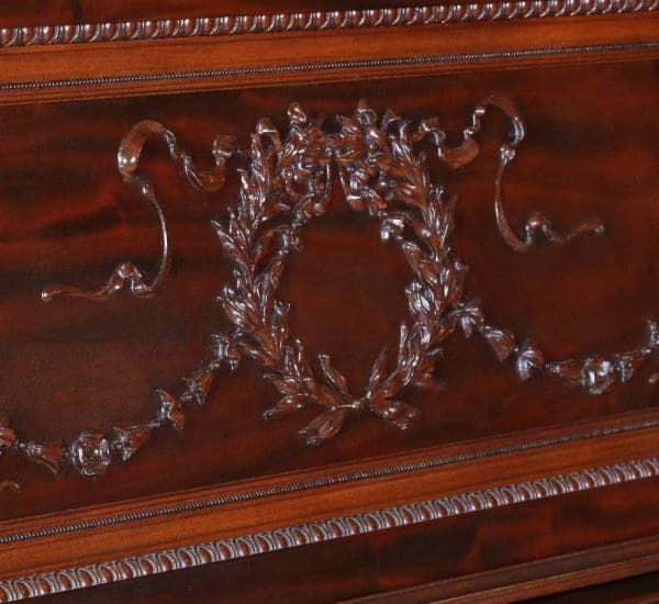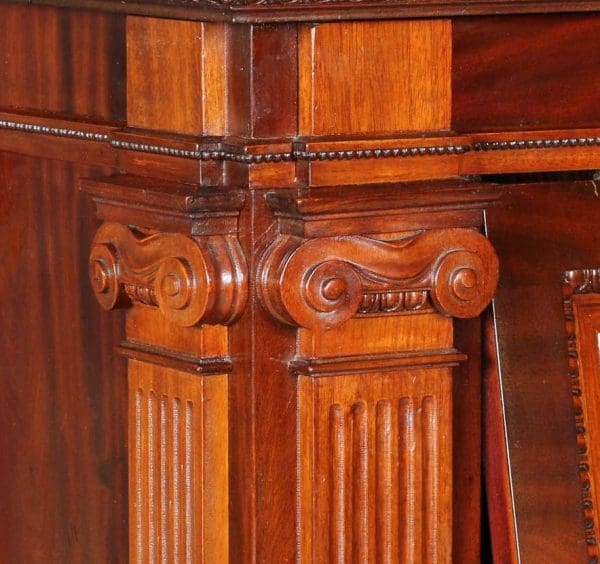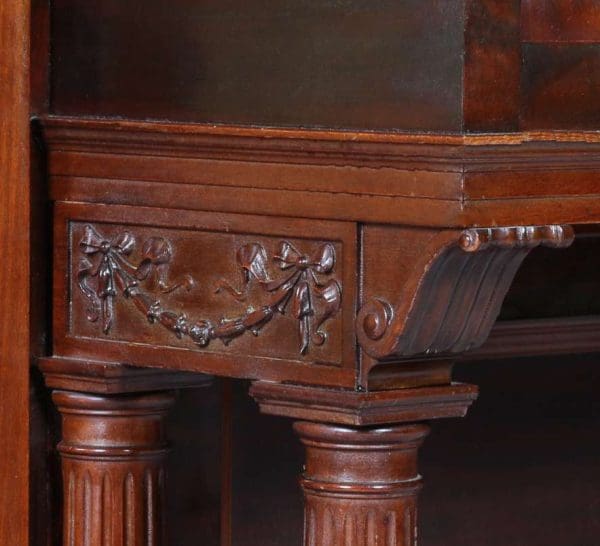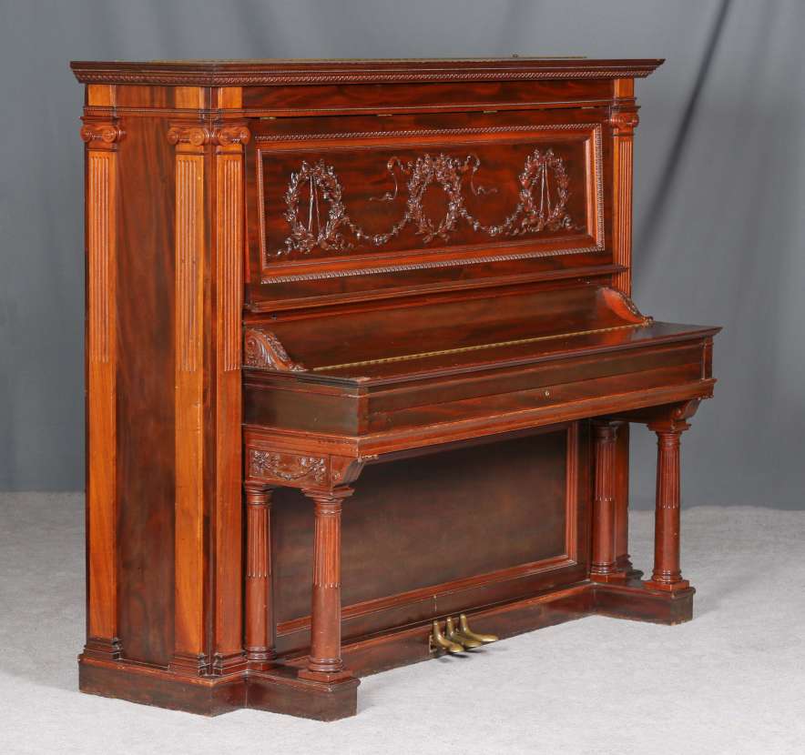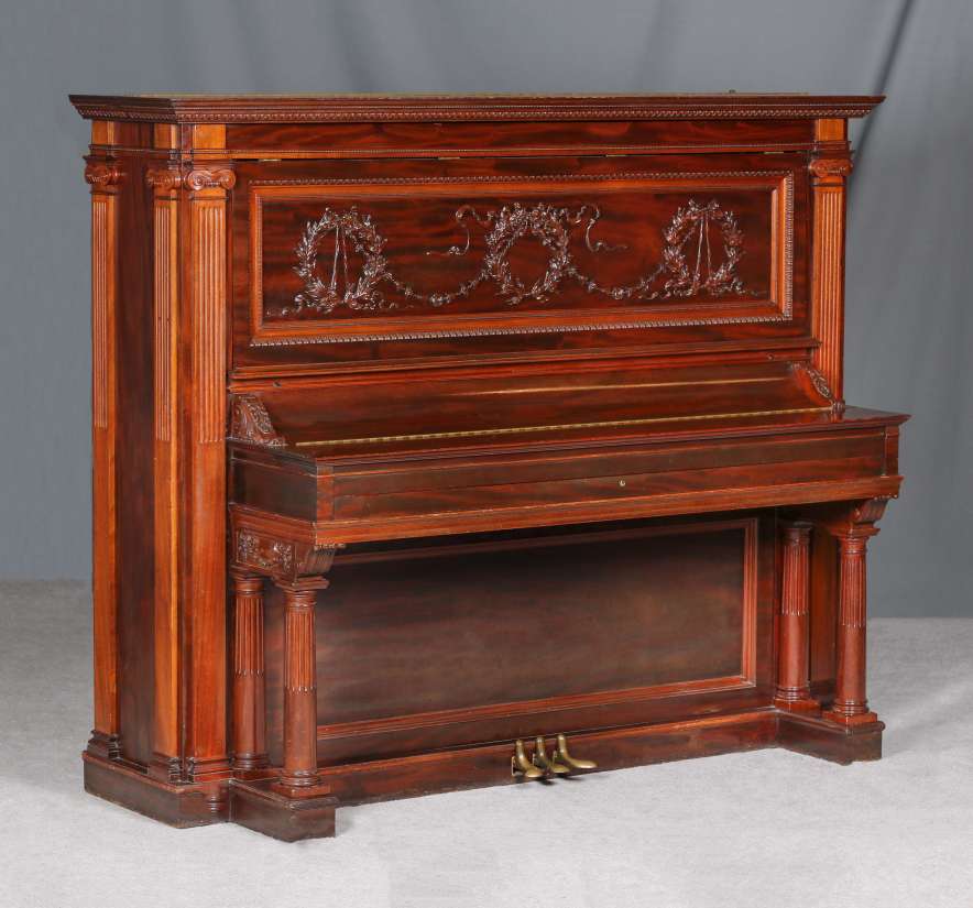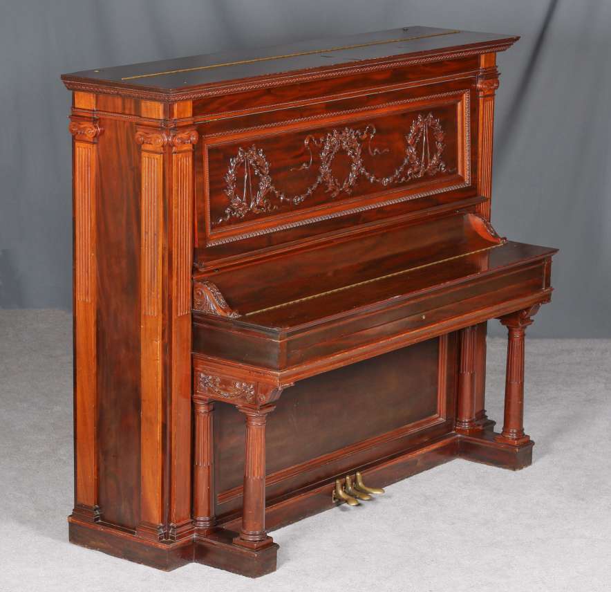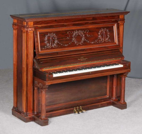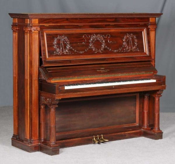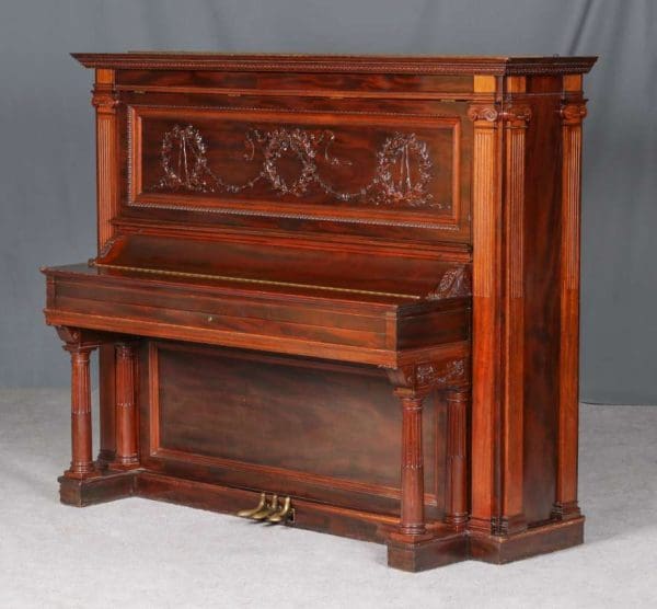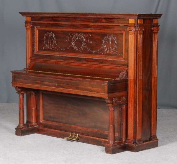 Architecture and furniture in turn-of-the-century America was greatly influenced by the revival of historical period styles. As the Victorian period transitioned into the new century, interior design began to reflect elements of classical periods like Greek Revival, French Baroque, Tuscan, Jacobean, etc.This custom-designed piano was built by the famous Wm. Knabe & Co., the official piano of the Metropolitan Opera. This beautiful instrument reflects stylistic elements of the Greco-Roman period beautifully executed in Honduran Mahogany wood. The sides of the piano are adorned with 6 full-length Ionic columns which give the instrument an architectural feel reminiscent of ancient palaces and temples. The front legs of the instrument feature 4 smaller Doric columns which support the keyboard. The front panel of the instrument is beautifully adorned with a classic wreath and garland swag design often found carved in the stone facades of ancient Rome. These fantastic elements are all tied together with two beautifully carved Romanesque Acanthus leaves on either side of the keyboard, a classic design element in both Roman and Greek Revival styles.This is a large, full-size instrument with the tone quality of a full grand piano. Not only is this a uniquely beautiful piece, but also a performance-quality musical instrument.
