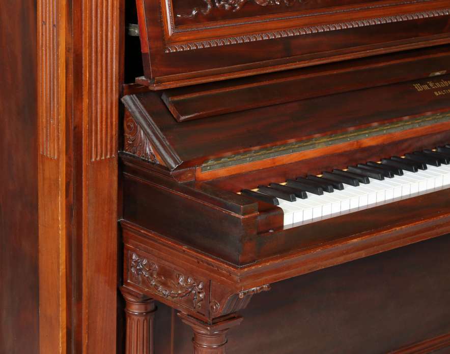 The piano is shown here prior to restoration. This piano is being completely restored, inside and out, with a historical perspective in mind. The buyer will be able to have input into color and finish if requested. If desired, this piano can be equipped with the Pianomation player system, and can play by itself by streaming music live on an iPod, computer, iPad, etc. More than 10,000 song titles are available!A historically accurate ball & claw foot spin-top piano stool is included.