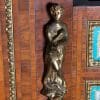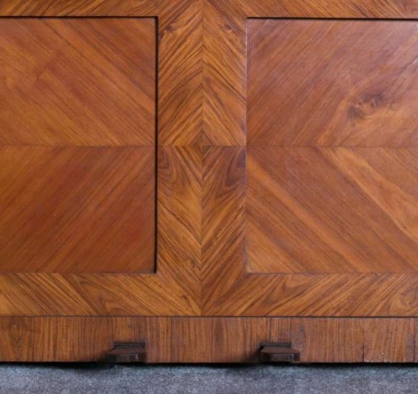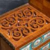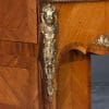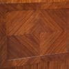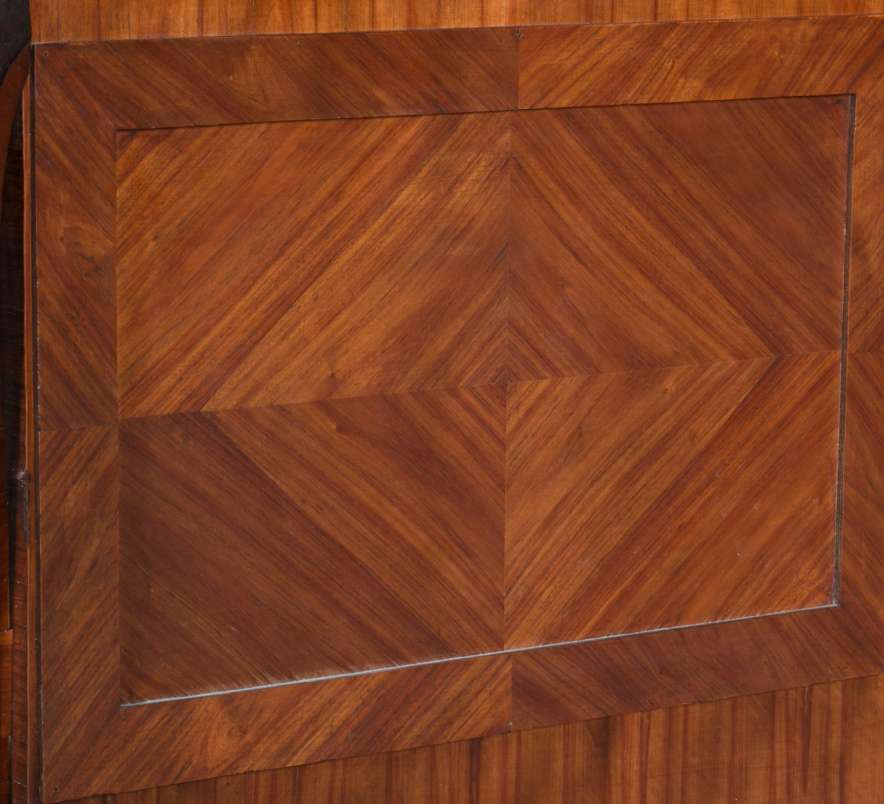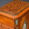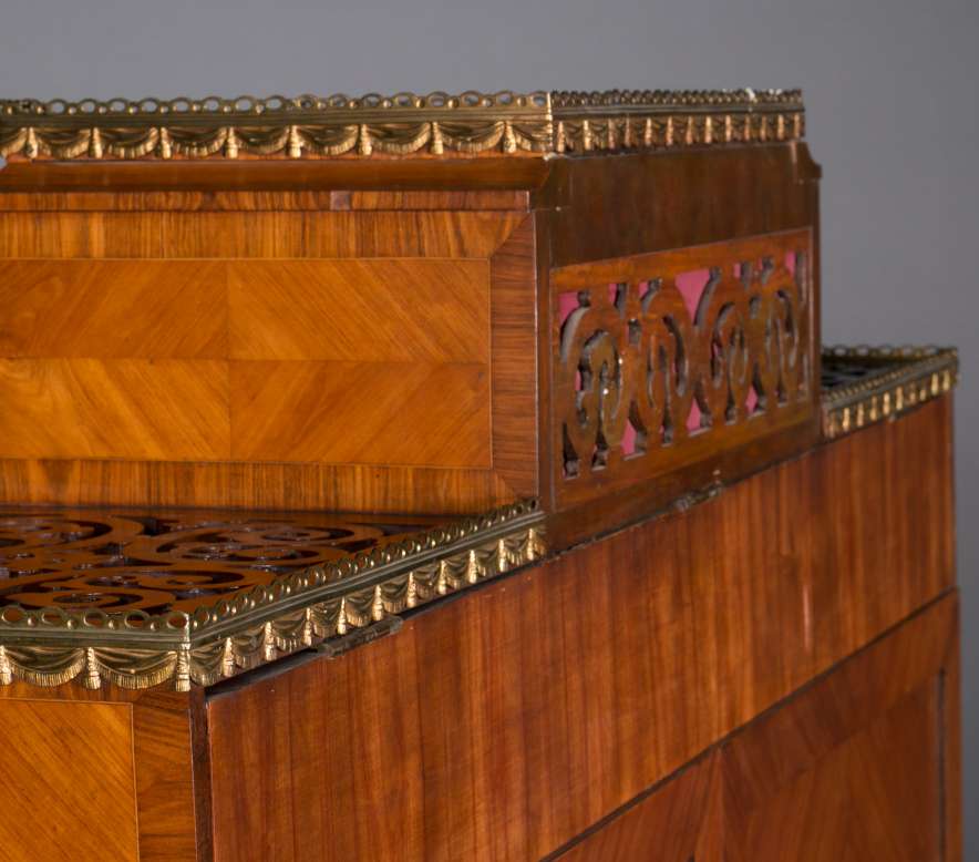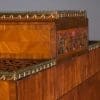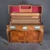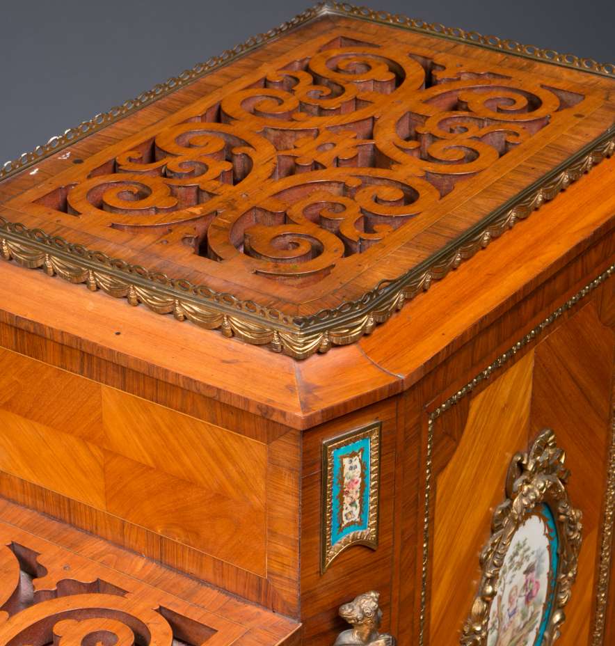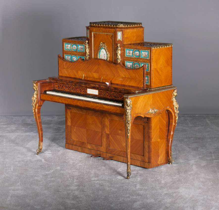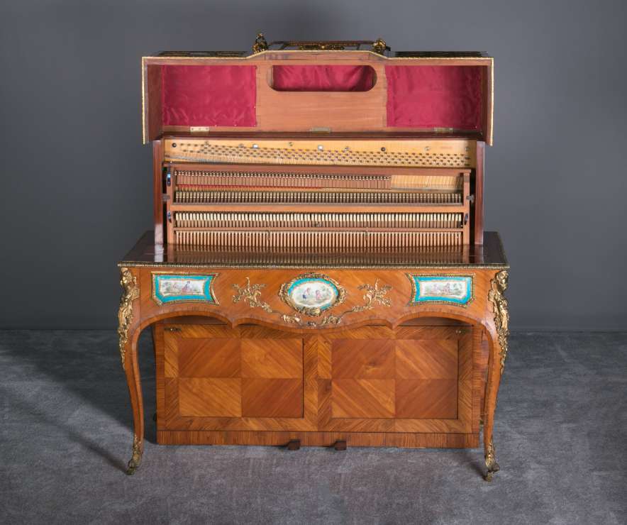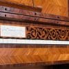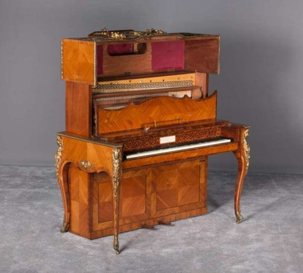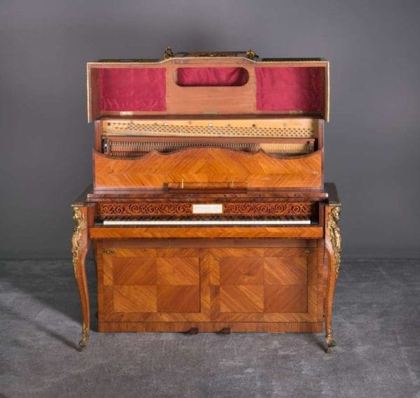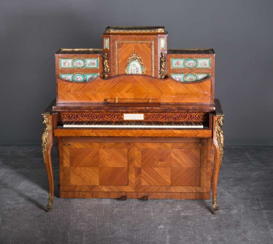 Designed to be set in the middle of a room rather than against a wall, the backside of the instrument is also finished in beautifully paneled satinwood and rosewood marquetry and veneers. Note the beautifully carved filigree grills in the top of the instrument; these grills act as “speakers” which allow the sound to escape from inside the cabinet and flow out into the room.