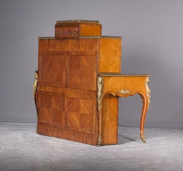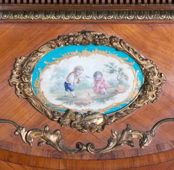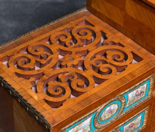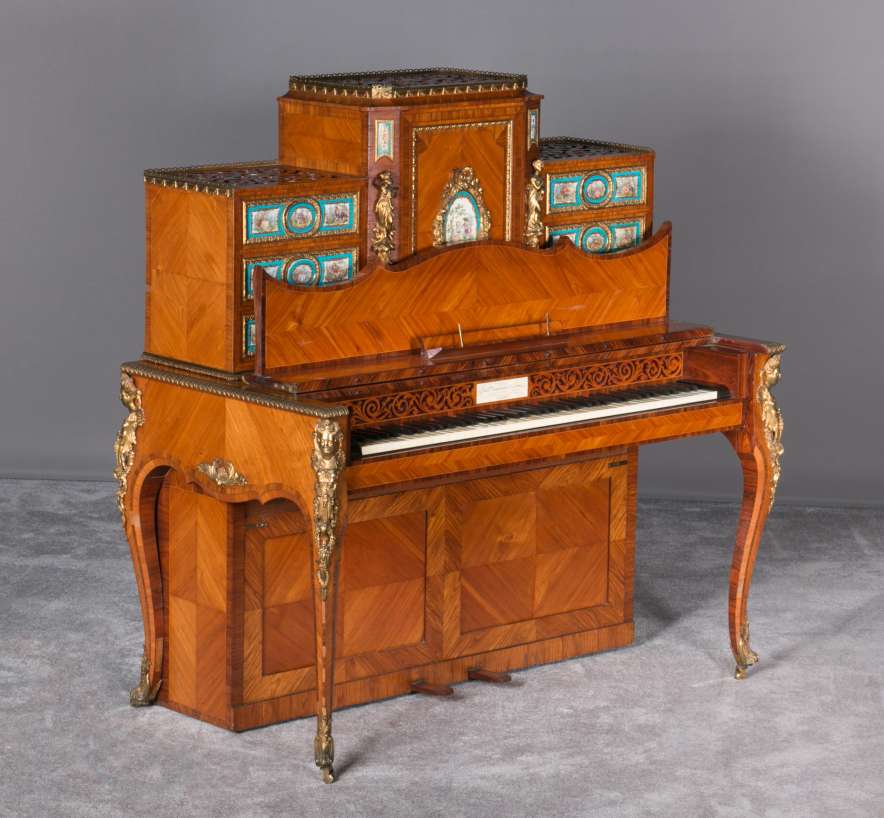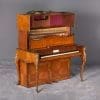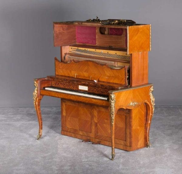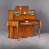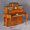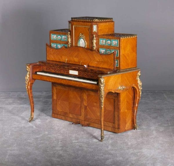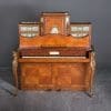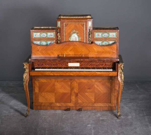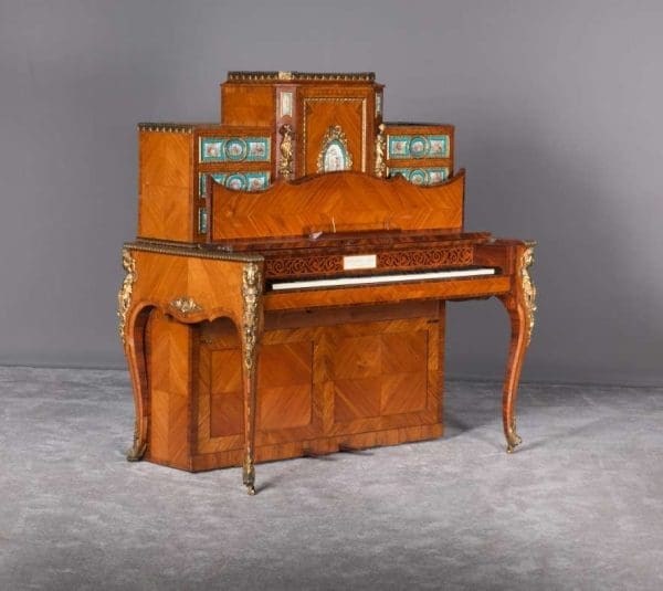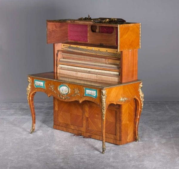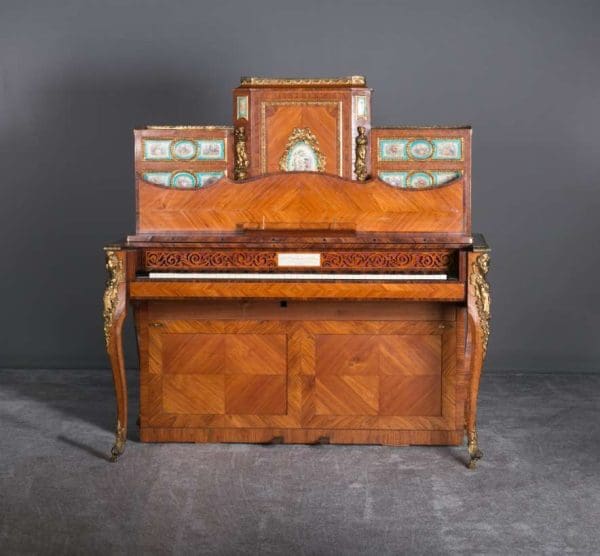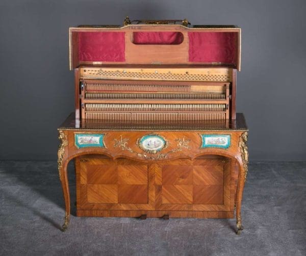 The firm of Toms & Luscombe specialized in building ornamental French and Baroque Rococo style furniture. It is speculated that they were contracted by a wealthy client to build this instrument in the appearance of an elaborate writing desk in order to match other furnishings where an ordinary upright piano might look out of place. Toms & Luscombe successfully executed this piece in a true Louis XV/Rococo design throughout, disguising the instrument so well that one would never realize it was a piano unless the keyboard cover was open! This piano is made of beautifully crafted satinwood and rosewood marquetry, veneers and inlay. The case is adorned with exquisite brass ormolu trim and French Sevres hand-painted porcelain inserts.