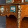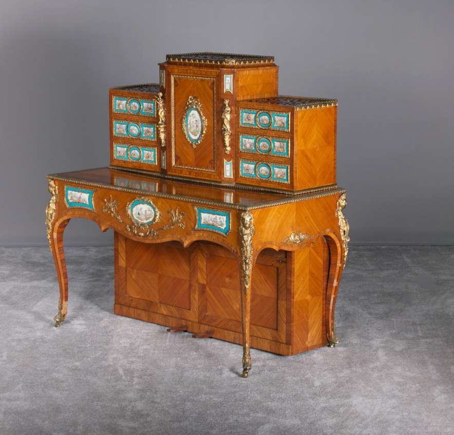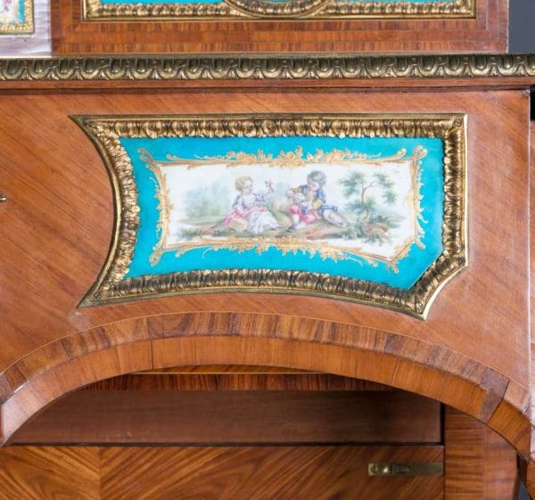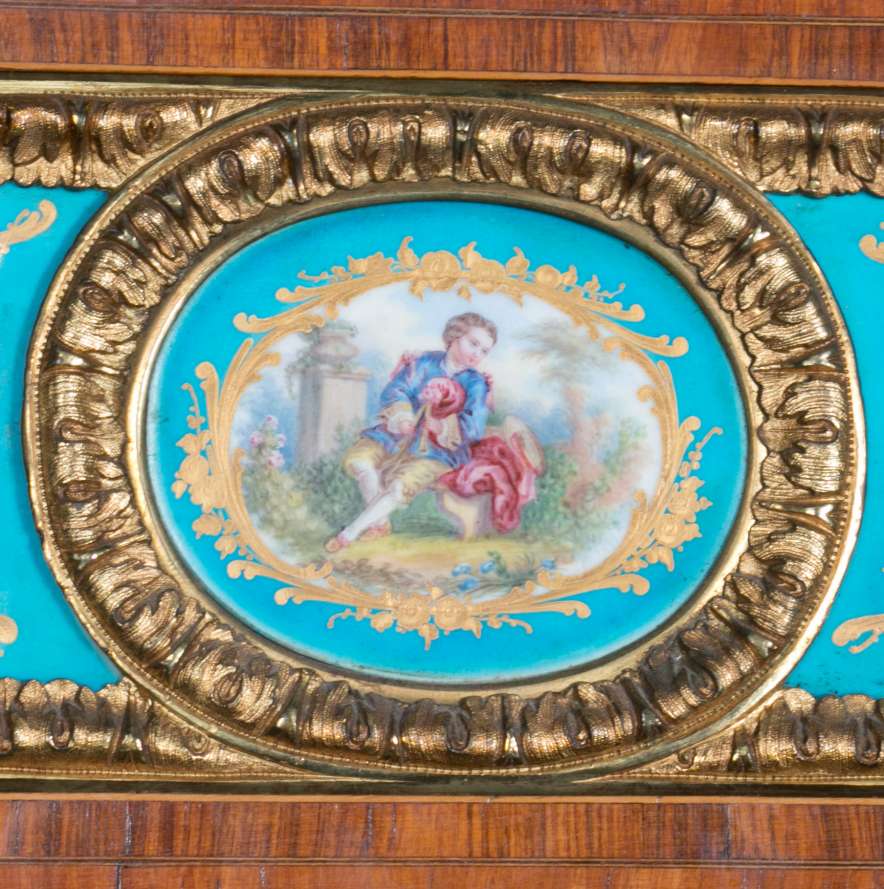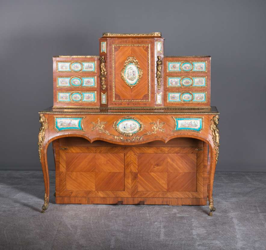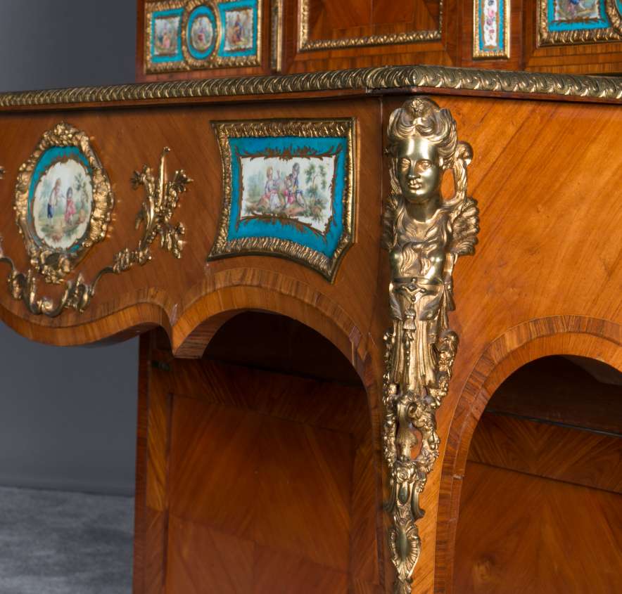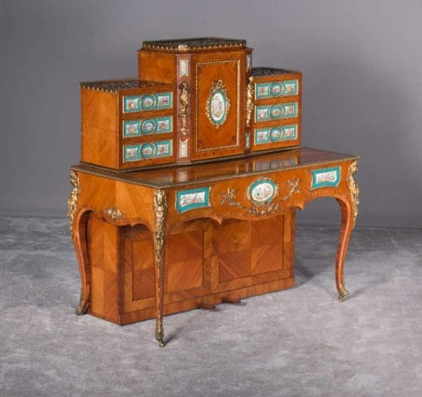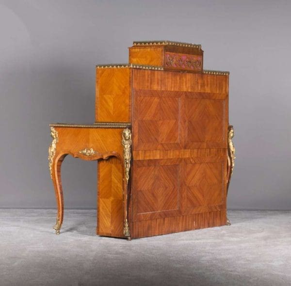 The firm of Toms & Luscombe specialized in building ornamental French and Baroque Rococo style furniture. It is speculated that they were contracted by a wealthy client to build this instrument in the appearance of an elaborate writing desk in order to match other furnishings where an ordinary upright piano might look out of place. Toms & Luscombe successfully executed this piece in a true Louis XV/Rococo design throughout, disguising the instrument so well that one would never realize it was a piano unless the keyboard cover was open! This piano is made of beautifully crafted satinwood and rosewood marquetry, veneers and inlay. The case is adorned with exquisite brass ormolu trim and French Sevres hand-painted porcelain inserts.