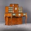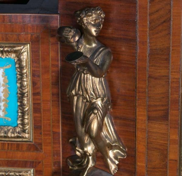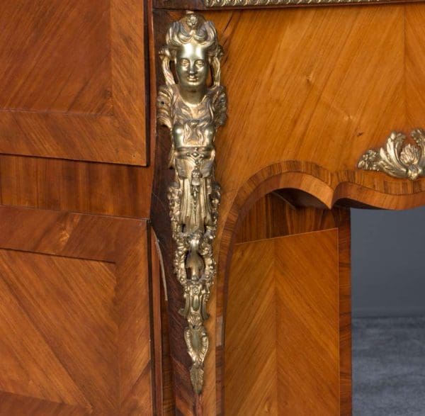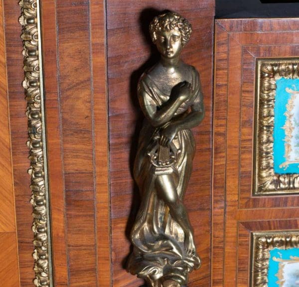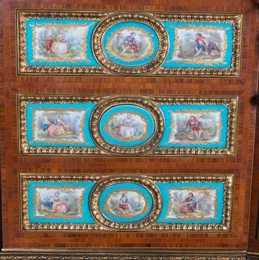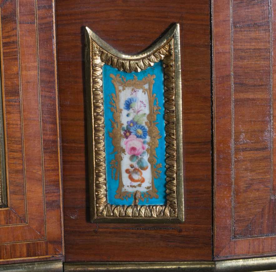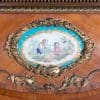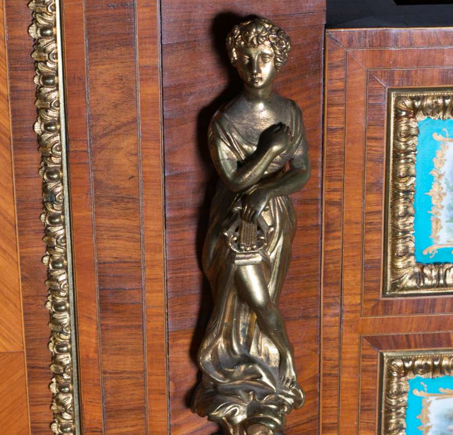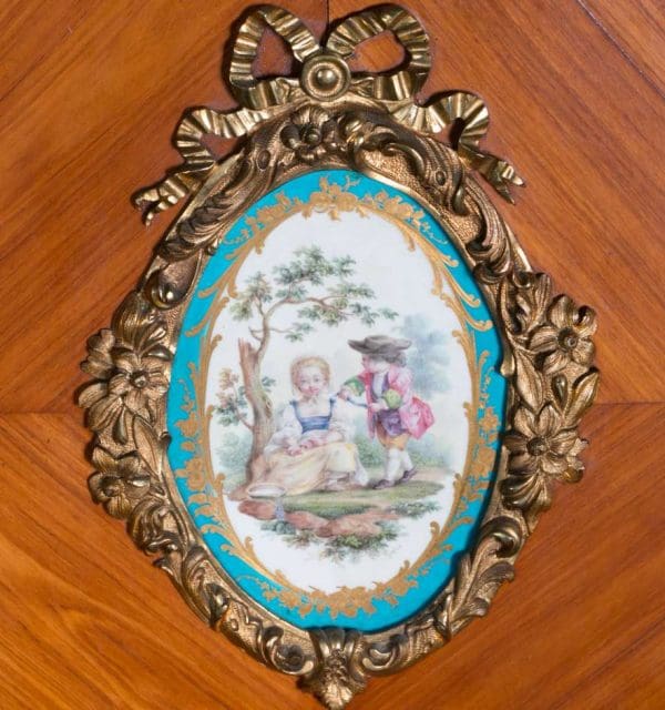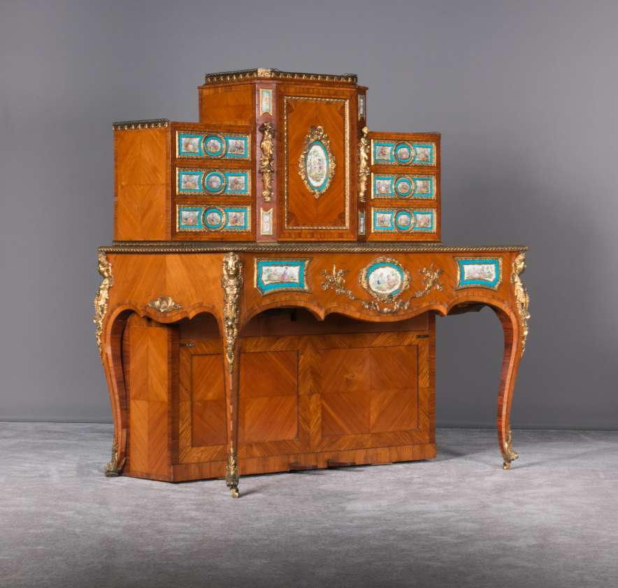 The firm of Toms & Luscombe specialized in building ornamental French and Baroque Rococo style furniture. It is speculated that they were contracted by a wealthy client to build this instrument in the appearance of an elaborate writing desk in order to match other furnishings where an ordinary upright piano might look out of place. Toms & Luscombe successfully executed this piece in a true Louis XV/Rococo design throughout, disguising the instrument so well that one would never realize it was a piano unless the keyboard cover was open! This piano is made of beautifully crafted satinwood and rosewood marquetry, veneers and inlay. The case is adorned with exquisite brass ormolu trim and French Sevres hand-painted porcelain inserts.