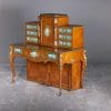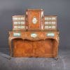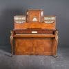 Disguised as an ornamental writing desk, complete with four corner legs and a tower of false drawers, this piece reveals itself as an upright piano by simply opening the keyboard cover! This amazing piano was originally ordered from Broadwood’s factory as a plain stock piano by the illustrious firm of “Toms and Luscombe, London”, specialty manufacturers of ornamental furniture.