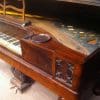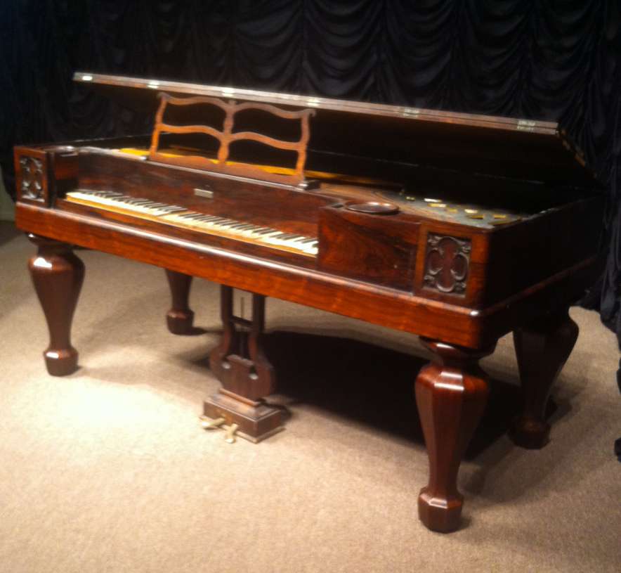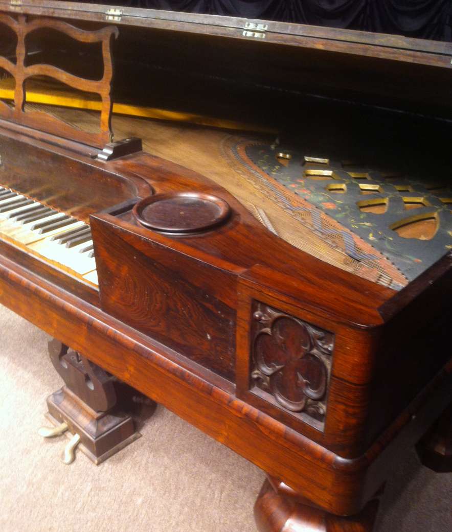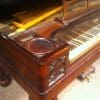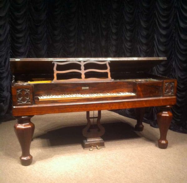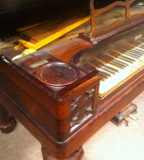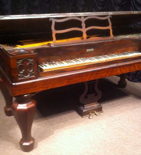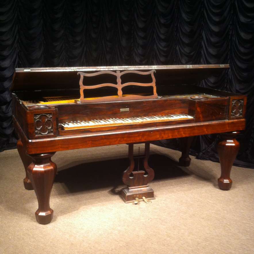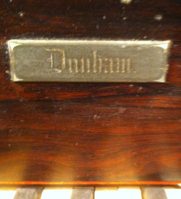 This is a lovely square piano by the J. B. Dunham Piano Company of New York. Dunham was a major manufacturer in New York City during the early to middle 19th Century, and his pianos are of very good quality and craftsmanship.This lovely piano is made of a lovely grain Brazilian Rosewood and is of the Empire Revival style. Note the lovely carved Gothic-influienced panels on either side of the keyboard. This piano was built in 1864, right at the height of the Civil War in America. It is facinating to think about what was happening in American Society while this piano was being built and sold to it’s original owners!This piano is being restored to like new condition, inside and out, When restoration is complete, it will have a lovely harp-like tone quality suitable for early music.