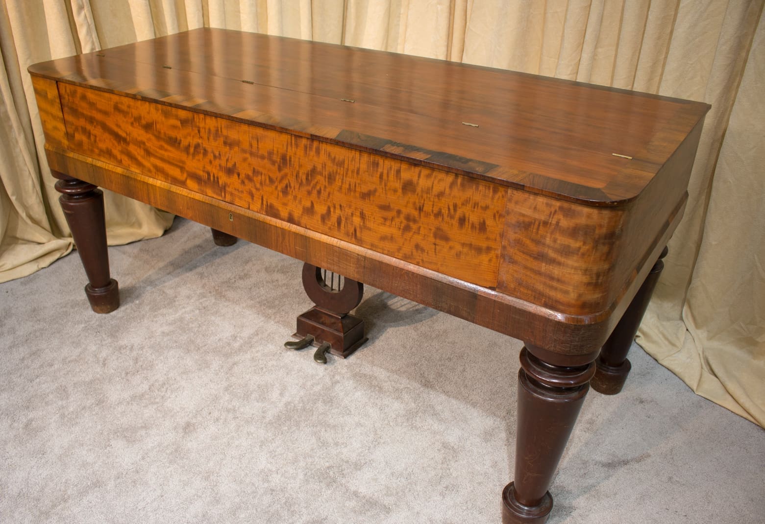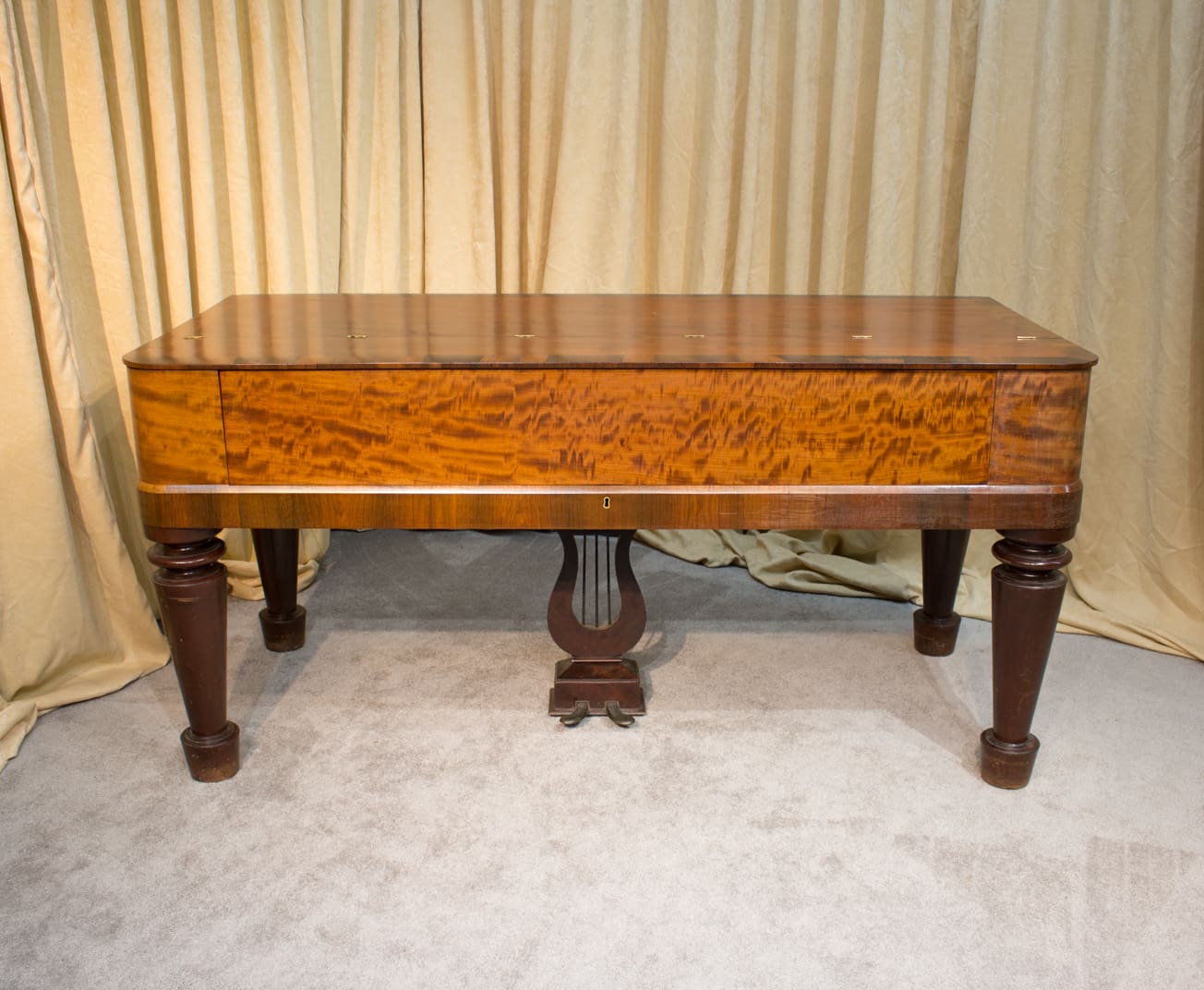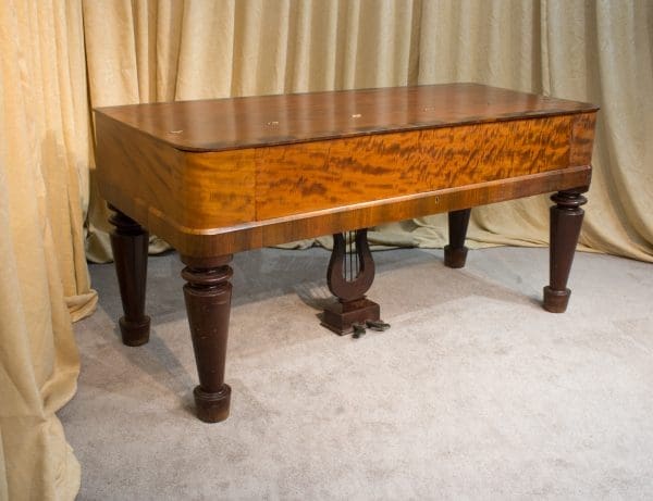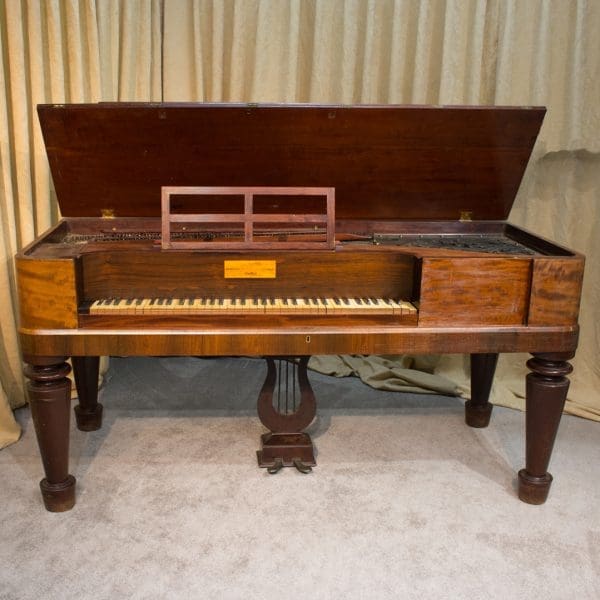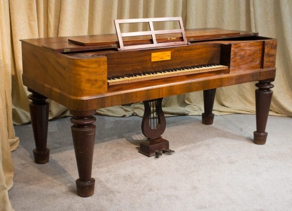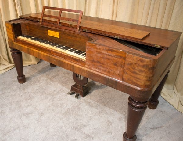 This lovely piano is made of imported Honduran “Crotch” Mahogany wood and is of the Empire Revival style. Most square pianos from this period were made of dark rosewood, few were made in light mahogany wood. The tone of these early square pianos is quite remarkable and pleasant to listen to. They have an almost “harp-like” quality which makes these instruments ideal for classical music and historical performances.