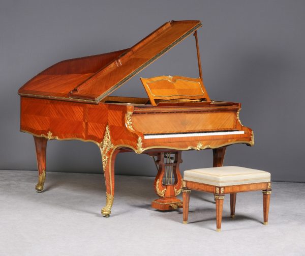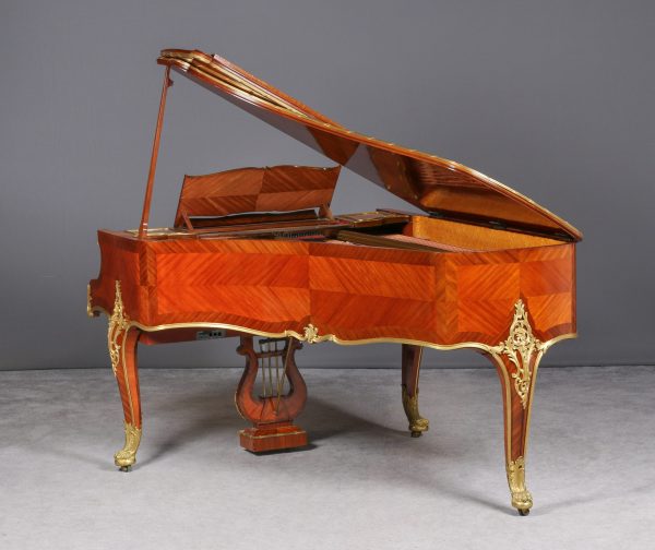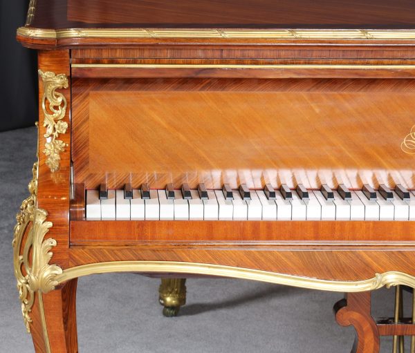 This instrument is made of beautifully carved mahogany wood trimmed with extravagantly detailed brass Ormolu accents which cover the entire case. The legs, lyre, and molding are extensively carved and gilded, giving the piano a stunning and formal appearance overall.