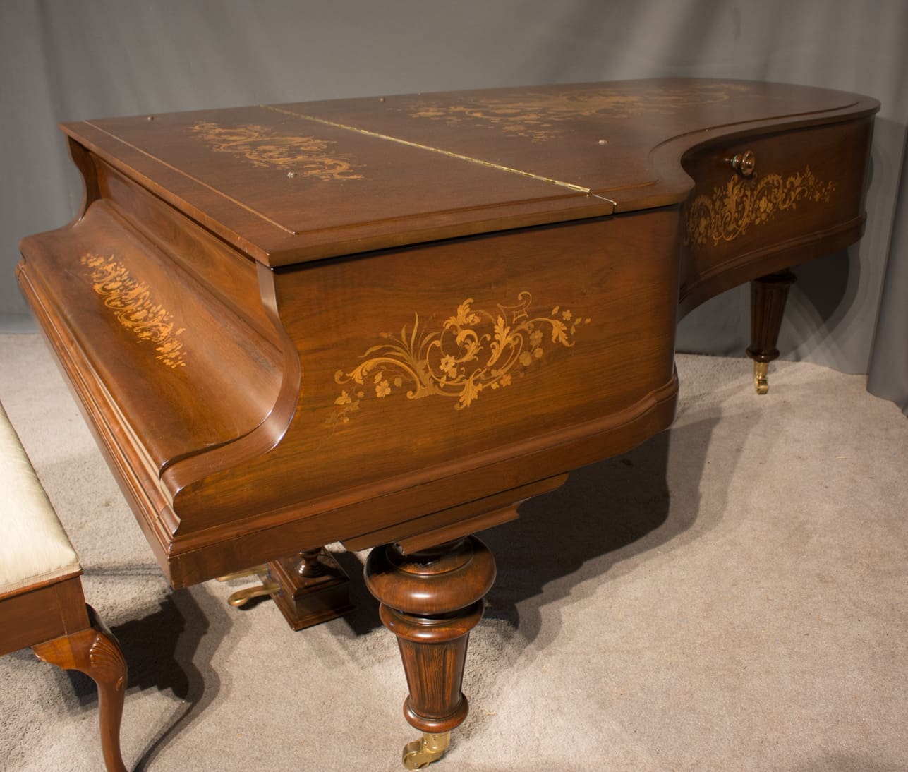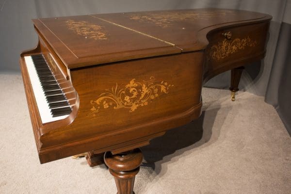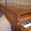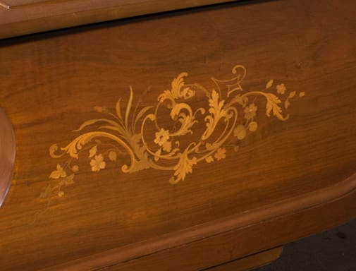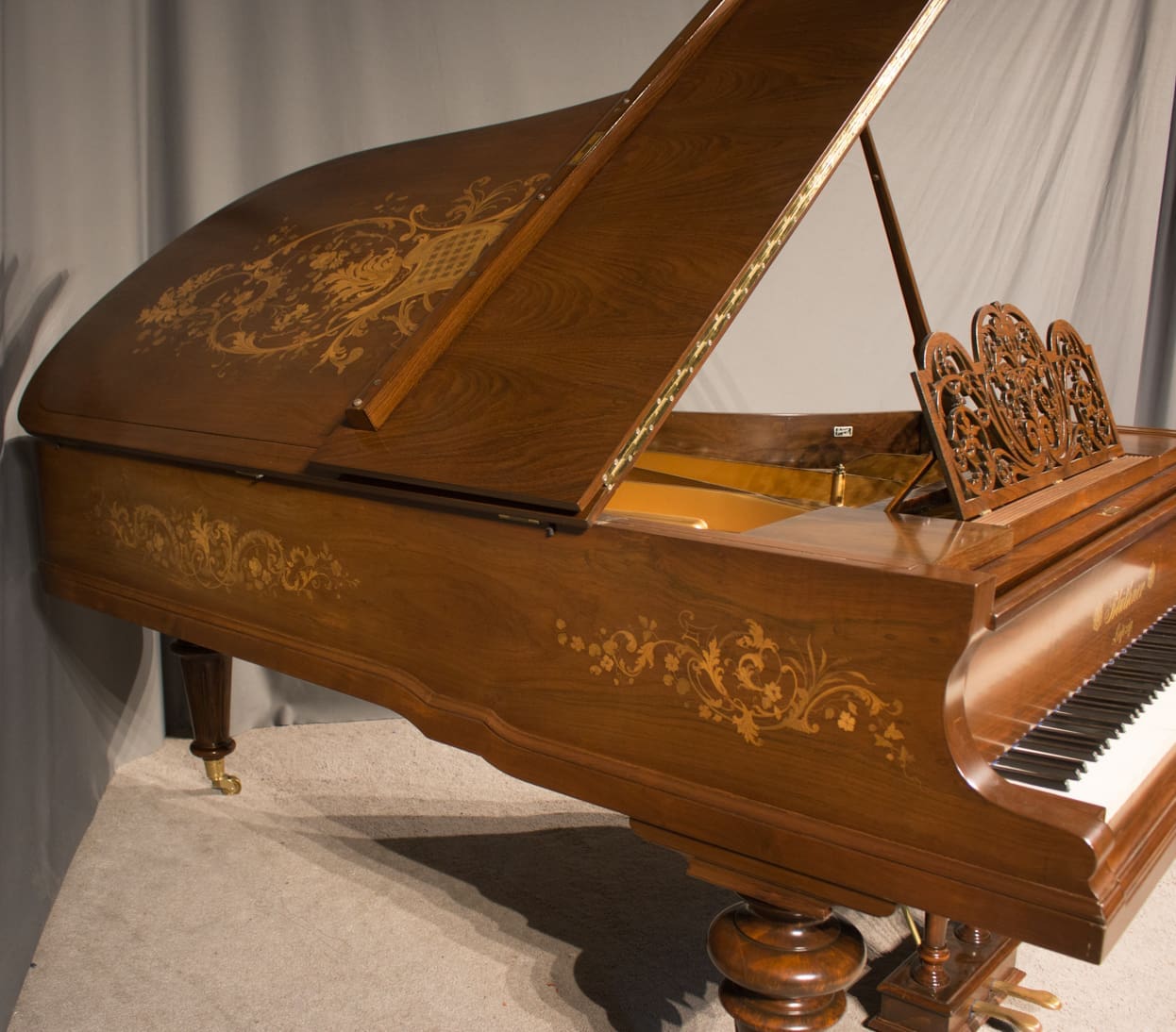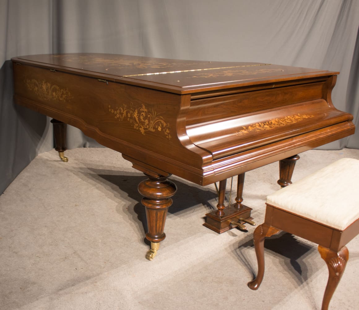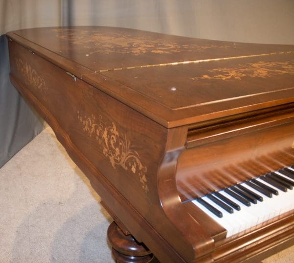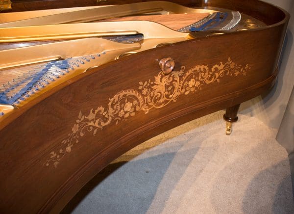 This exquisite piano is made of walnut wood with elaborate inlaid veneers. The overall appearance of the piano is truly stunning. The instrument is being restored to like-new condition, inside and out, all with a historical perspective in mind.