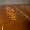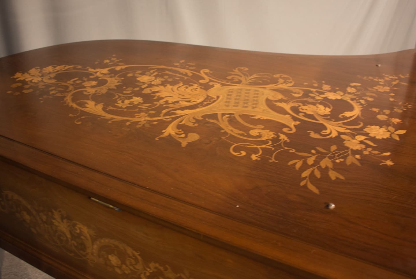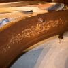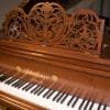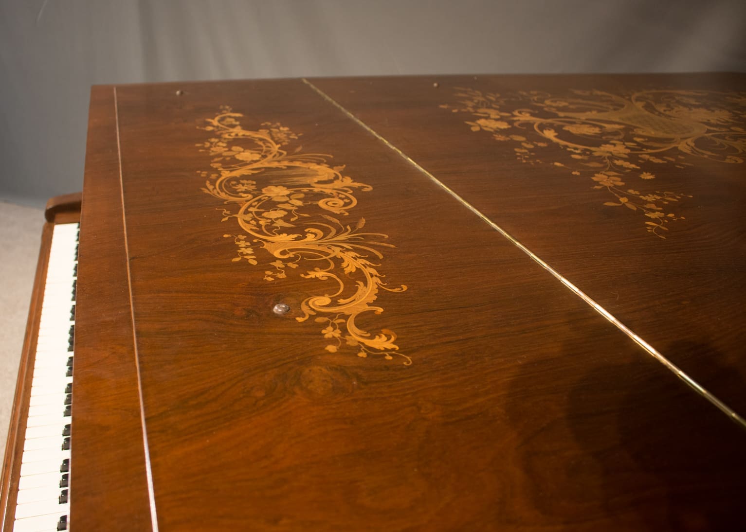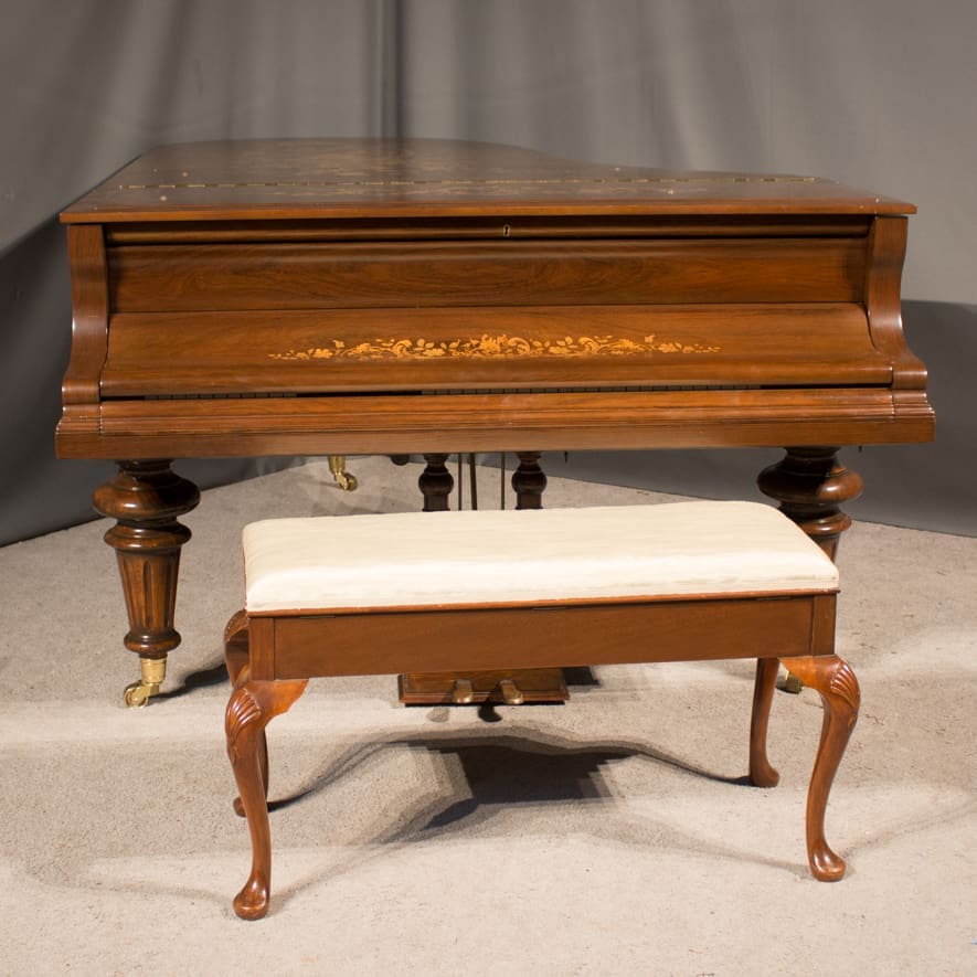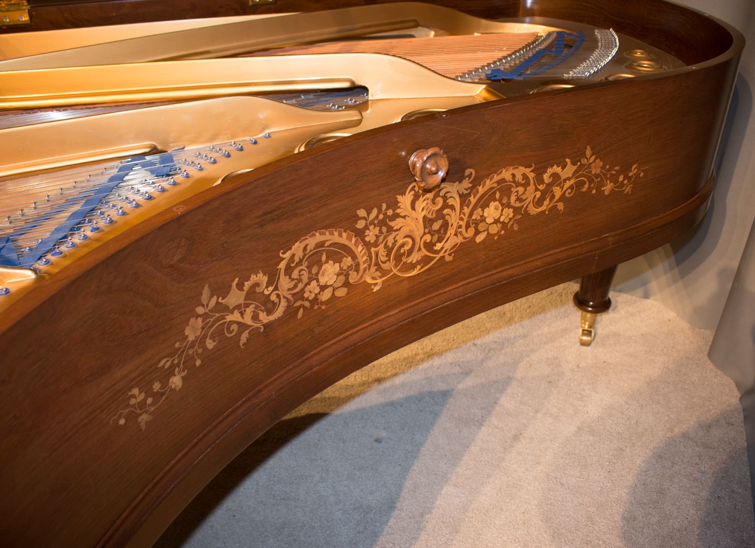 This exquisite piano is made of walnut wood with elaborate inlaid veneers. The overall appearance of the piano is truly stunning. The instrument is being restored to like-new condition, inside and out, all with a historical perspective in mind.
