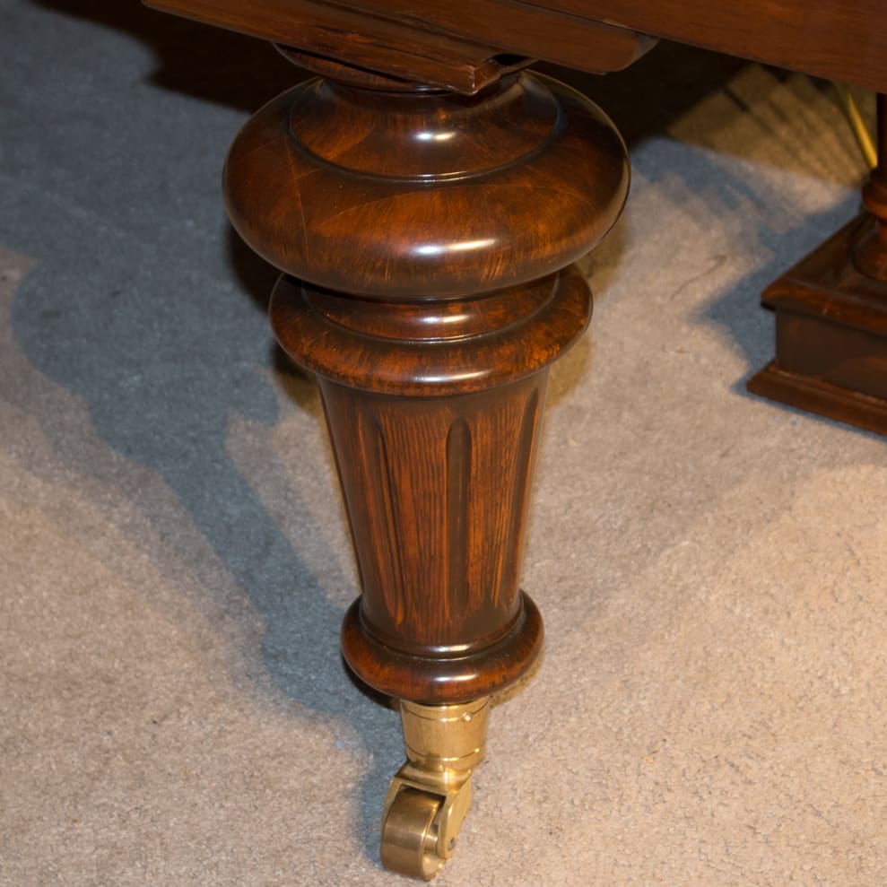 This piano is one of Bluthner’s patent “Aliquot” pianos. In 1873 Julius Bluthner introduced his patented “aliquot stringing system” which uses an additional un-dampened string in each note of the top three piano octaves. This fourth strings is not directly struck by the piano hammer, but rather vibrates sympathetically in order to create a uniquely warm, rich tonal quality.