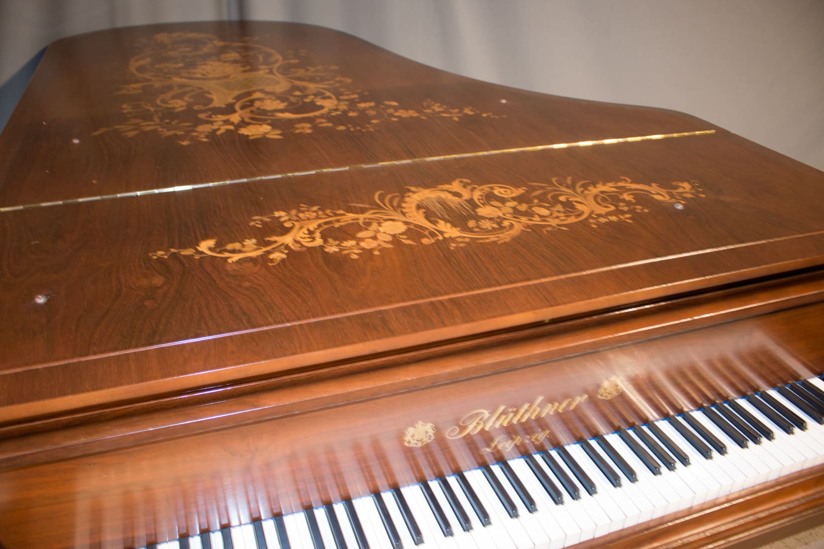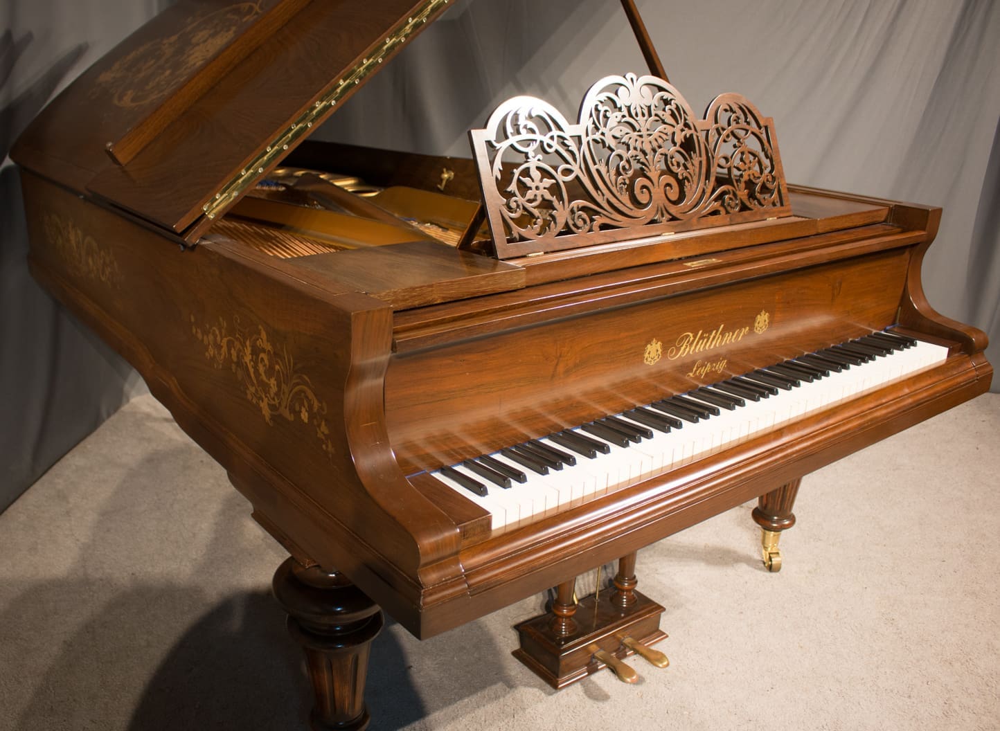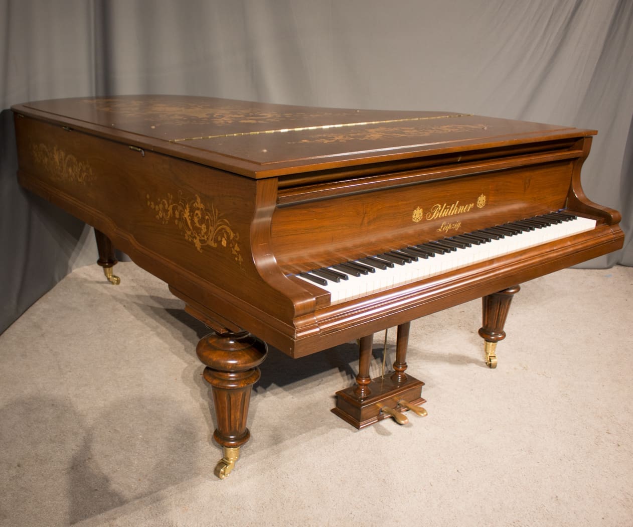 In 1892 in Leipzig, Germany, Julius Bluthner built an exceptional concert grand piano, serial number 37301. Nothing more is known of the early years of this piano because during the second World War, the Bluthner factory with all of its records was destroyed. However, because of the fine decorative inlay in the cabinet, the piano was presumably sold to nobility or to a very prosperous music lover.