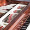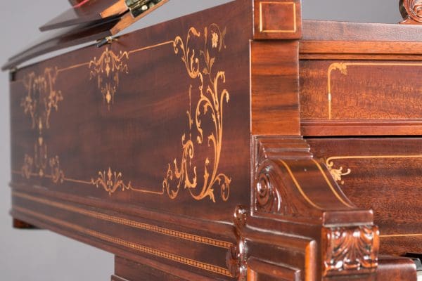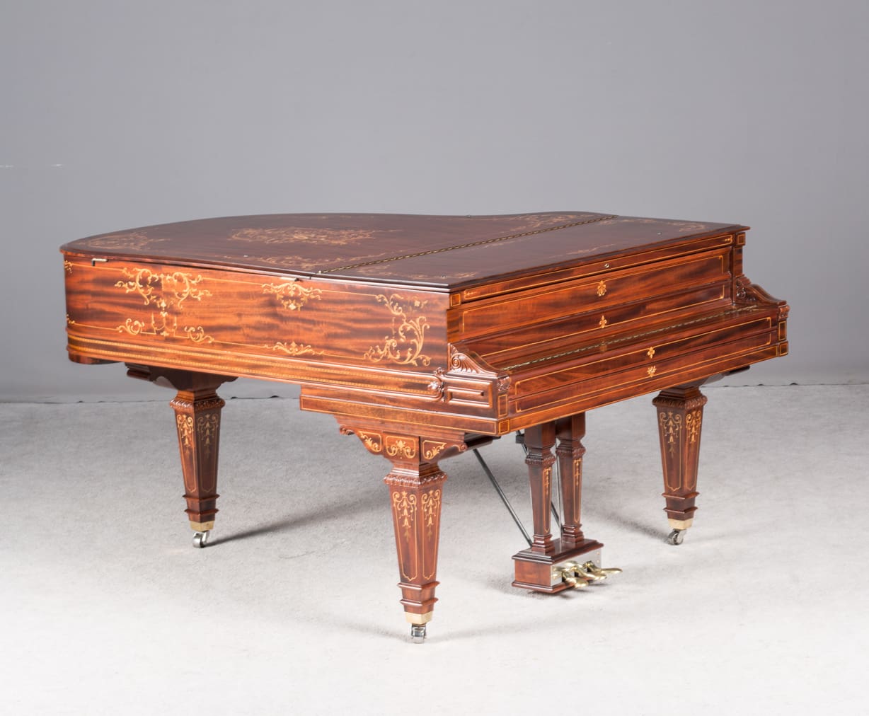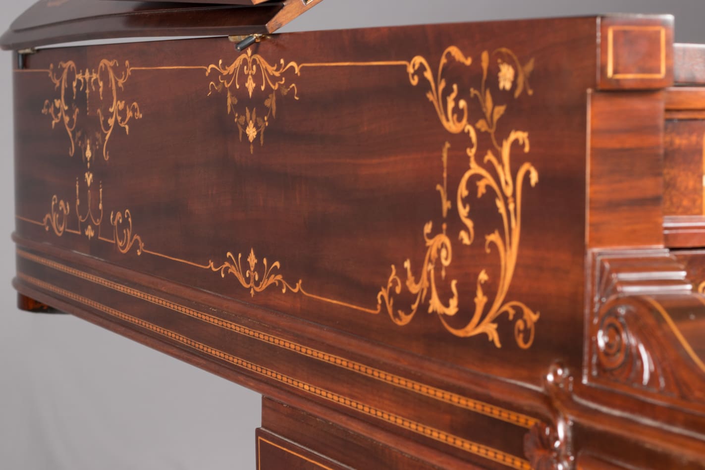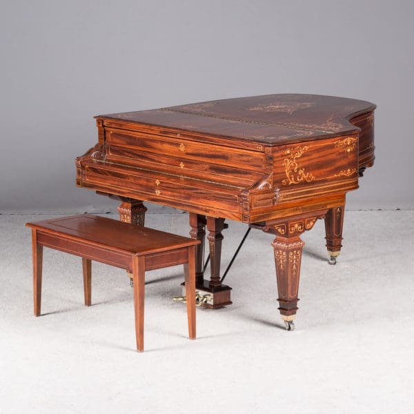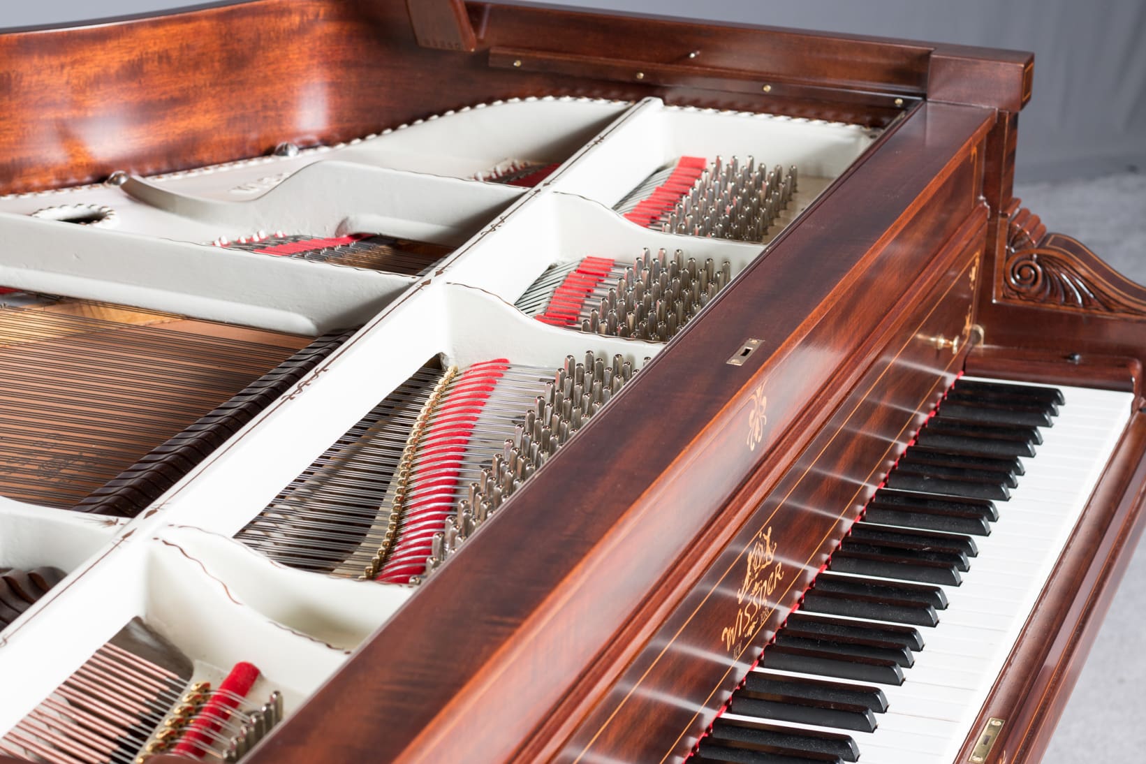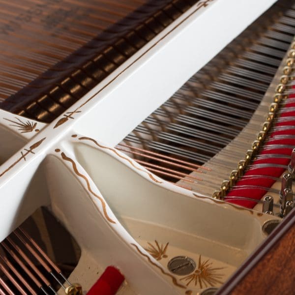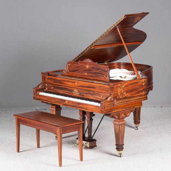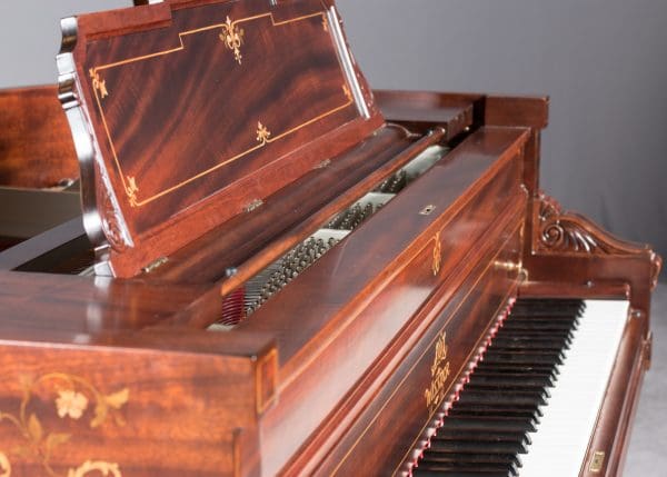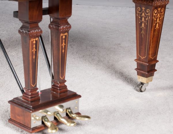 This stunning piano is one of the most beautiful pianos in our collection. The instrument is made of exotic-grain “Flame Mahogany” wood with beautifully carved legs, moldings and trim. The entire instrument is decorated with some of the most exquisite satinwood marquetry inlay we have ever seen. Although this piano is quite elaborate, it has an overall formal and elegant appearance; a perfect balance between artistic design and simplicity. Note the unusual white lacquered harp inside the piano; instead of conventional gold, the use of white lacquered harps was one of Wissner’s unique signature designs.