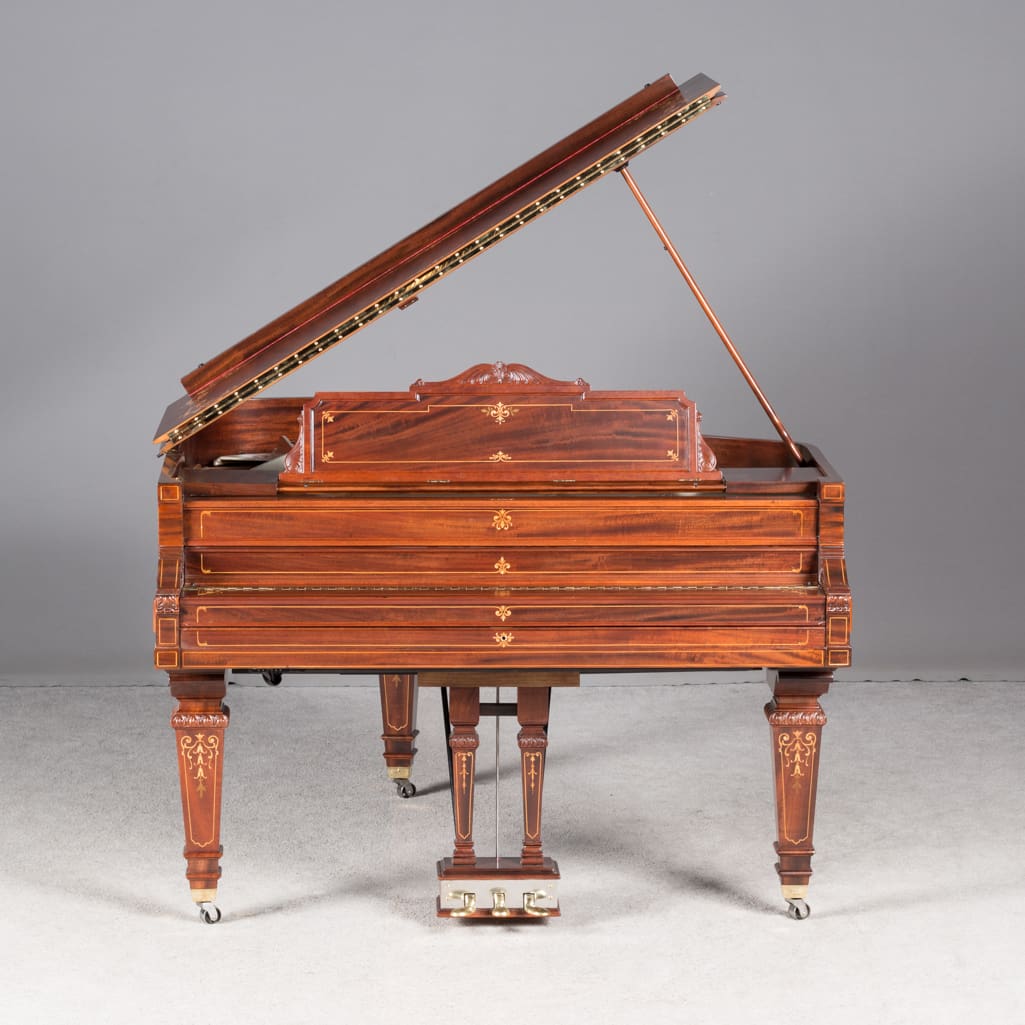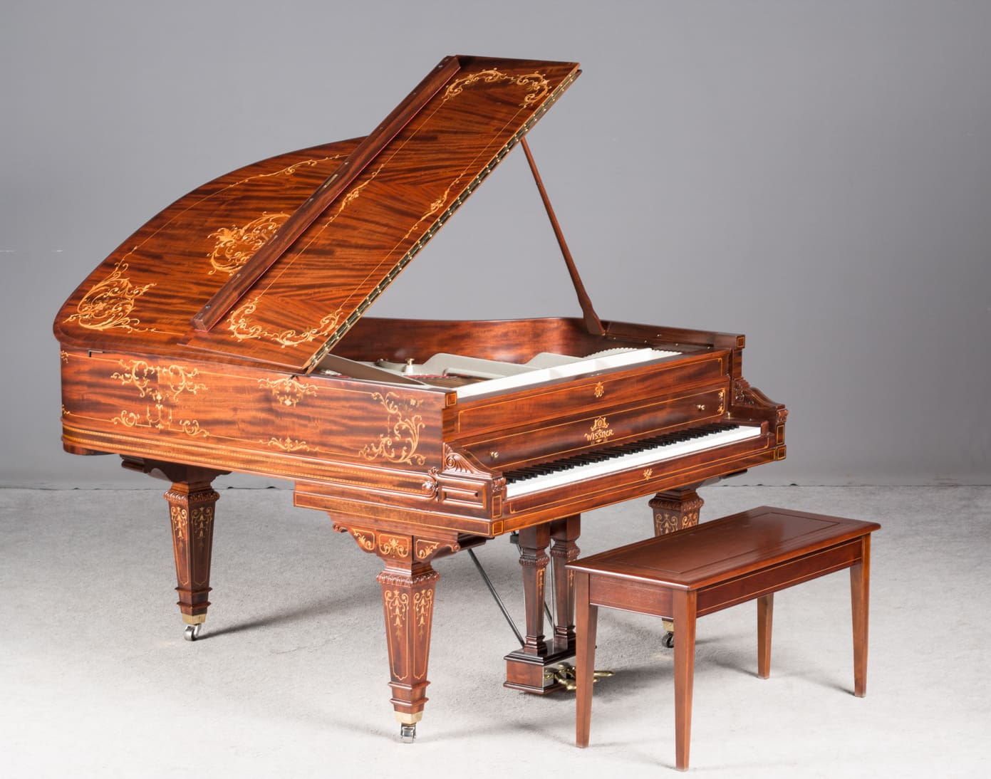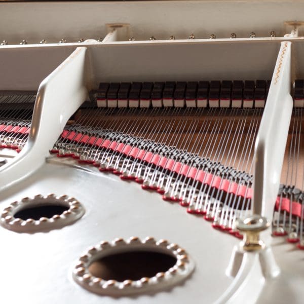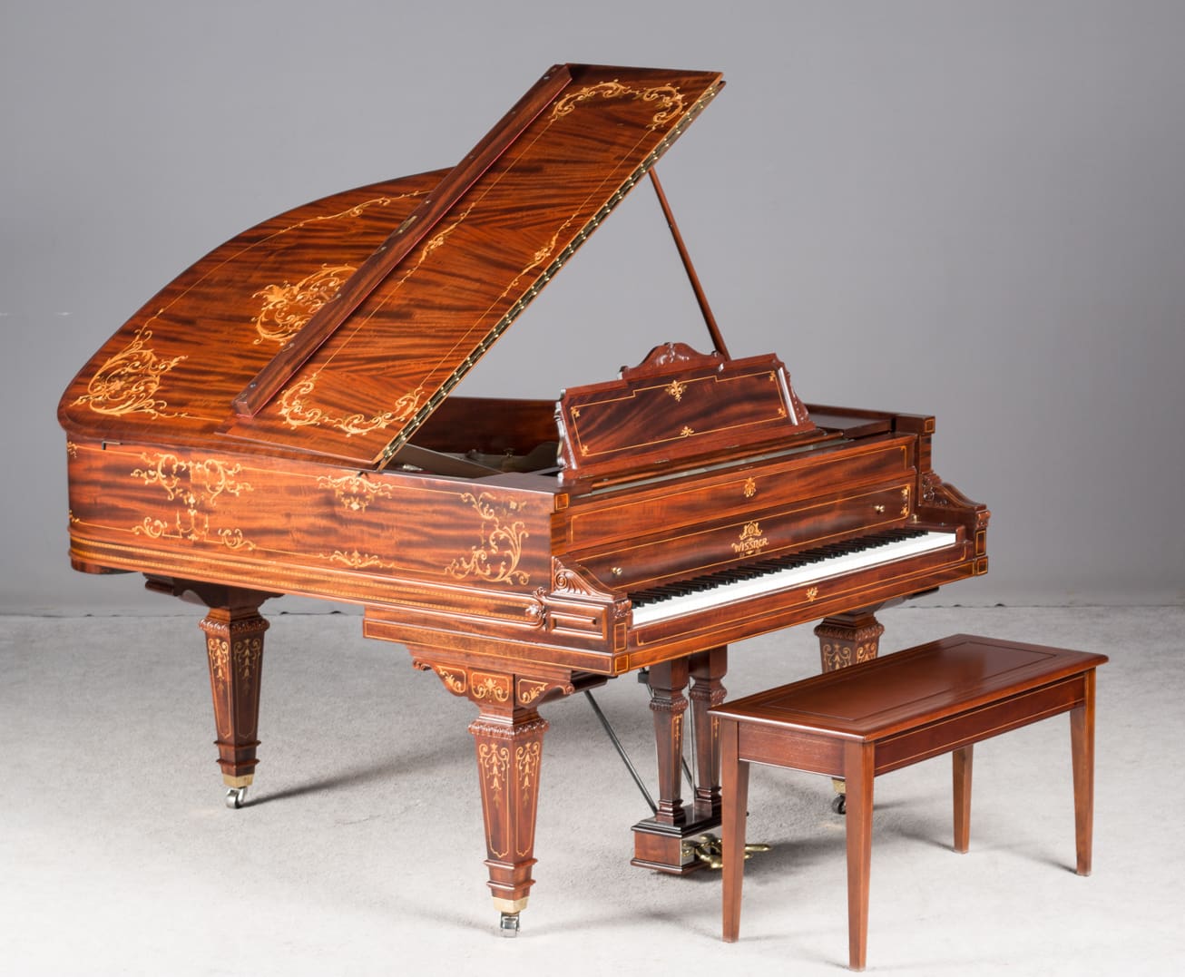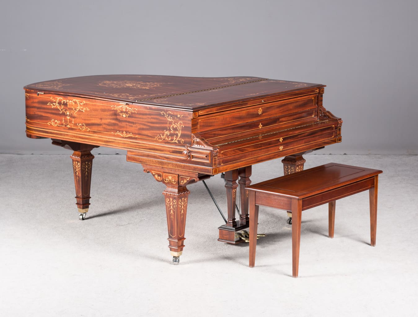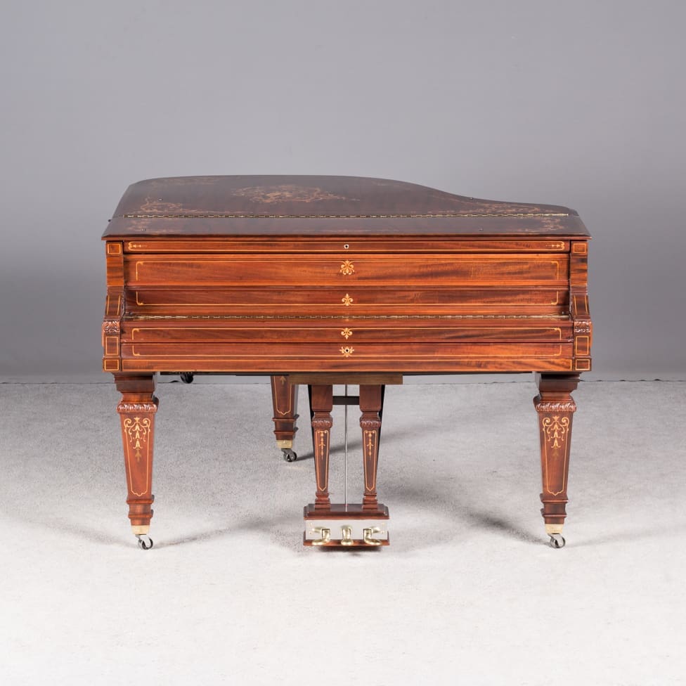 This stunning piano is one of the most beautiful pianos in our collection. The instrument is made of exotic-grain “Flame Mahogany” wood with beautifully carved legs, moldings and trim. The entire instrument is decorated with some of the most exquisite satinwood marquetry inlay we have ever seen. Although this piano is quite elaborate, it has an overall formal and elegant appearance; a perfect balance between artistic design and simplicity. Note the unusual white lacquered harp inside the piano; instead of conventional gold, the use of white lacquered harps was one of Wissner’s unique signature designs.