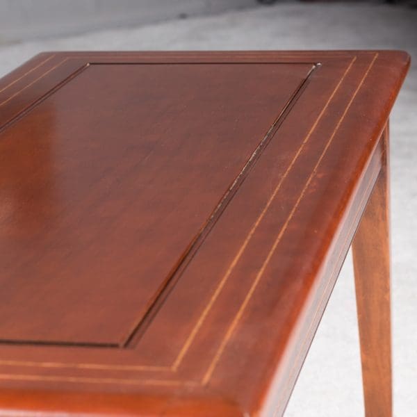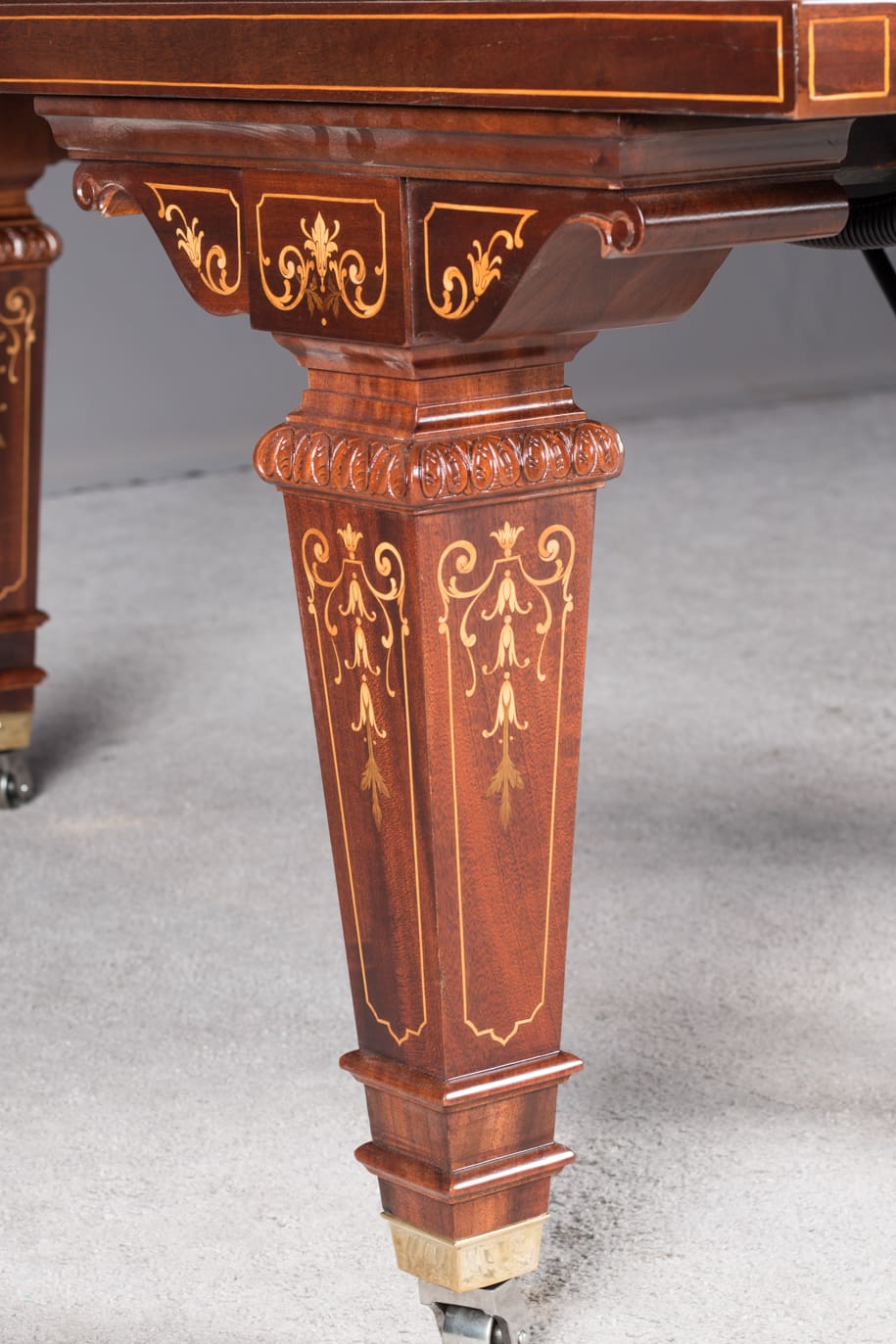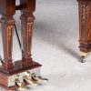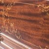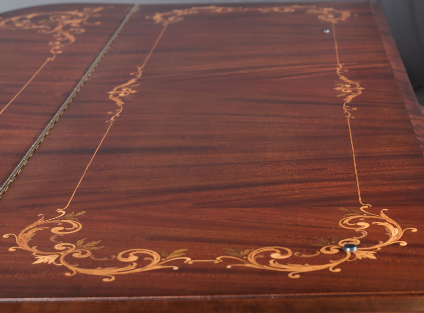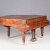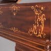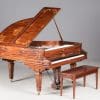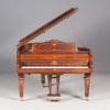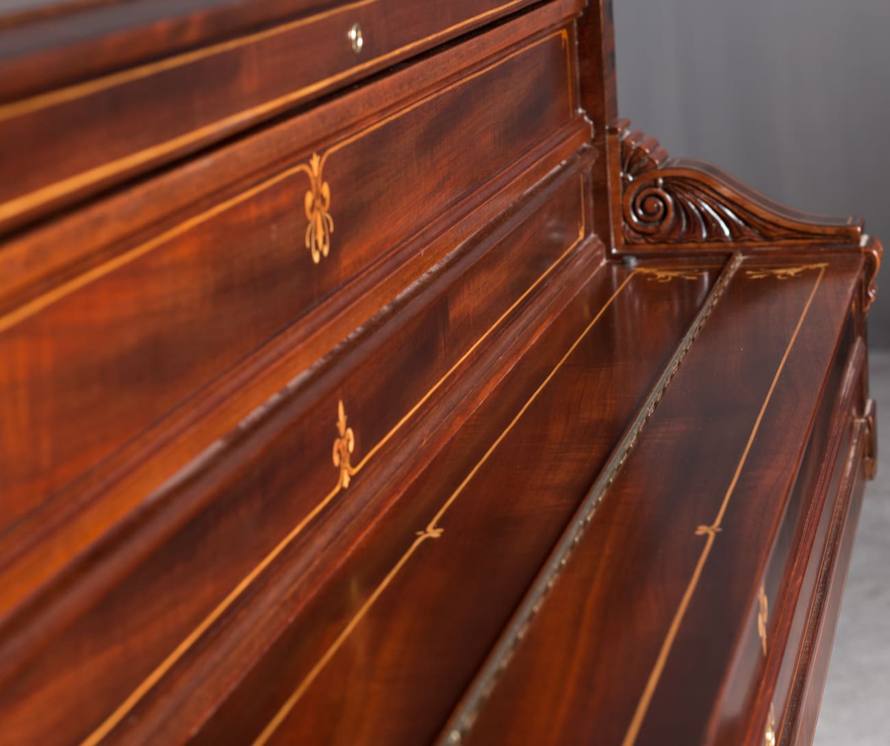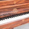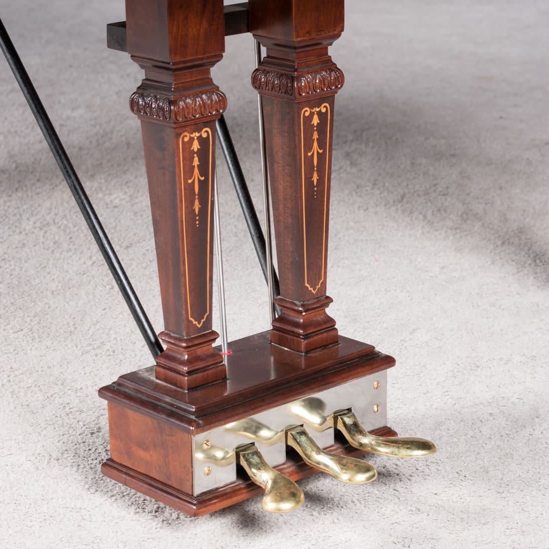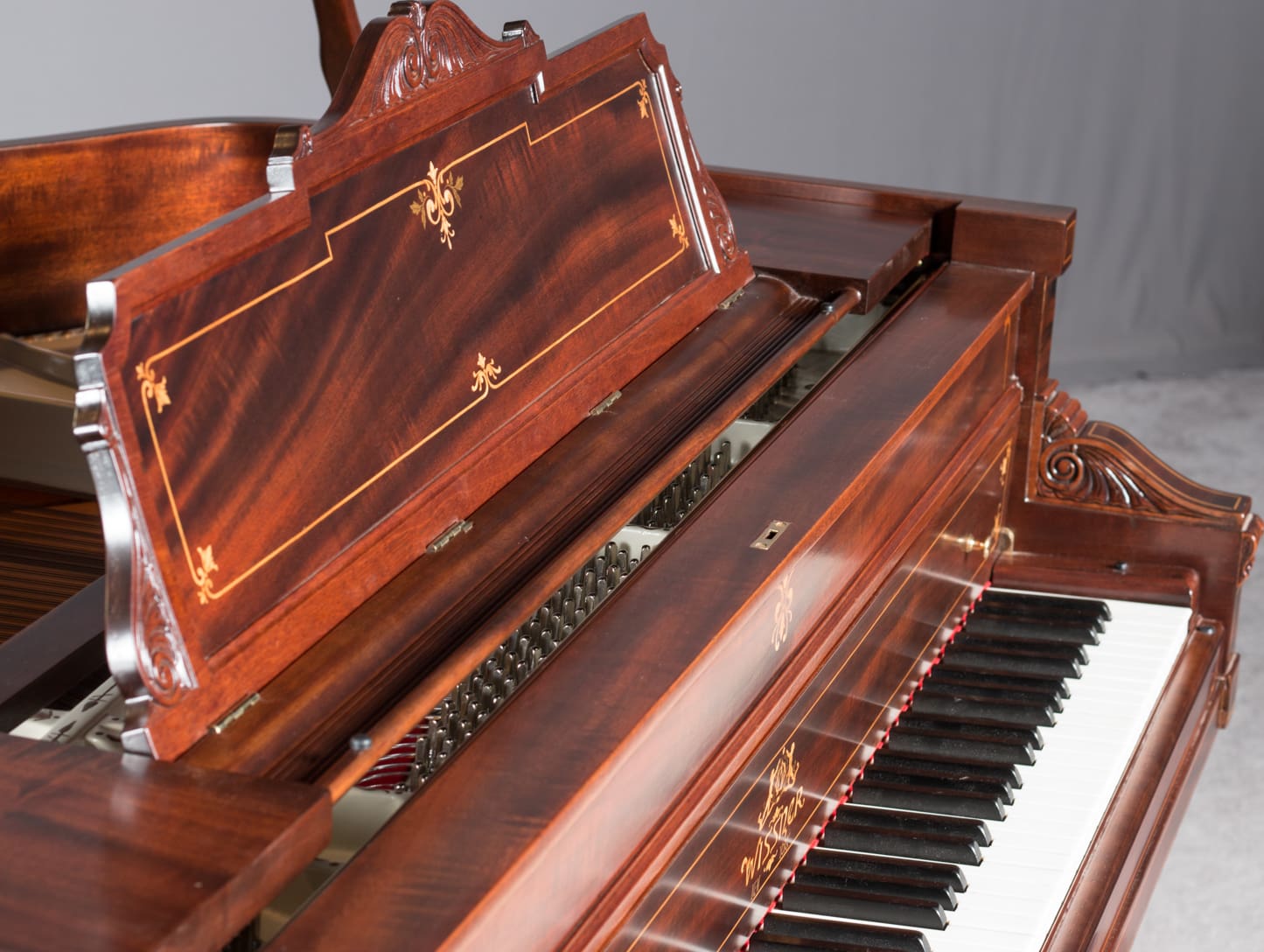 This stunning piano is one of the most beautiful pianos in our collection. The instrument is made of exotic-grain “Flame Mahogany” wood with beautifully carved legs, moldings and trim. The entire instrument is decorated with some of the most exquisite satinwood marquetry inlay we have ever seen. Although this piano is quite elaborate, it has an overall formal and elegant appearance; a perfect balance between artistic design and simplicity. Note the unusual white lacquered harp inside the piano; instead of conventional gold, the use of white lacquered harps was one of Wissner’s unique signature designs.