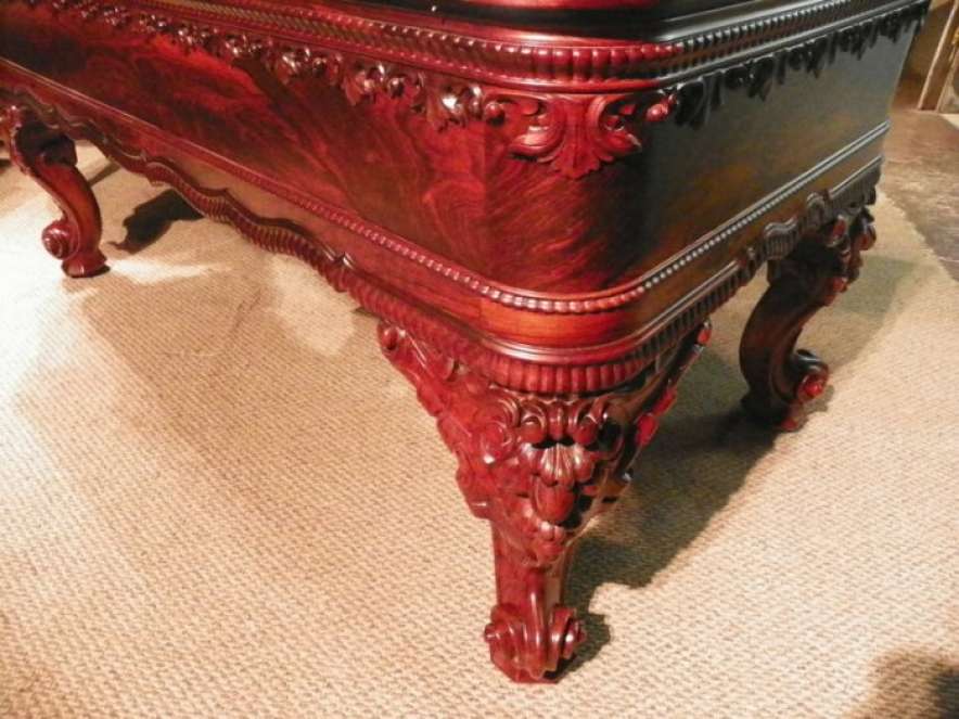 This is a beautiful Civil War era square grand piano built by the prestigious F. C. Lighte Piano Company. This piano is made of beautifully carved Rosewood, and is in the Rococo Revival style. Note the amazing hand carved cabinet – the square pianos with this level of ornamentation were among the most expensive, highest grade square pianos available at that time often selling for as much as a small house! This piano is truly stunning, and is an important part of America’s musical history. This piano has been restored to like-new condition.